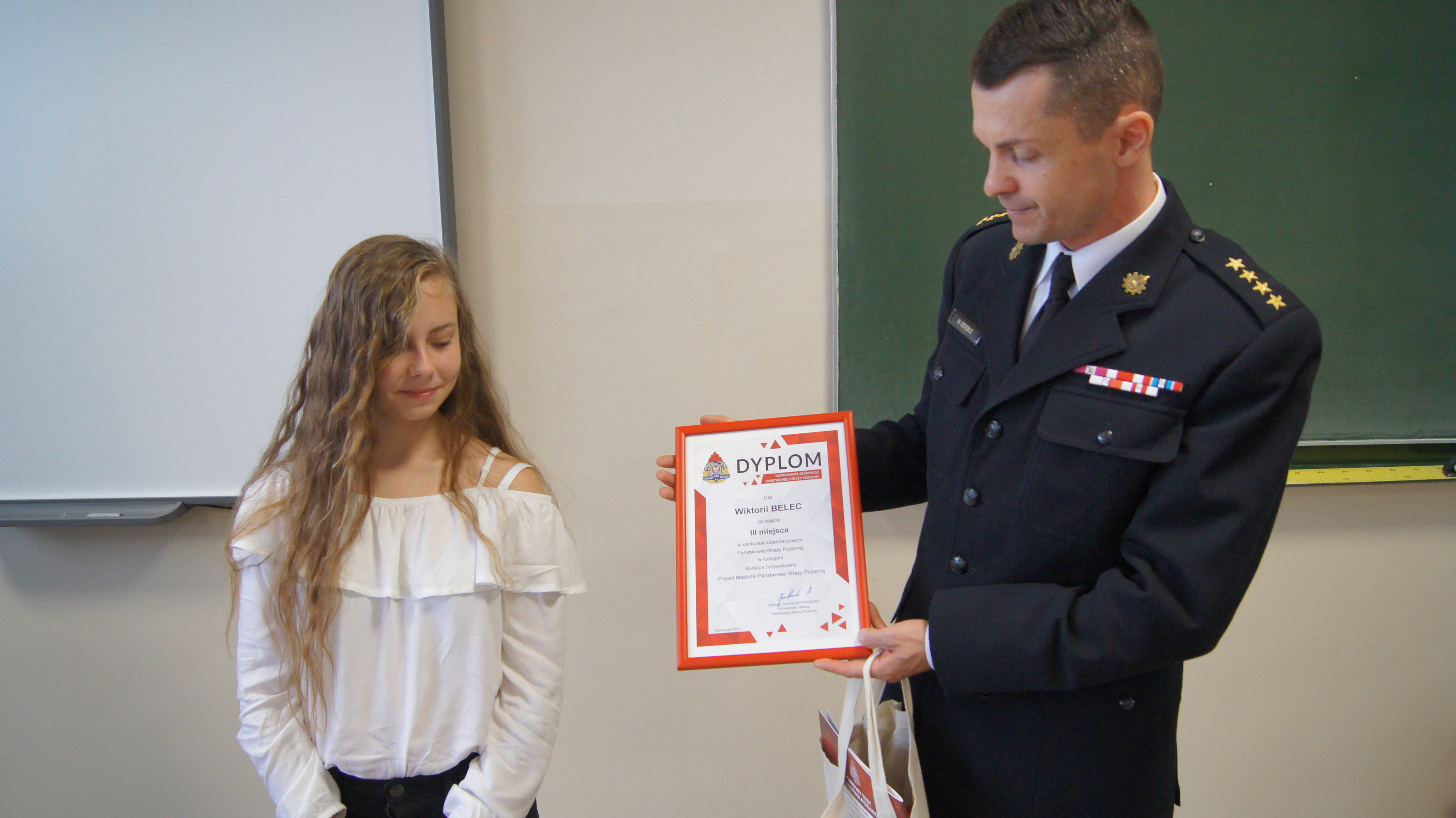 1 września 2021 roku podczas inauguracji roku szkolnego 2021/2022 odbyło się uroczyste wręczenie Dyplomu Komendanta Głównego Państwowej Straży Pożarnej oraz nagród rzeczowych dla Wiktorii Belec - uczennicy Samorządowej Szkoły Podstawowej nr 3 im. Jana Pawła II w Kazimierzy Wielkiej. Wiktoria wzięła udział w konkursie Projekt na maskotkę Państwowej Straży Pożarnej. Wykazując się pracowitością i sporą wyobraźnią twórczą zaprojektowała maskotkę, dzięki której uplasowała się na podium w konkursie kalendarzowym 2021 organizowanym przez Państwową Straż Pożarną.
