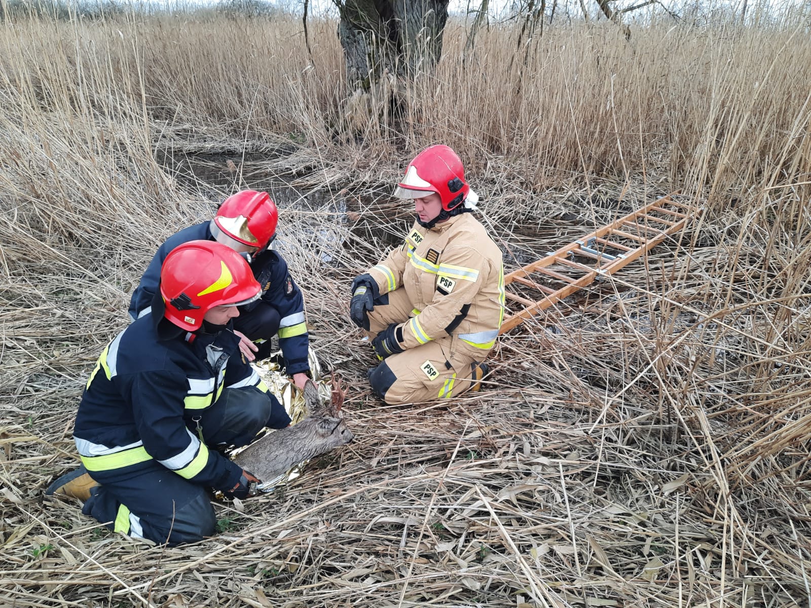 Po dojeździe na miejsce zdarzenia kierujący działaniem ratowniczym (KDR) po przeprowadzeniu rozpoznania ustalił, że sarna uwięziona jest w rowie melioracyjnym i nie może o własnych siłach wydostać się z niego. Podjęto działania zmierzające do ewakuacji zwierzęcia przy pomocy drabiny nasadkowej. Po wydobyciu sarny zapewniono jej komfort termiczny przy pomocy folii termoizolacyjnej do czasu przyjazdu i przekazania zwierzęcia członkom Koła Łowieckiego „Diana” w Kazimierzy Wielkiej.