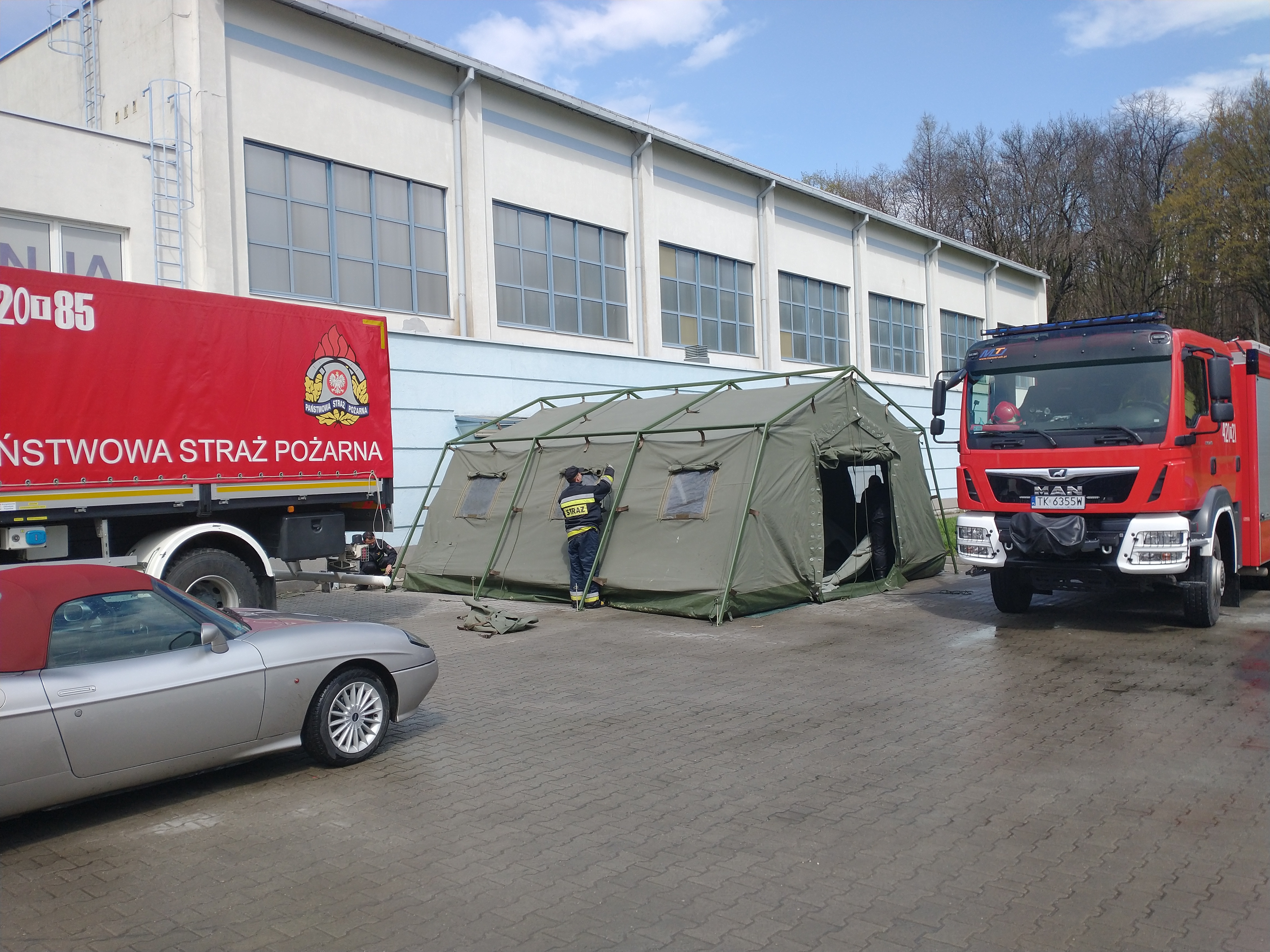 W dniu 20 kwietnia 2021 roku kazimierscy strażacy zaangażowani zostali do rozstawienia namiotu przy budynku Hali Sportowej w Kazimierzy Wielkiej. W uzgodnieniu ze Starostą Powiatu Kazimierskiego namiot został przewieziony i ustawiony w miejscu wskazanym przez Kierownika Kazimierskiego Ośrodka Sportowego. Namiot posłuży jako przedłużenie ciągu komunikacyjnego, w którym odbywać się będzie segregacja wstępna osób udających się na szczepienie. Działania strażaków wpisują się również w akcje przyspieszenia programu szczepień.