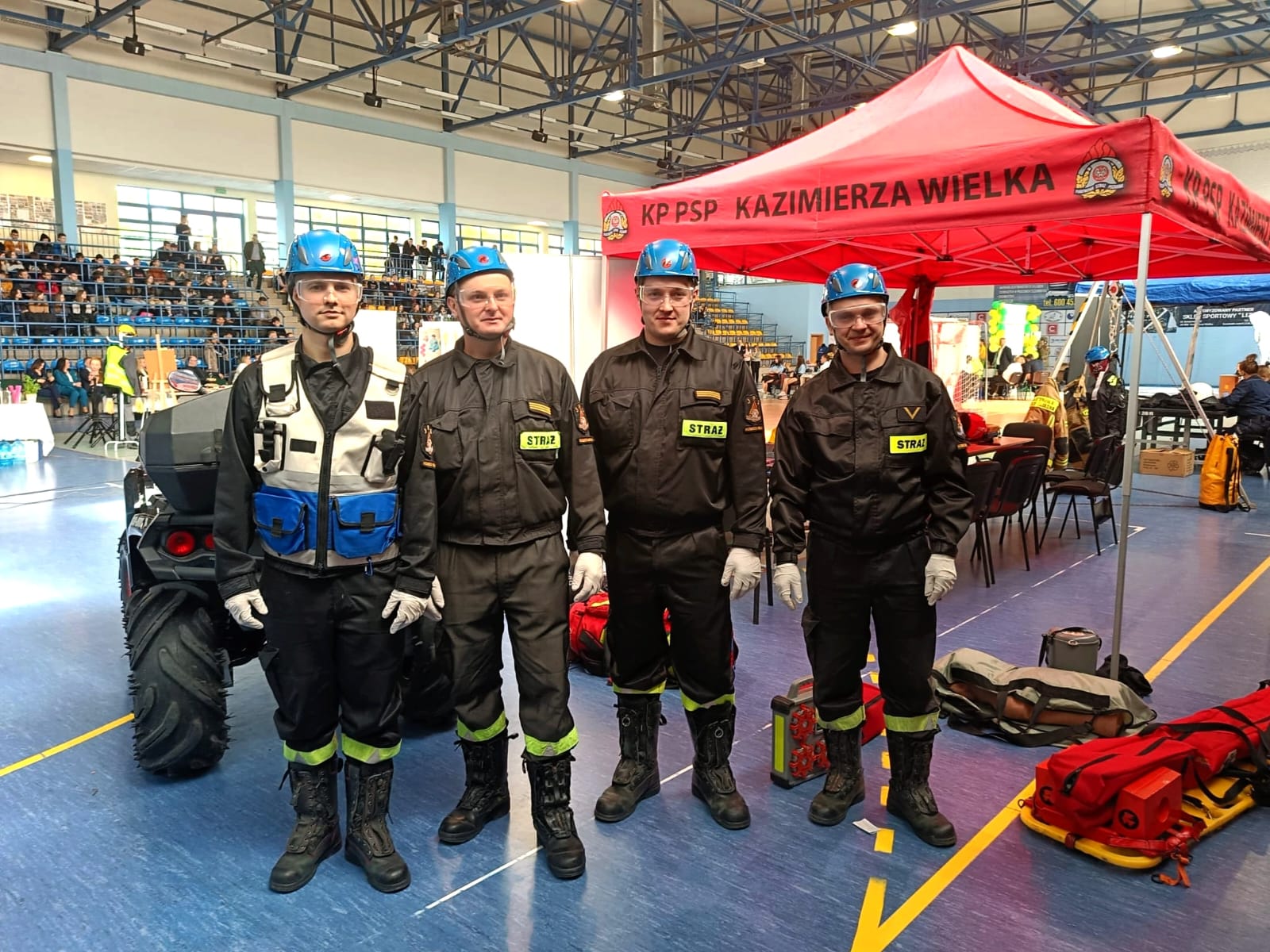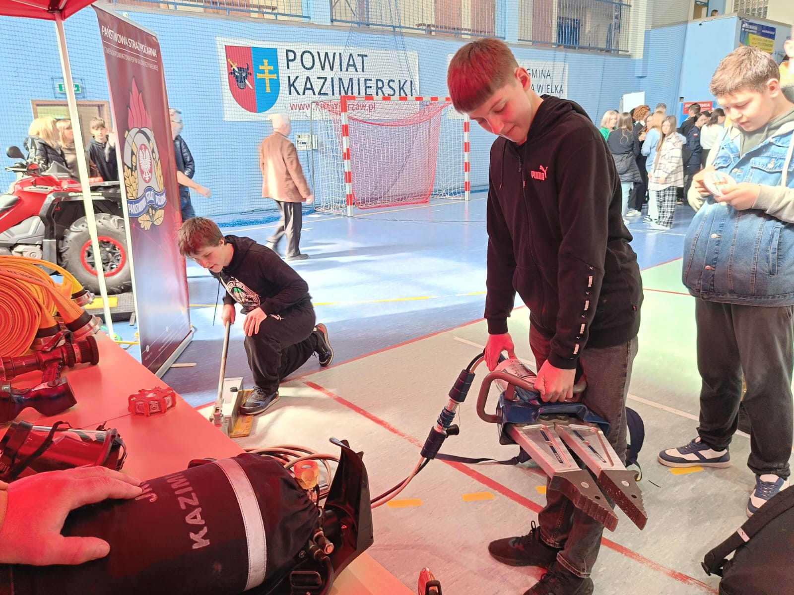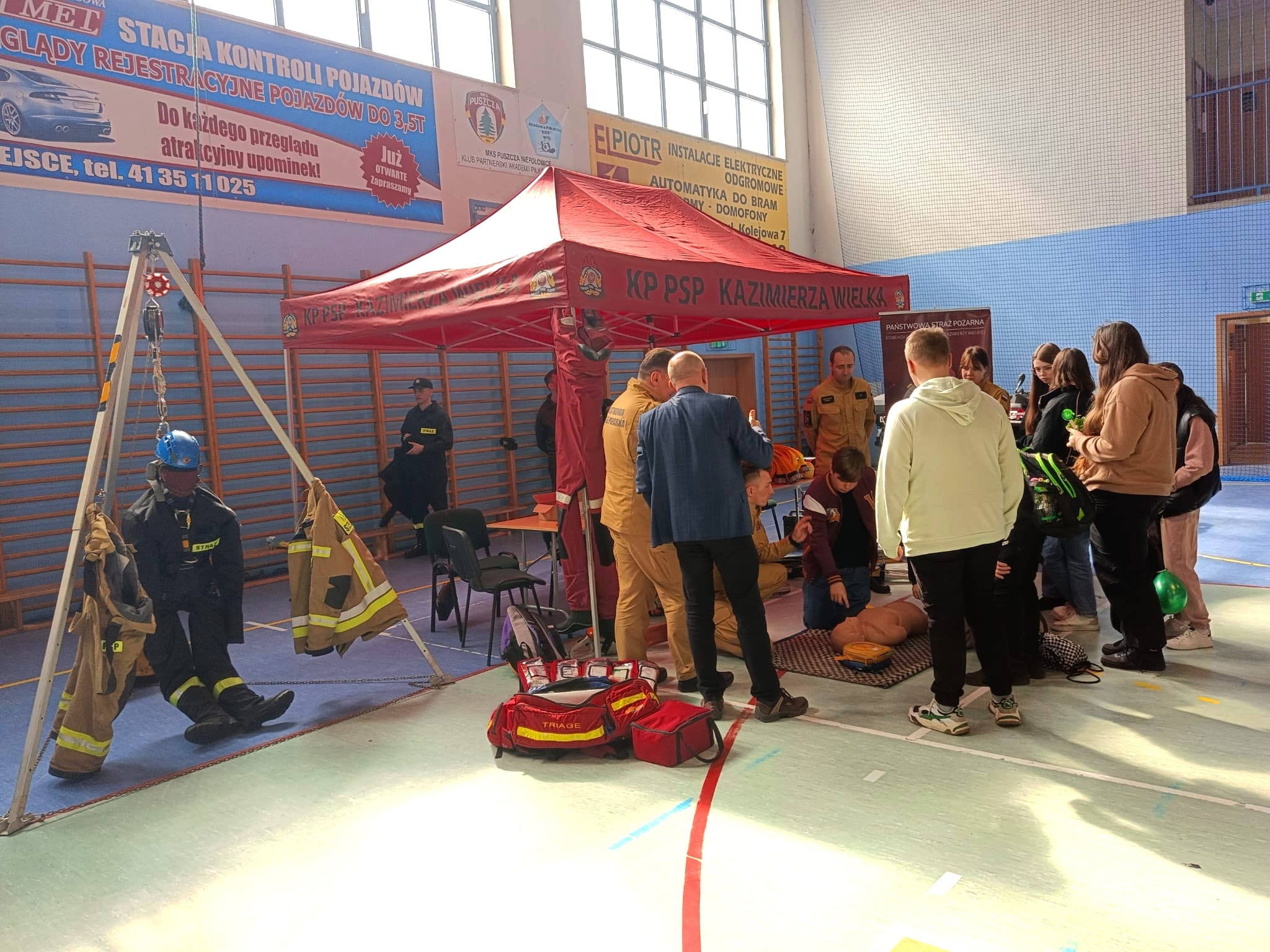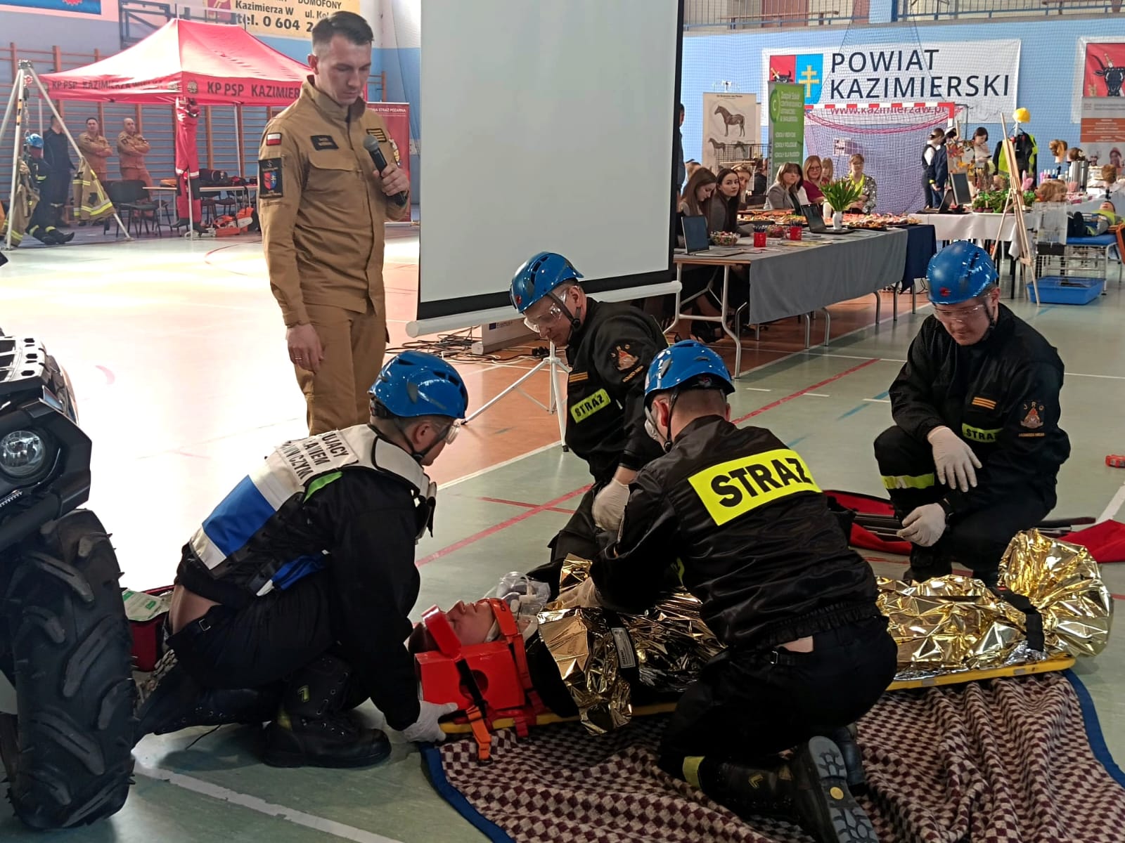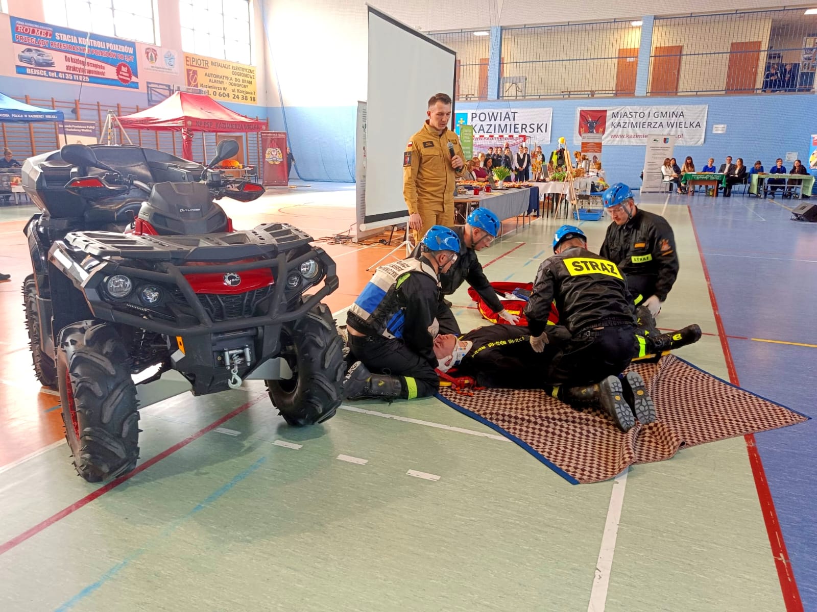 22 marca 2024 roku na Hali Kazimierskiego Ośrodka Sportowego w Kazimierzy Wielkiej odbyła się w ramach Świętokrzyskiej Giełdy Szkół Ponadpodstawowych – Kazimierska Giełda Szkół Ponadpodstawowych promująca szkoły średnie działające na terenie powiatu kazimierskiego. Inicjatorem przedsięwzięcia było Kuratorium Oświaty w Kielcach. W wydarzeniu udział wzięli Komendant Powiatowy PSP w Kazimierzy Wielkiej st. kpt. Marcin Oziębło wraz ze swoim zastępcą bryg. Krzysztofem Jachem oraz strażacy zmiany służbowej i pracownicy systemu ośmiogodzinnego tutejszej komendy. Obsługiwali oni stoisko, które promowało zawód strażaka. Na stoisku promocyjnym zaprezentowany został sprzęt i wyposażenie, którym dysponują strażacy podczas działań ratowniczo – gaśniczych. Młodzież mogła również porozmawiać o zawodzie i pracy strażaka w Jednostce Ratowniczo – Gaśniczej oraz o wymaganiach jakie trzeba spełnić przy naborze do służby. Największe zainteresowanie wzbudził strażacki quad Can-Am, sprzęt ochrony układu oddechowego, kamera termowizyjna oraz narzędzia hydrauliczne. Wszystko to można było zobaczyć z bliska. Dodatkowo w przerwie między występami artystycznymi promujących się szkół ponadpodstawowych strażacy zmiany służbowej zaprezentowali pokaz kwalifikowanej pierwszej pomocy – symulowany wypadek osoby jadącej quadem.