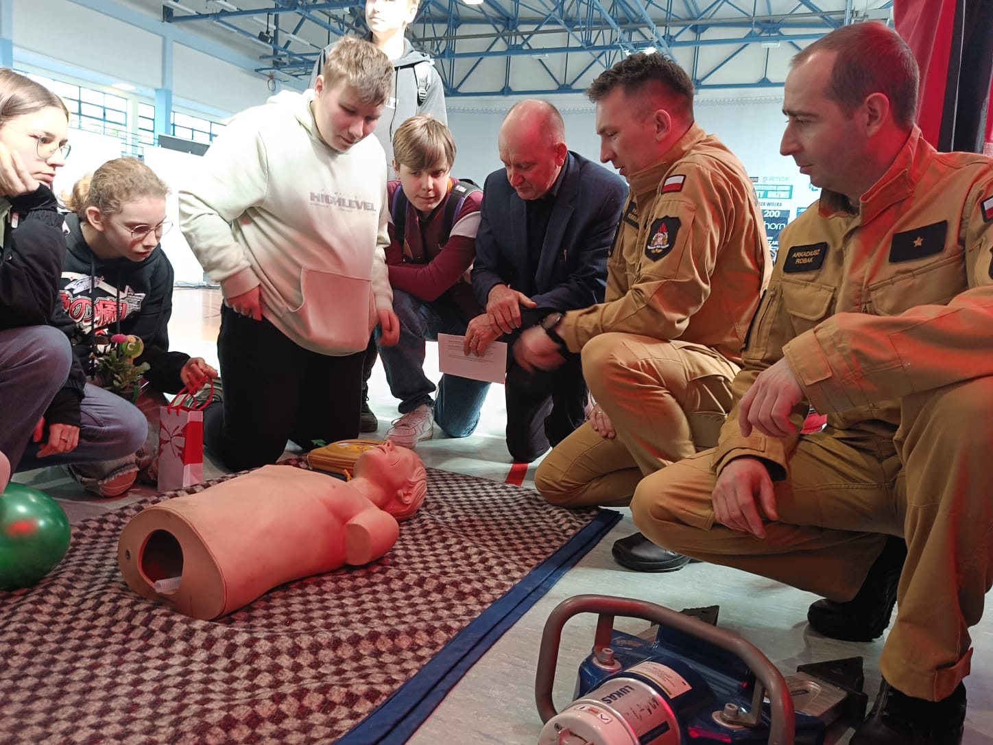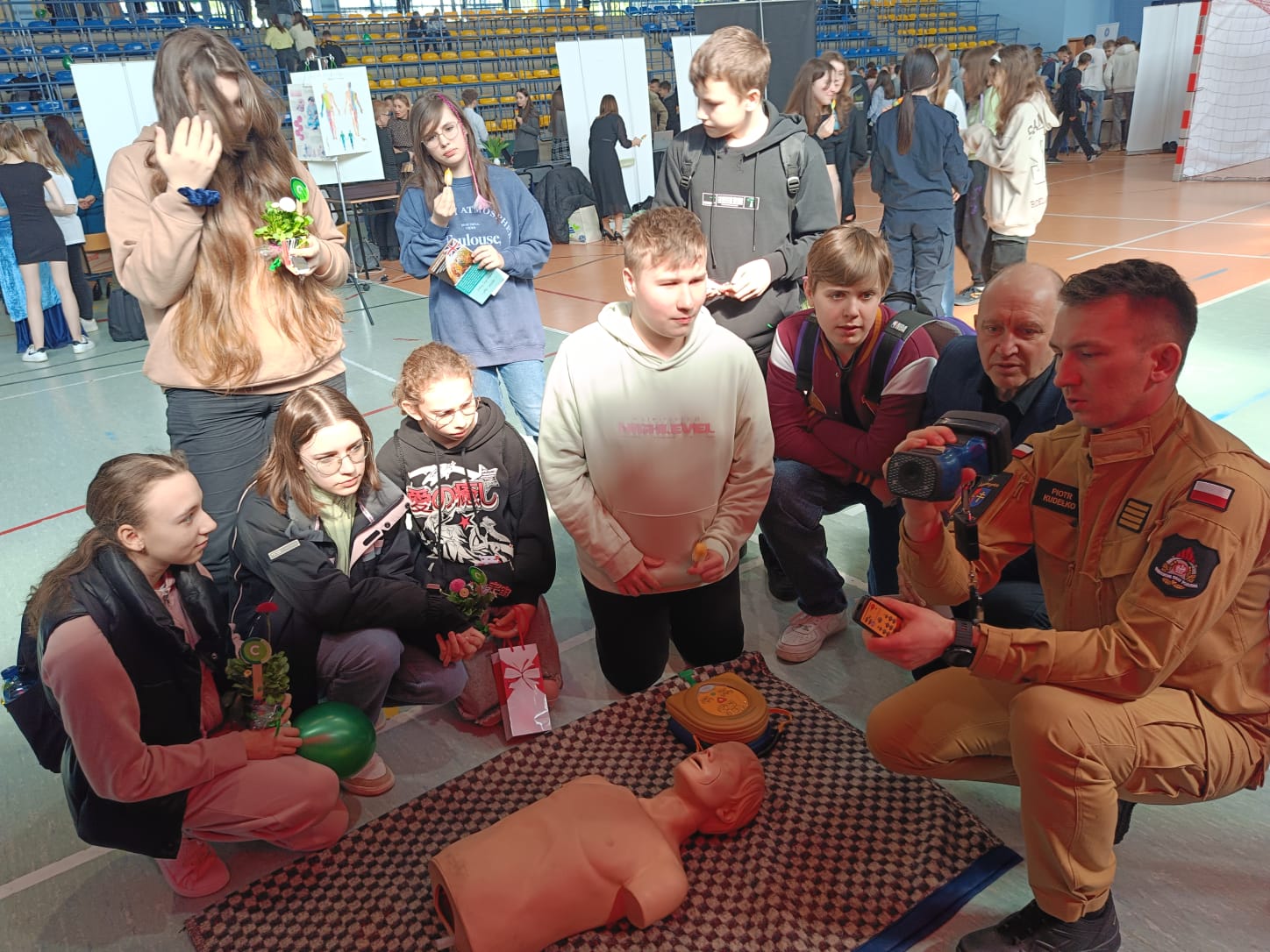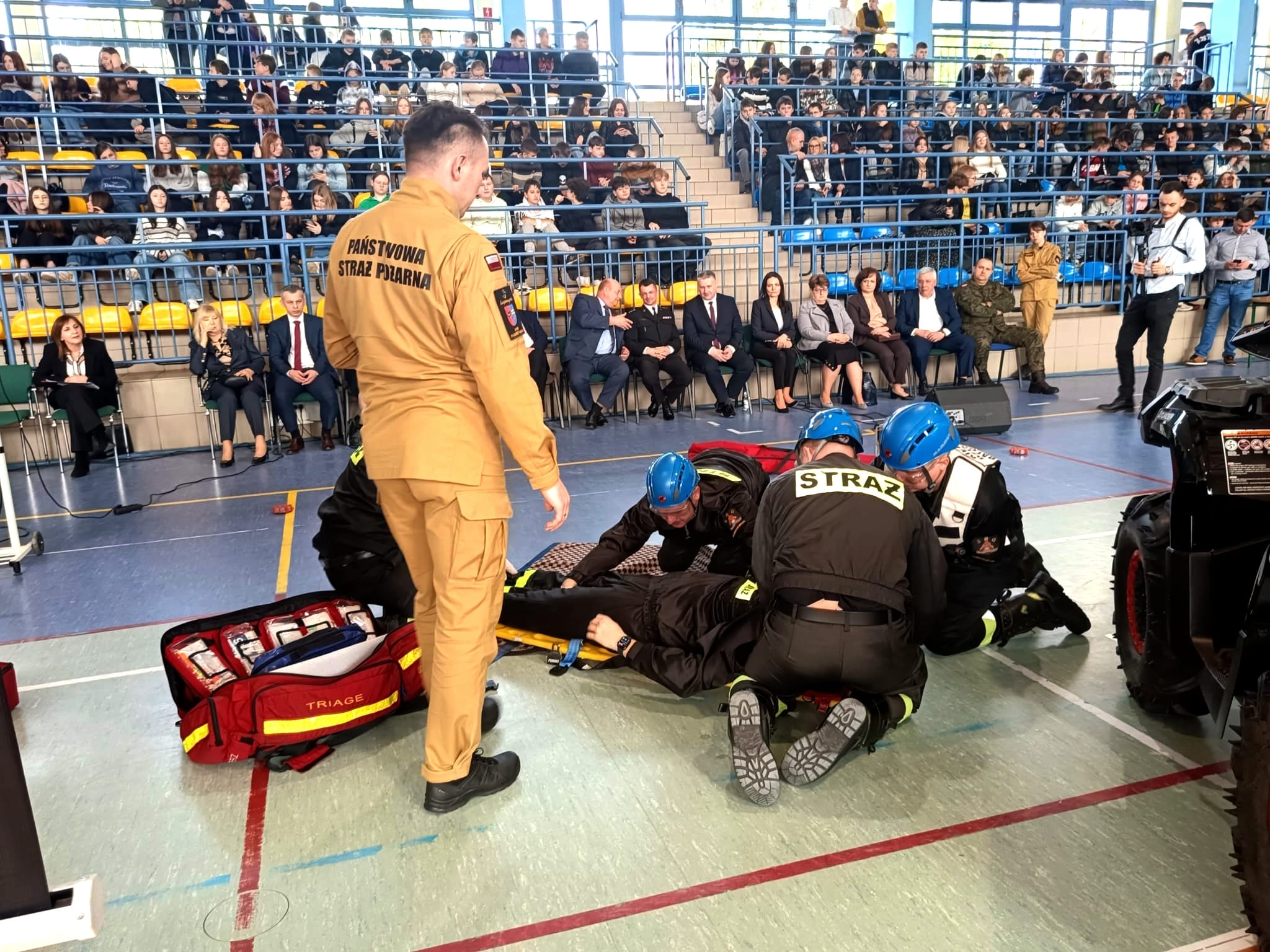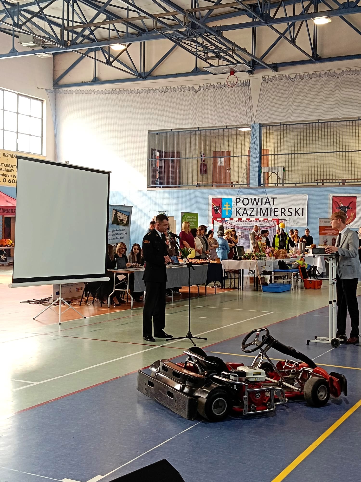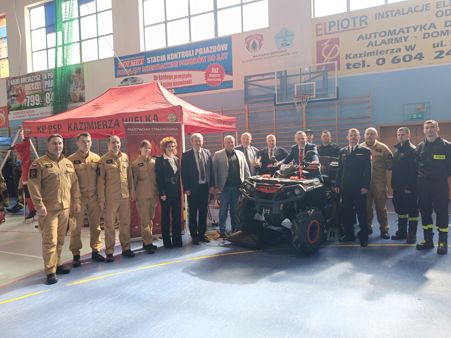 22 marca 2024 roku na Hali Kazimierskiego Ośrodka Sportowego w Kazimierzy Wielkiej odbyła się w ramach Świętokrzyskiej Giełdy Szkół Ponadpodstawowych – Kazimierska Giełda Szkół Ponadpodstawowych promująca szkoły średnie działające na terenie powiatu kazimierskiego. Inicjatorem przedsięwzięcia było Kuratorium Oświaty w Kielcach. W wydarzeniu udział wzięli Komendant Powiatowy PSP w Kazimierzy Wielkiej st. kpt. Marcin Oziębło wraz ze swoim zastępcą bryg. Krzysztofem Jachem oraz strażacy zmiany służbowej i pracownicy systemu ośmiogodzinnego tutejszej komendy. Obsługiwali oni stoisko, które promowało zawód strażaka. Na stoisku promocyjnym zaprezentowany został sprzęt i wyposażenie, którym dysponują strażacy podczas działań ratowniczo – gaśniczych. Młodzież mogła również porozmawiać o zawodzie i pracy strażaka w Jednostce Ratowniczo – Gaśniczej oraz o wymaganiach jakie trzeba spełnić przy naborze do służby. Największe zainteresowanie wzbudził strażacki quad Can-Am, sprzęt ochrony układu oddechowego, kamera termowizyjna oraz narzędzia hydrauliczne. Wszystko to można było zobaczyć z bliska. Dodatkowo w przerwie między występami artystycznymi promujących się szkół ponadpodstawowych strażacy zmiany służbowej zaprezentowali pokaz kwalifikowanej pierwszej pomocy – symulowany wypadek osoby jadącej quadem.