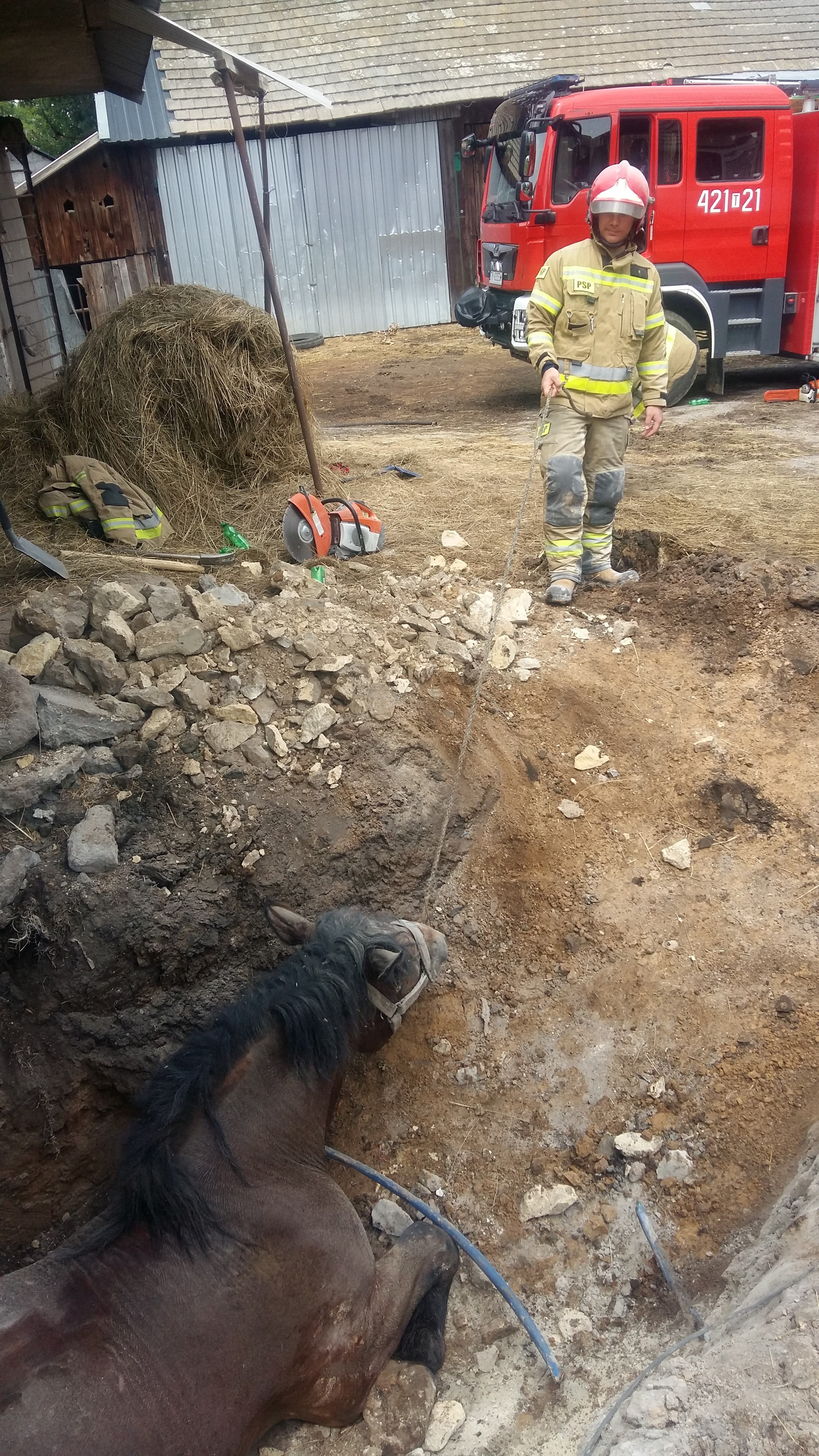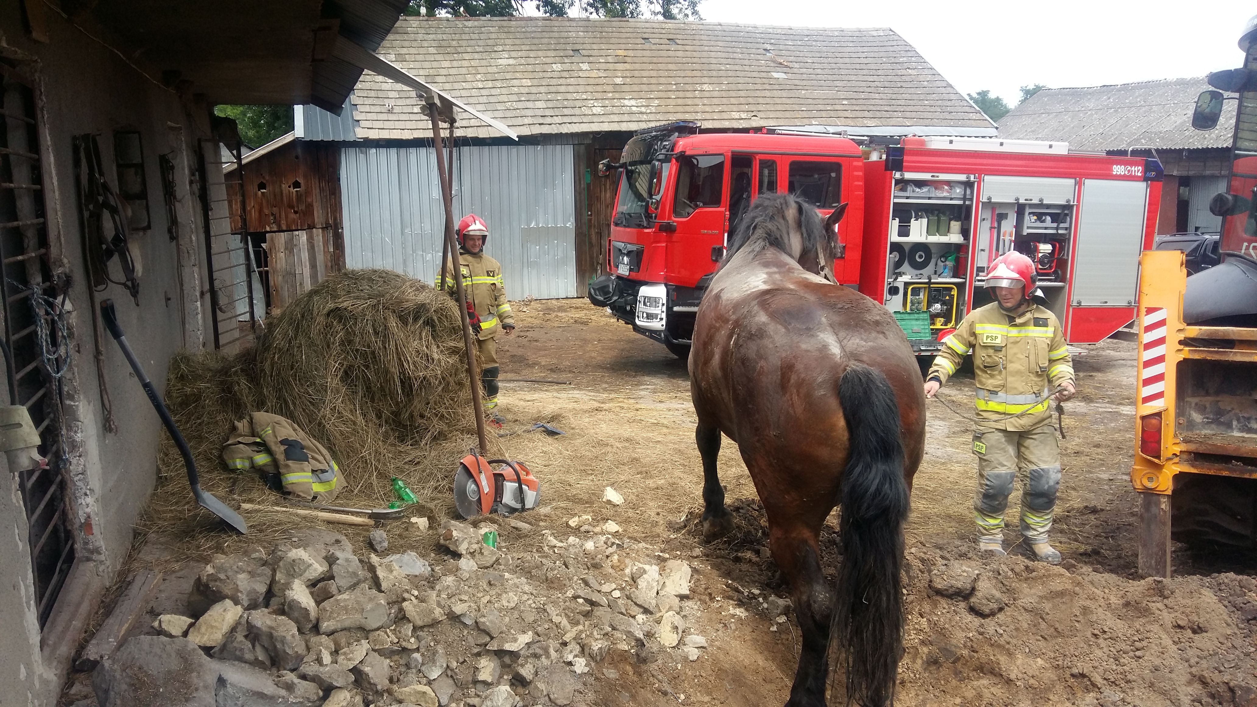 06 lipca 2022 r. o godz. 11:22 Dyżurny Stanowiska Kierowania Komendanta Powiatowego Państwowej Straży Pożarnej w Kazimierzy Wielkiej otrzymał zgłoszenie, że w miejscowości Wielgus koń wpadł do piwnicy i nie może się wydostać. Do zdarzenia zadysponowano dwa zastępy z Jednostki Ratowniczo - Gaśniczej z Kazimierzy Wielkiej. Po przybyciu na miejsce zdarzenia w trakcie rozpoznania stwierdzono, że do niezabezpieczonej piwnicy pod budynkiem inwentarskim wpadł koń. Dostęp do piwnicy był możliwy jedynie przez otwór w podłodze o wymiarach 1,5 metra na 1,5 metra. Zwierzę nie mogło same wydostać się na zewnątrz. Na miejsce przybył wezwany przez właściciela lekarz weterynarii, który podał zwierzęciu środki uspokajające.