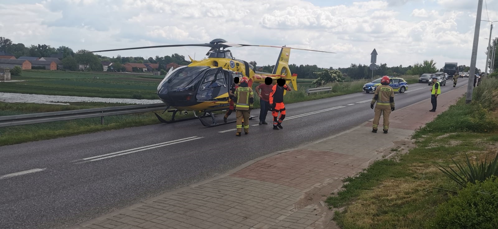 W dniu 31.05.2025 roku o godzinie 12:32 Stanowisko Kierowania Komendanta Powiatowego PSP otrzymało zgłoszenie, że podczas przygotowania do prac polowych ciągnik rolniczy najechał na 72 letniego mężczyznę. Do zdarzenia zadysponowano dwa zastępy z JRG Kazimierza Wielka, Zespół Ratownictwa Medycznego oraz Patrol Policji. Na miejscu ratownicy ZRM udzielili pomocy medycznej poszkodowanemu mężczyźnie, a ratownicy jednostek ochrony przeciwpożarowej zabezpieczyli miejsce zdarzenia i ciągnik. Po przebadaniu lekarz stwierdził potrzebę przewiezienia go do szpitala. Ze względu na stan poszkodowanego zadysponowano na miejsce śmigłowiec Lotniczego Pogotowia Ratunkowego dla którego strażacy i policjanci przygotowali lądowisko na odcinku drogi wojewódzkiej nr 768.