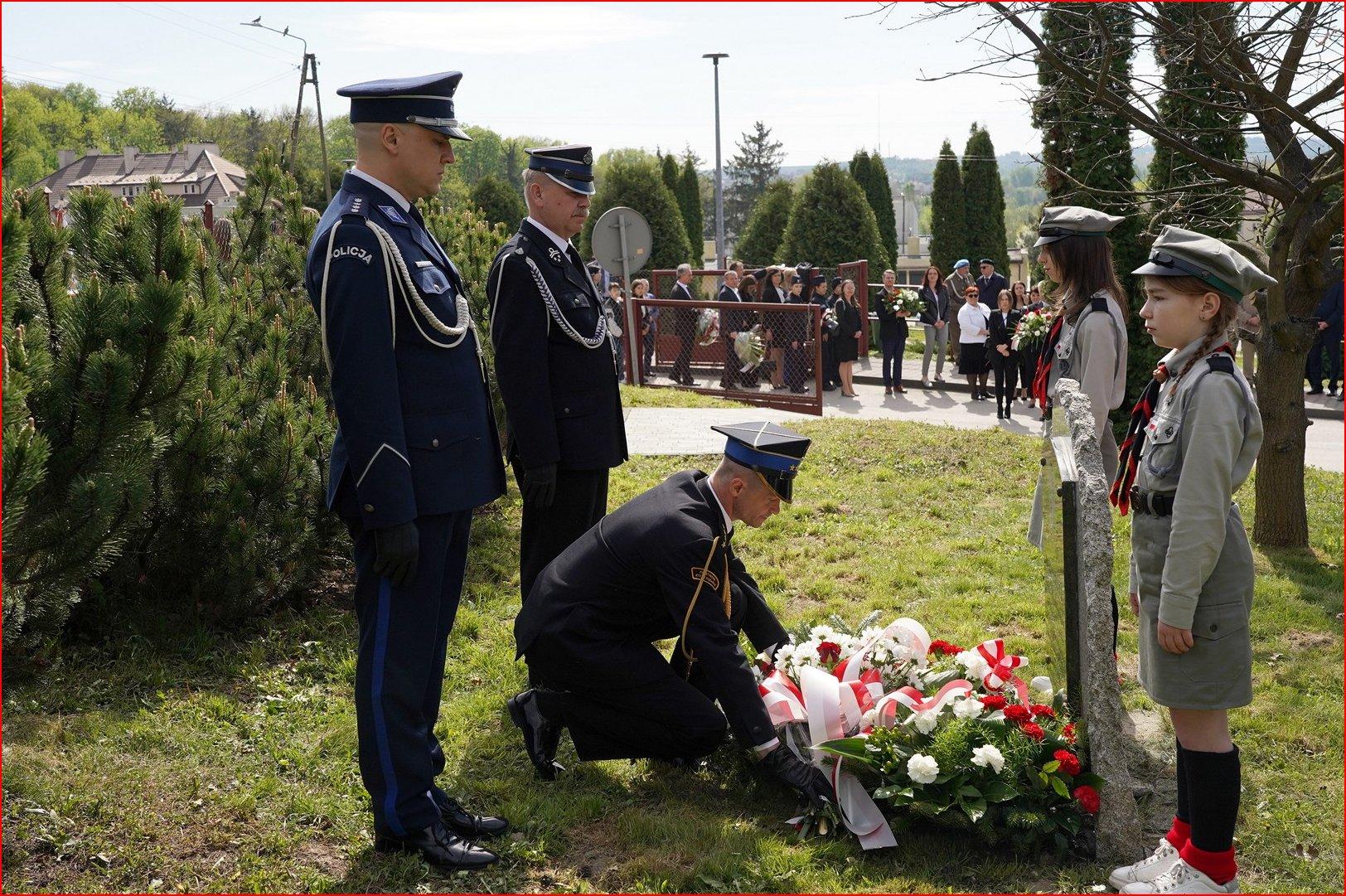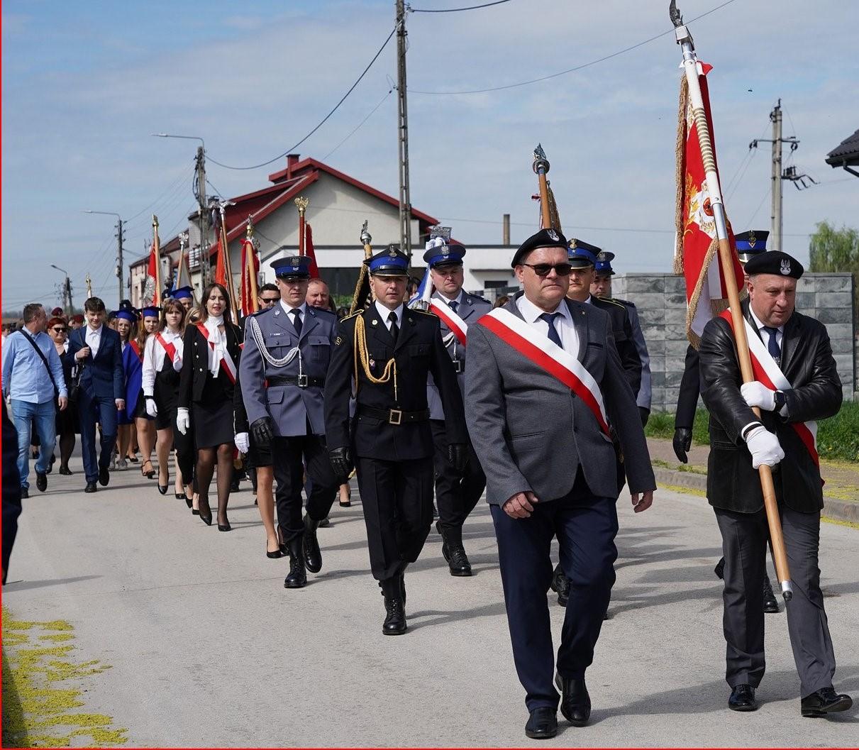 Po nabożeństwie uczestnicy patriotycznej uroczystości na czele z pocztami sztandarowymi udali się przed budynek Samorządowej Szkoły Podstawowej numer 3 imienia Jana Pawła II, oraz pod obelisk, gdzie przy tablicy pamiątkowej poświęconej porucznikowi Wojska Polskiego Leonowi Postawce, po wysłuchaniu hymnu polskiego złożono kwiaty i zapalono symboliczne znicze.