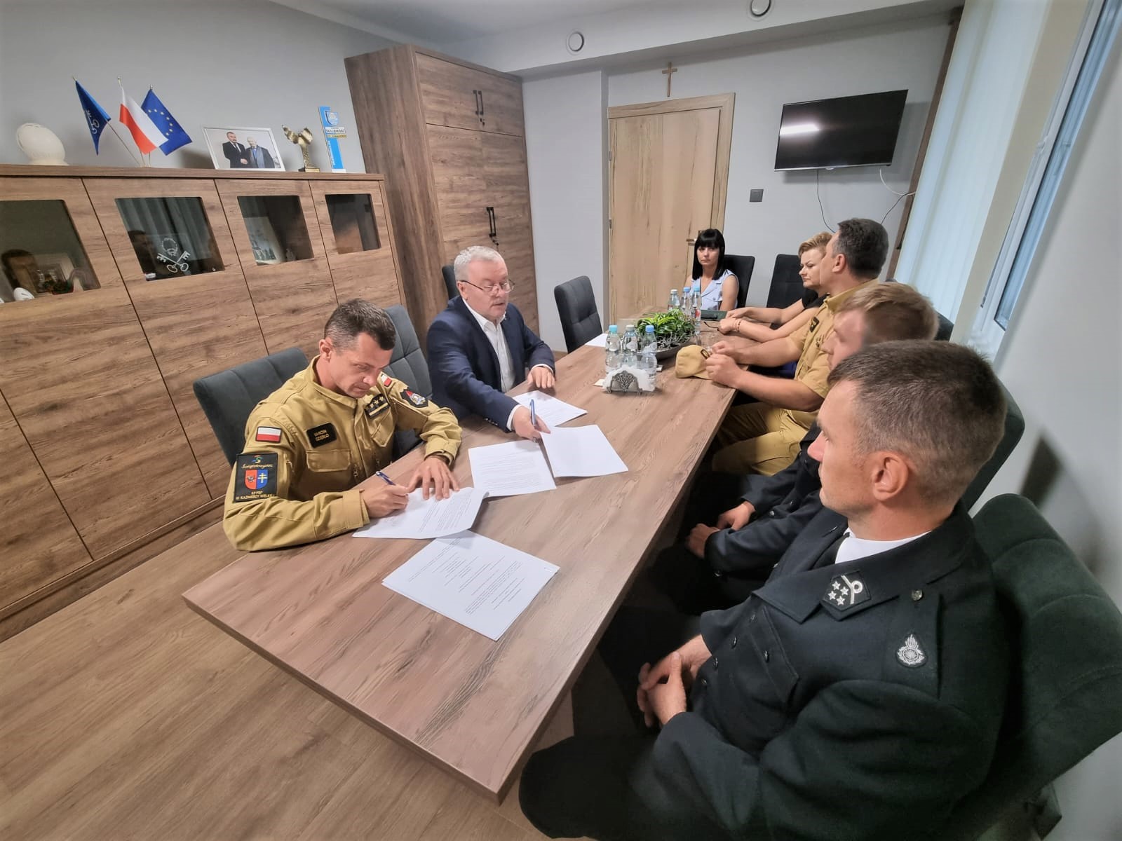 17 lipca 2023 roku o godzinie 9:00 w Urzędzie Miasta i Gminy Skalbmierz Komendant Powiatowy Państwowej Straży Pożarnej w Kazimierzy Wielkiej st. kpt. Marcin Oziębło, Burmistrz Miasta i Gminy Skalbmierz Marek Juszczyk, Prezes jednostki OSP Topola dh Mateusz Dora, w obecności: Zastępcy Komendanta Powiatowego Państwowej Straży Pożarnej w Kazimierzy Wielkiej bryg. Krzysztofa Jacha, st. inspektora sztabowego ds. operacyjnych mł. asp. Łukasza Parady, Naczelnika OSP Topola-dh Dominika Klasińskiego, oraz pracowników UMiG Skalbmierz podpisali porozumienie na mocy którego jednostka Ochotniczej Straży Pożarnej w Topoli w tym roku ma zostać włączona do krajowego sytemu ratowniczo-gaśniczego. Porozumienie nakłada szereg zadań i obowiązków, którym muszą podołać druhowie m.in. lepsze wyposażenie, wyszkolenie, większą dyspozycyjność.