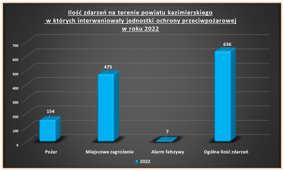 W okresie od 01 stycznia do 31 grudnia 2022 roku na terenie powiatu kazimierskiego jednostki ochrony przeciwpożarowej interweniowały przy 636 zdarzeniach, w tym:
