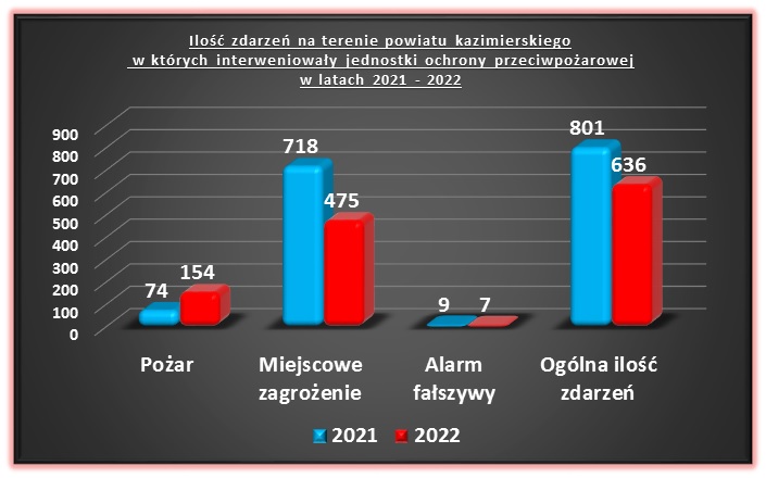 Reasumując Jednostka Ratowniczo – Gaśnicza w Kazimierzy Wielkiej prowadziła działania ratownicze wspólnie z ochotniczymi strażami pożarnymi z terenu powiatu kazimierskiego w 2022 roku wyjeżdżając do zdarzeń 636 razy, w tym do 154 pożarów, 475 miejscowych zagrożeń oraz do 7 alarmów fałszywych. Najwięcej interwencji odnotowano w gminie Kazimierza Wielka – 287.