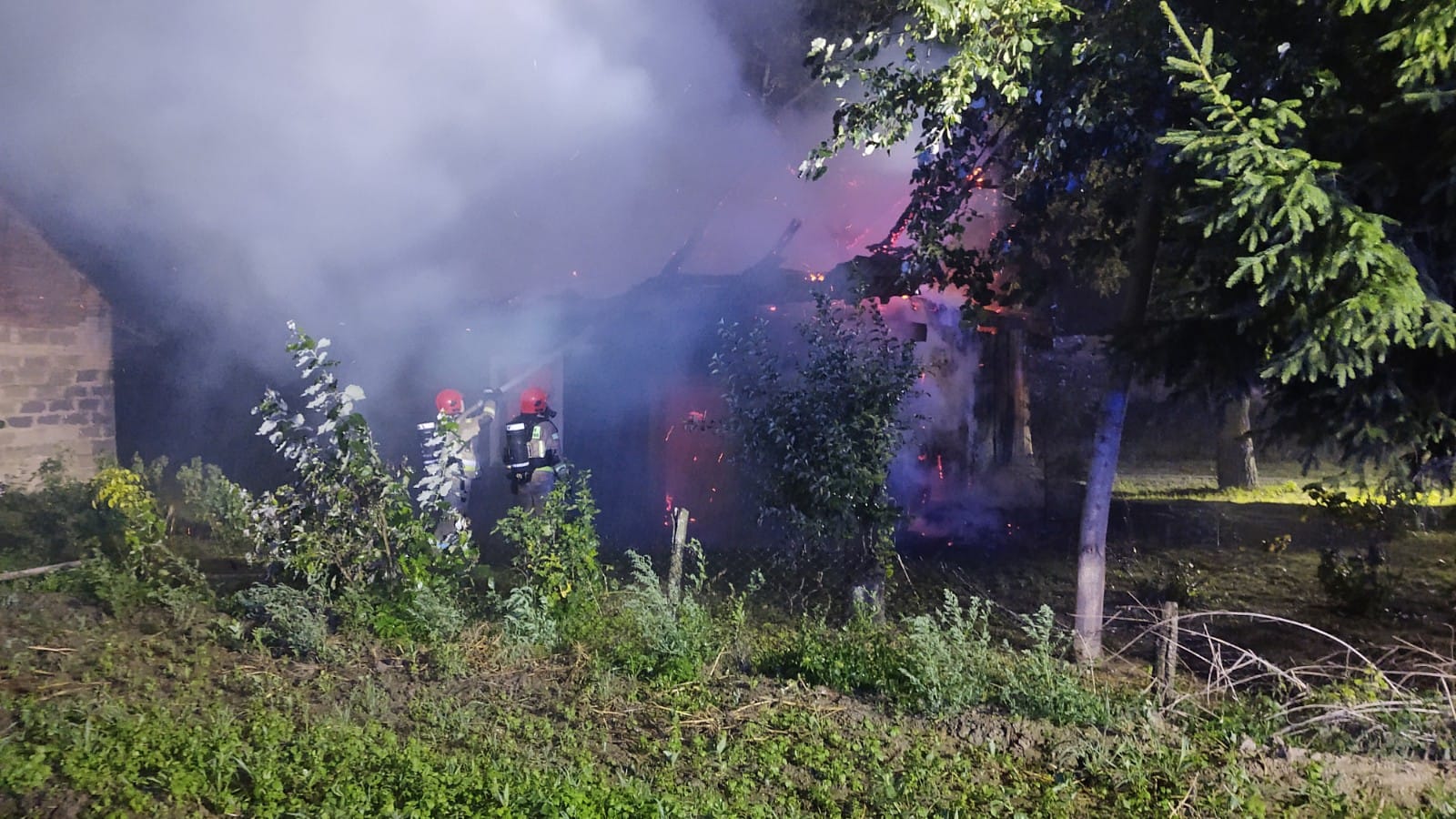 Działania jednostek ochrony przeciwpożarowej polegały na zabezpieczeniu i oświetleniu miejsca zdarzenia, podaniu trzech prądów gaśniczych wody na palący się budynek mieszkalny oraz więźbę budynku inwentarskiego. Po ugaszeniu pożaru nadpalone elementy z rozbiórki usunięto i ponownie przelano. Działania zakończono po dokładnym sprawdzeniu budynków przy użyciu przyrządów pomiarowych (kamery termowizyjnej oraz detektorów wielogazowych), nie stwierdzając dalszego zagrożenia.