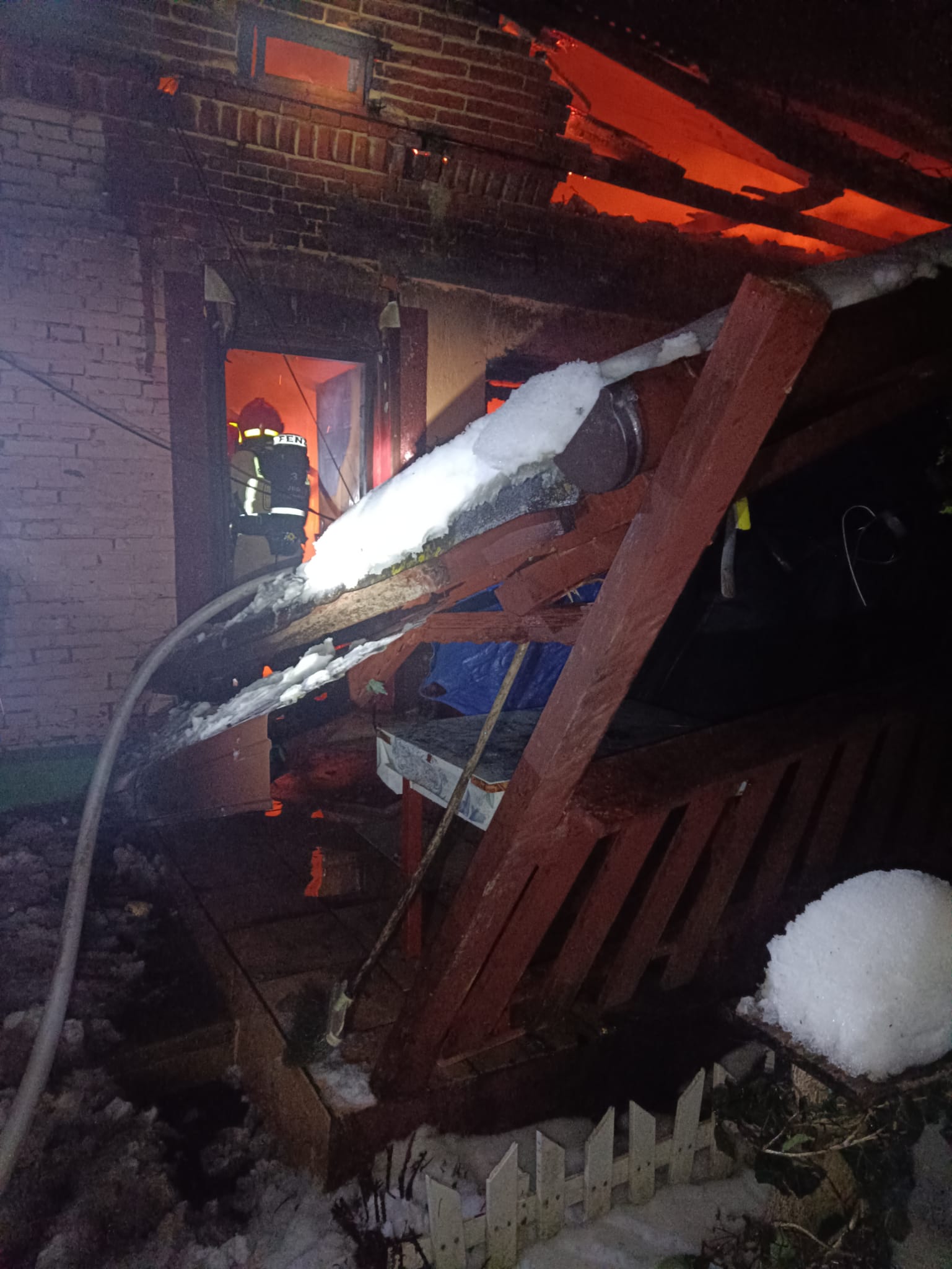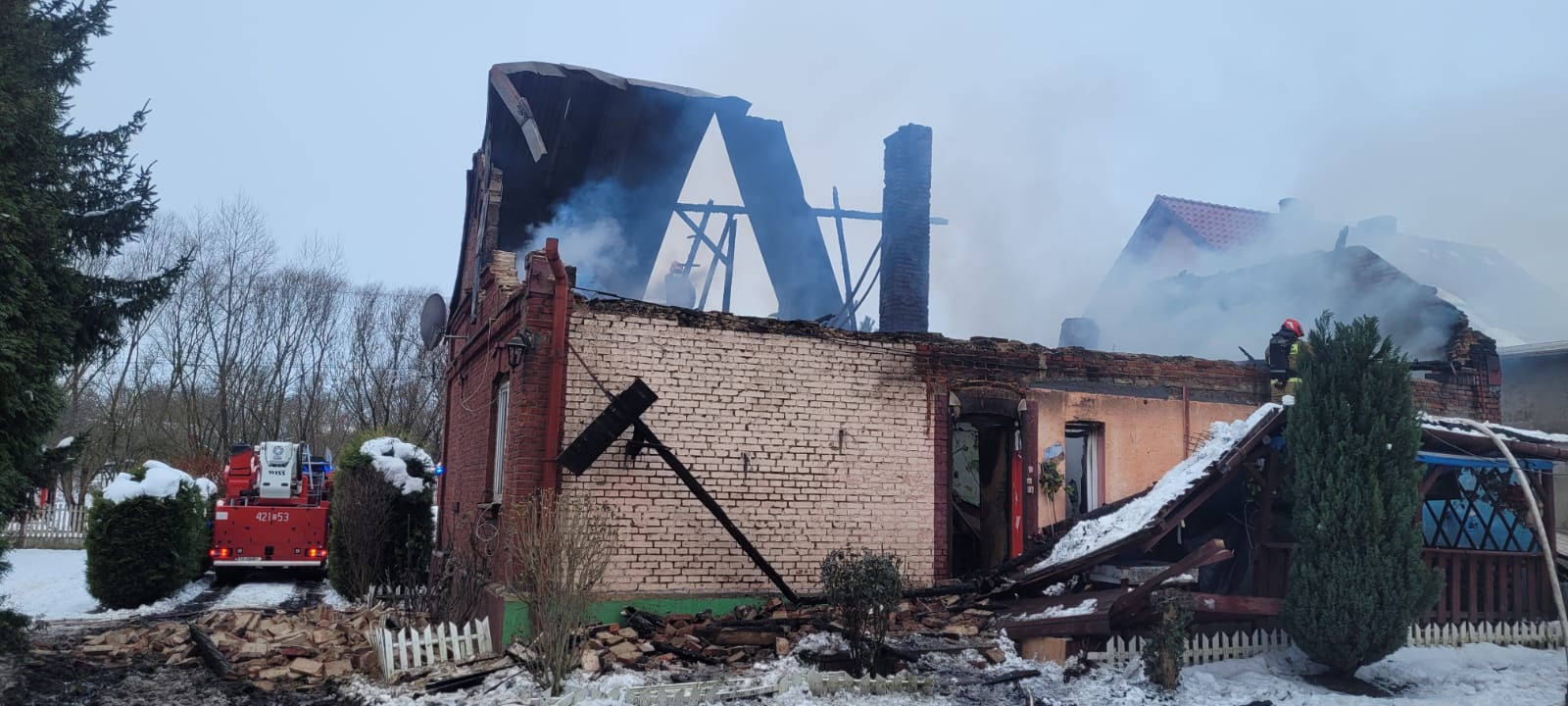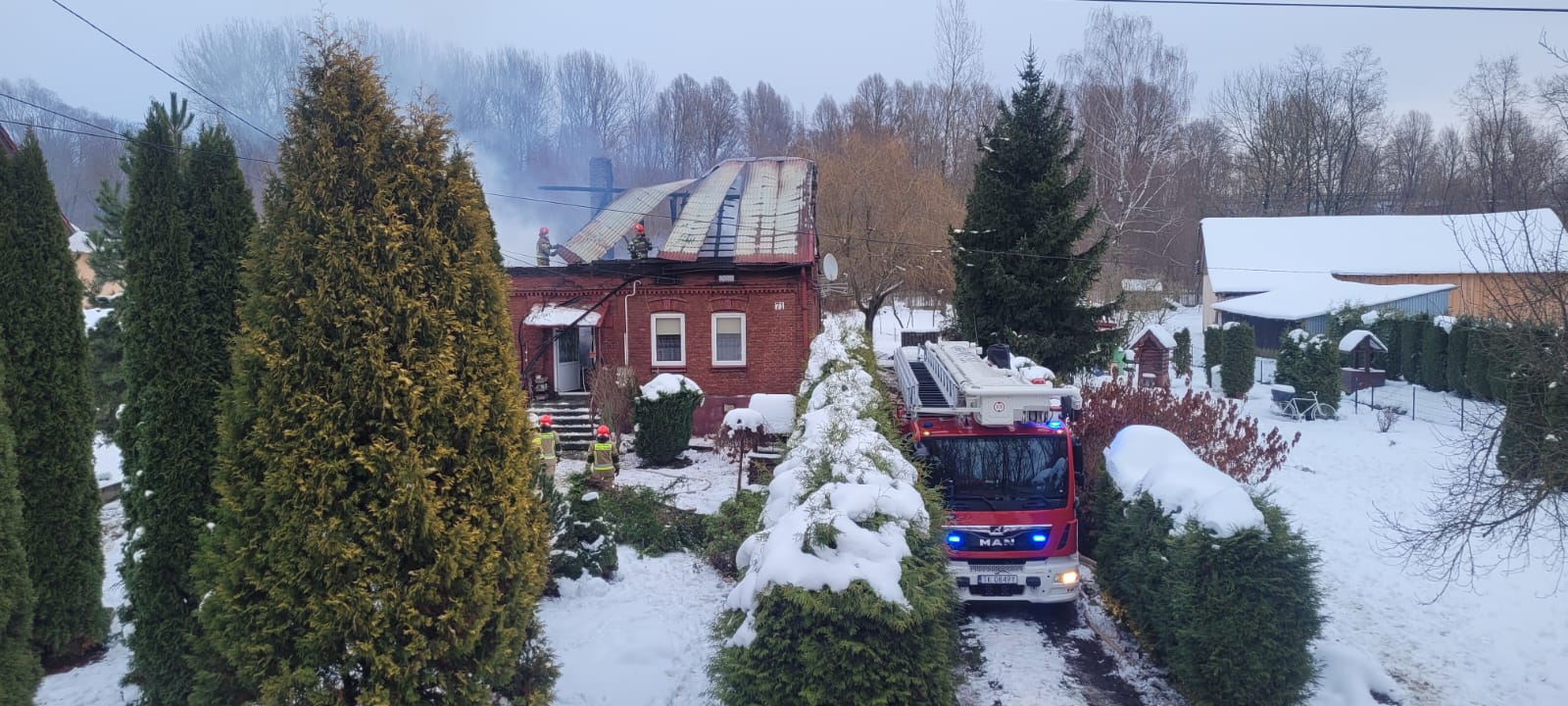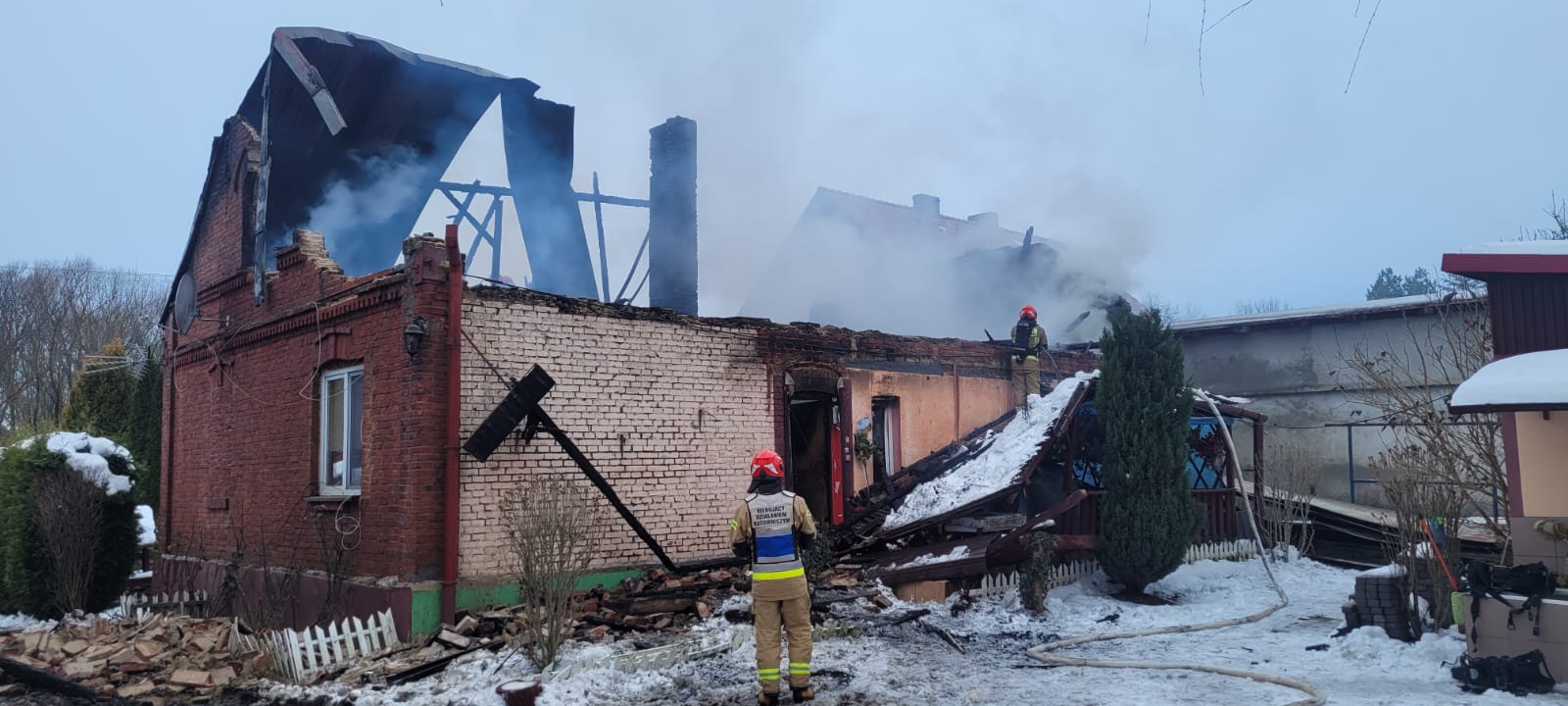 11 grudnia 2023 r. o godz. 05:13 Dyżurny Stanowiska Kierowania Komendanta Powiatowego Państwowej Straży Pożarnej w Kazimierzy Wielkiej otrzymał zgłoszenie o rozwiniętym pożarze budynku mieszkalnego w miejscowości Kolosy. Do zdarzenia zadysponowano cztery zastępy z Jednostki Ratowniczo - Gaśniczej w Kazimierzy Wielkiej i trzy zastępy OSP: Sokolina, Kolosy, Cieszkowy. Po przybyciu na miejsce zdarzenia w trakcie rozpoznania stwierdzono, że pożarem objęty jest prawie cały budynek mieszkalny. Mężczyzna mieszkający w nim przy pomocy sąsiadów wydostał się z obiektu i przebywał na zewnątrz. Działania jednostek ochrony przeciwpożarowej polegały na zabezpieczeniu i oświetleniu miejsca zdarzenia. Następnie ratownicy w sprzęcie ochrony układu oddechowego podali dwa prądy wody w natarciu na palący się budynek mieszkalny i jeden prąd wody w obronie na zagrożony budynek gospodarczy. Podjęte działania doprowadziły do zlokalizowania i całkowitego ugaszenia powstałego pożaru. Nadpalone elementy więźby dachowej i powały budynku zostały rozebrane, usunięte na zewnątrz i przelane wodą w celu dogaszenia. W trakcie działań gaśniczych wykorzystywano podnośnik hydrauliczny SHD23 będący na wyposażeniu JRG Kazimierza Wielka. Po zakończeniu działań gaśniczych budynek powtórnie przeszukano, oddymiono i sprawdzono za pomocą kamery termowizyjnej i detektorów wielogazowych - urządzenia nie wykazały zagrożenia.