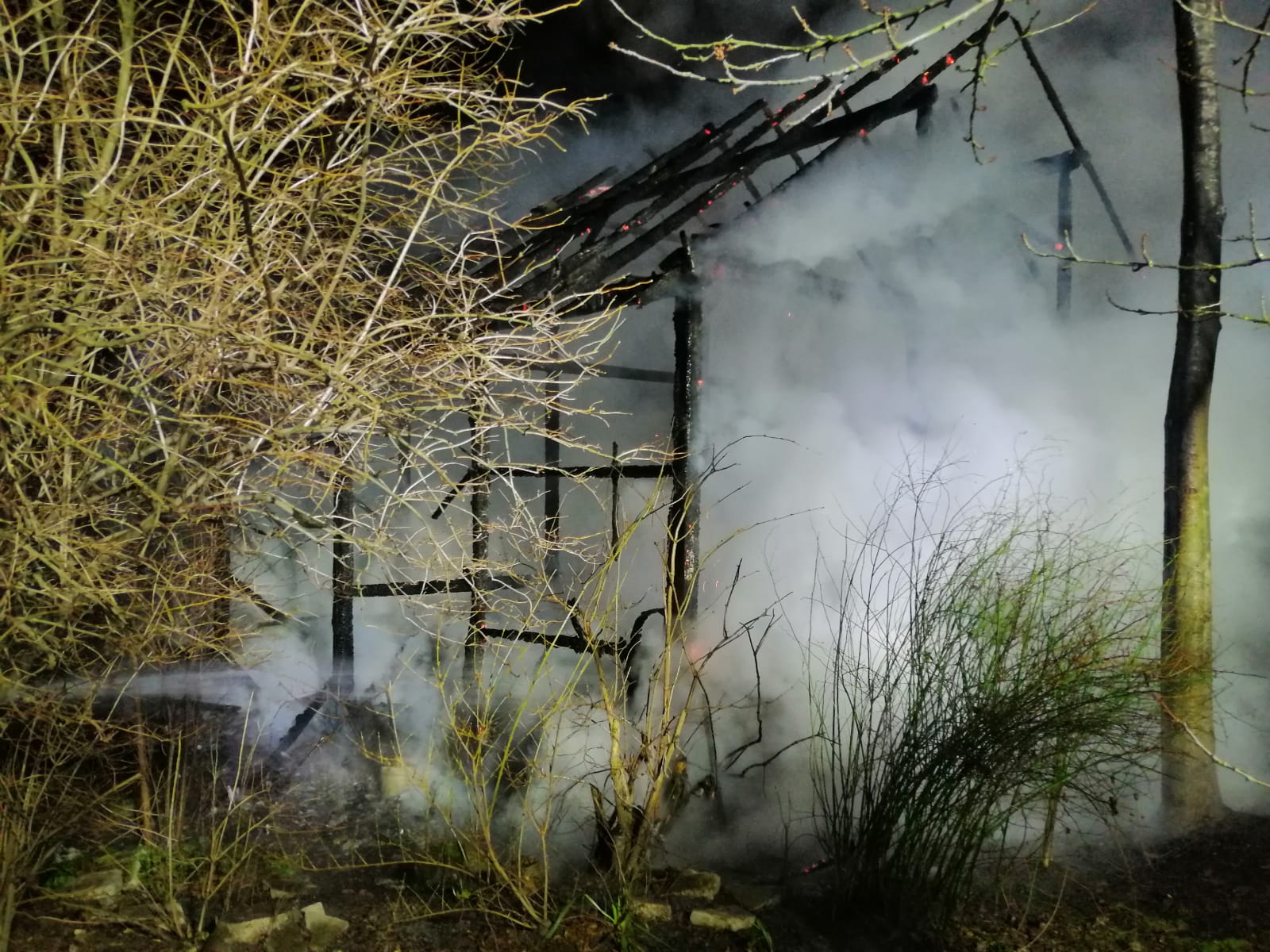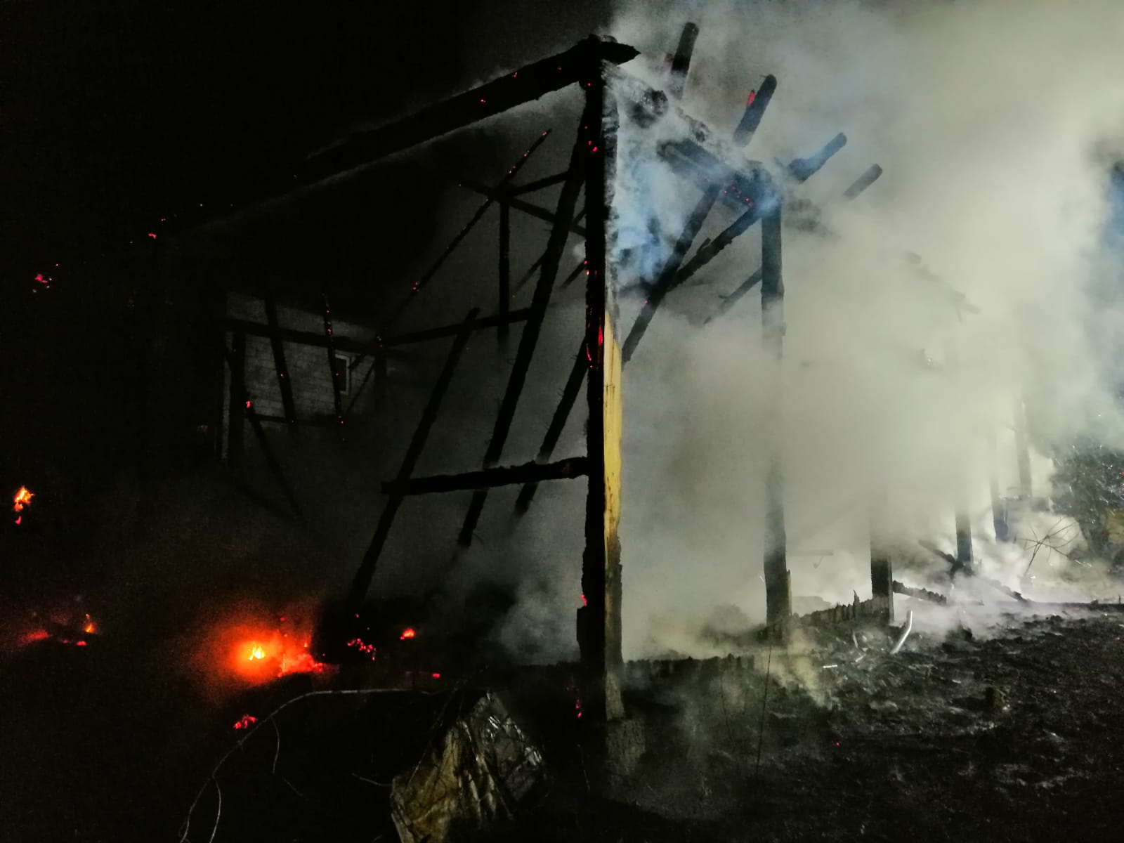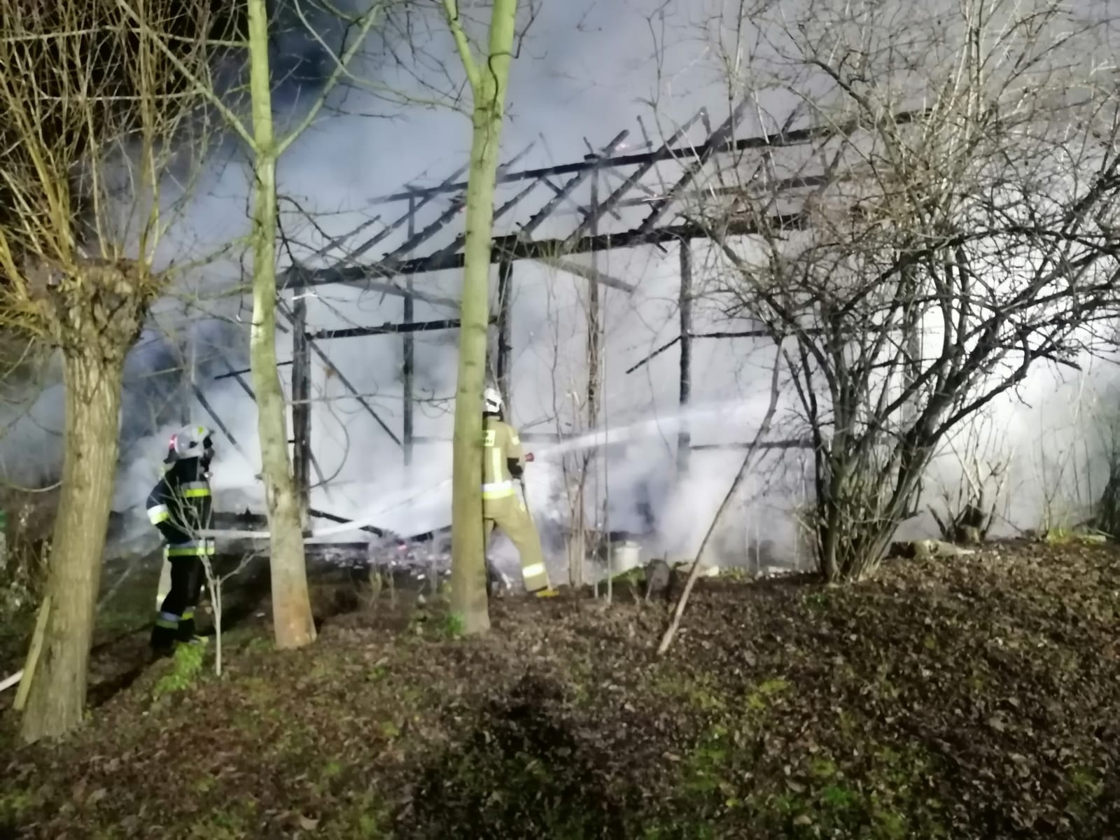 Działania jednostek ochrony przeciwpożarowej polegały na zabezpieczeniu miejsca zdarzenia oraz podaniu dwóch prądów wody. Jeden prąd podano w natarciu na palący się obiekt, drugi natomiast w obronie zagrożonego budynku gospodarczego. Podjęte działania doprowadziły do zlokalizowania i całkowitego ugaszenia powstałego pożaru. Ratownicy przeszukali pogorzelisko potwierdzając, że nie ma osób poszkodowanych. Po zakończeniu działań gaśniczych pogorzelisko dodatkowo sprawdzono za pomocą kamery termowizyjnej, urządzenie nie wykazało dalszych zagrożeń.