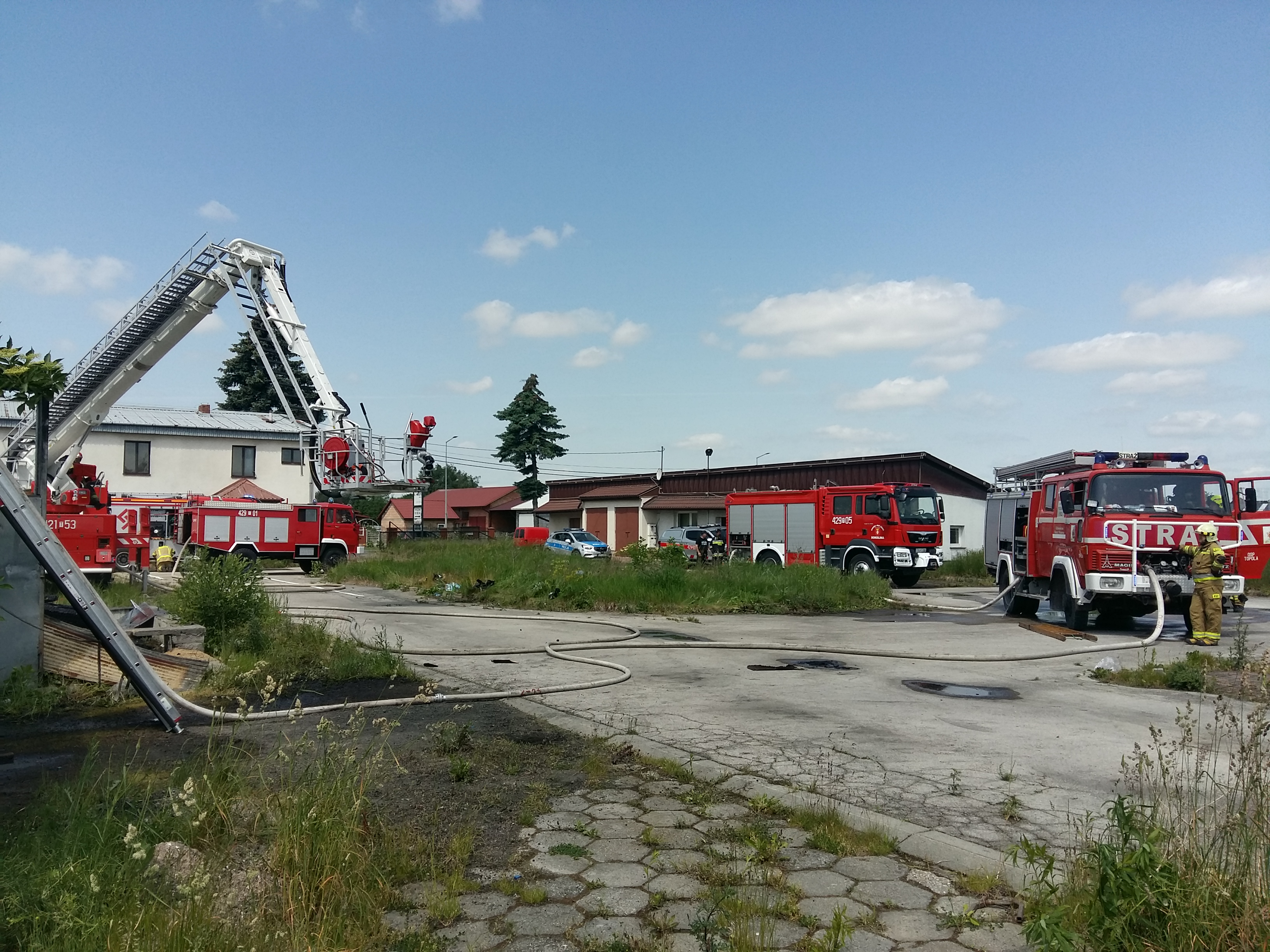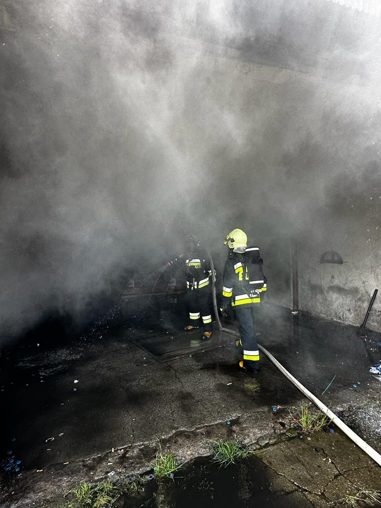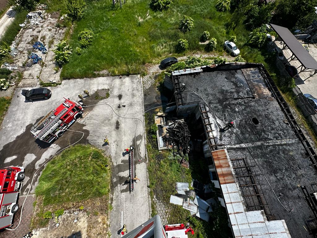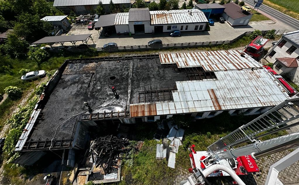 02 czerwca 2023 r. o godz. 08:35 Dyżurny Stanowiska Kierowania Komendanta Powiatowego Państwowej Straży Pożarnej w Kazimierzy Wielkiej otrzymał zgłoszenie o pożarze hali techniczno – magazynowej w miejscowości Kazimierza Wielka. Do zdarzenia w pierwszym rzucie zadysponowano dwa zastępy z Jednostki Ratowniczo - Gaśniczej w Kazimierzy Wielkiej oraz pięć zastępów OSP. Po przybyciu na miejsce zdarzenia w trakcie rozpoznania stwierdzono, że pali się jedno pomieszczenie hali oraz dach o wymiarach 40 metrów na 13 metrów. Panowało bardzo duże zadymienie. Brak osób poszkodowanych. Wewnątrz znajdowały się cztery samochody osobowe oraz 76 butli 11 kilogramowych z gazem propan – butan. Działania zastępów jednostek ochrony przeciwpożarowej polegały na podaniu 5 prądów wody w natarciu w tym jeden z podnośnika SHD23. Po ugaszeniu pożaru nadpalona drewniana konstrukcja dachu i poszycie wykonane z blachy zostało rozebrane. W wyniku pożaru jeden ze znajdujących się w środku pojazdów spłonął całkowicie. Butle z gazem zostały wyniesione zanim temperatura pożaru zaczęła na nie oddziaływać. Na miejsce zdarzenia przybył Powiatowy Inspektor Nadzoru Budowlanego i Grupa Operacyjna Policji. Po zakończonych działaniach gaśniczych cały obiekt sprawdzono przy pomocy kamery termowizyjnej celem wykluczenia obecności ukrytych zarzewi ognia.