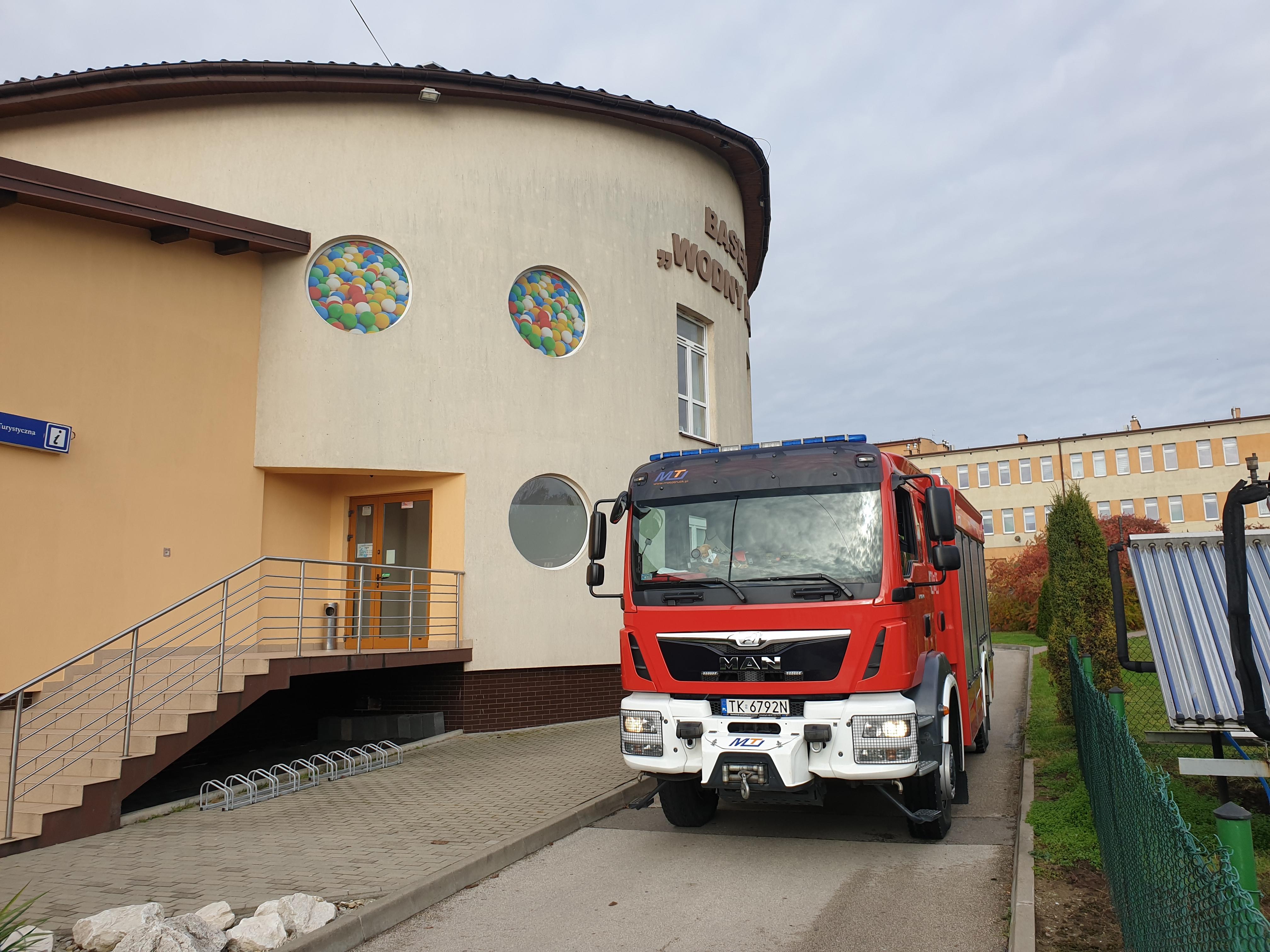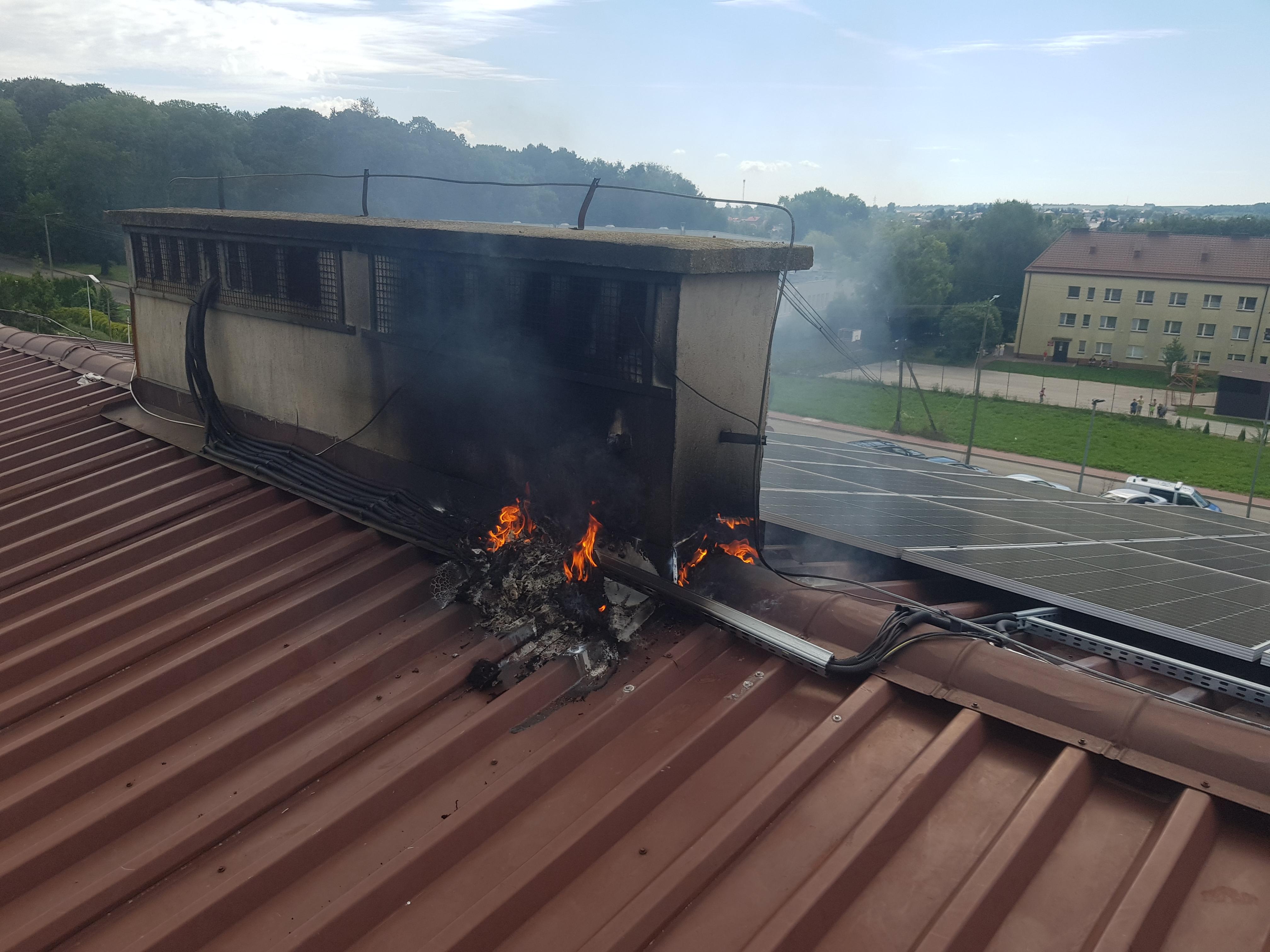 11 sierpnia 2024 r. o godz. 10:23 Dyżurny Stanowiska Kierowania Komendanta Powiatowego Państwowej Straży Pożarnej w Kazimierzy Wielkiej otrzymał zgłoszenie o pożarze zlokalizowanym na dachu pływalni Wodny Raj w Kazimierzy Wielkiej. Do zdarzenia w pierwszym rzucie zadysponowano trzy zastępy z Jednostki Ratowniczo - Gaśniczej w Kazimierzy Wielkiej oraz zastęp OSP Zagórzyce z KSRG. Na miejscu okazało się, że pali się wyłącznik przeciwpożarowy instalacji fotowoltaicznej zamontowany w skrzynce z tworzywa sztucznego na dachu pływalni. Działania zastępów polegały na wyłączeniu prądu w obiekcie oraz inwerterów instalacji fotowoltaicznej. Następnie rozstawiono podnośnik hydrauliczny SHD23 i podano rozproszony prąd wody na palącą się skrzynkę. Po ugaszeniu pożaru kamerą termowizyjną wykluczono ukryte zarzewie ognia. W wyniku zdarzenia żadna osoba nie odniosła obrażeń. Po przybyciu serwisanta instalacji fotowoltaicznej została ona zabezpieczona, a pływalnia ponownie uruchomiona.