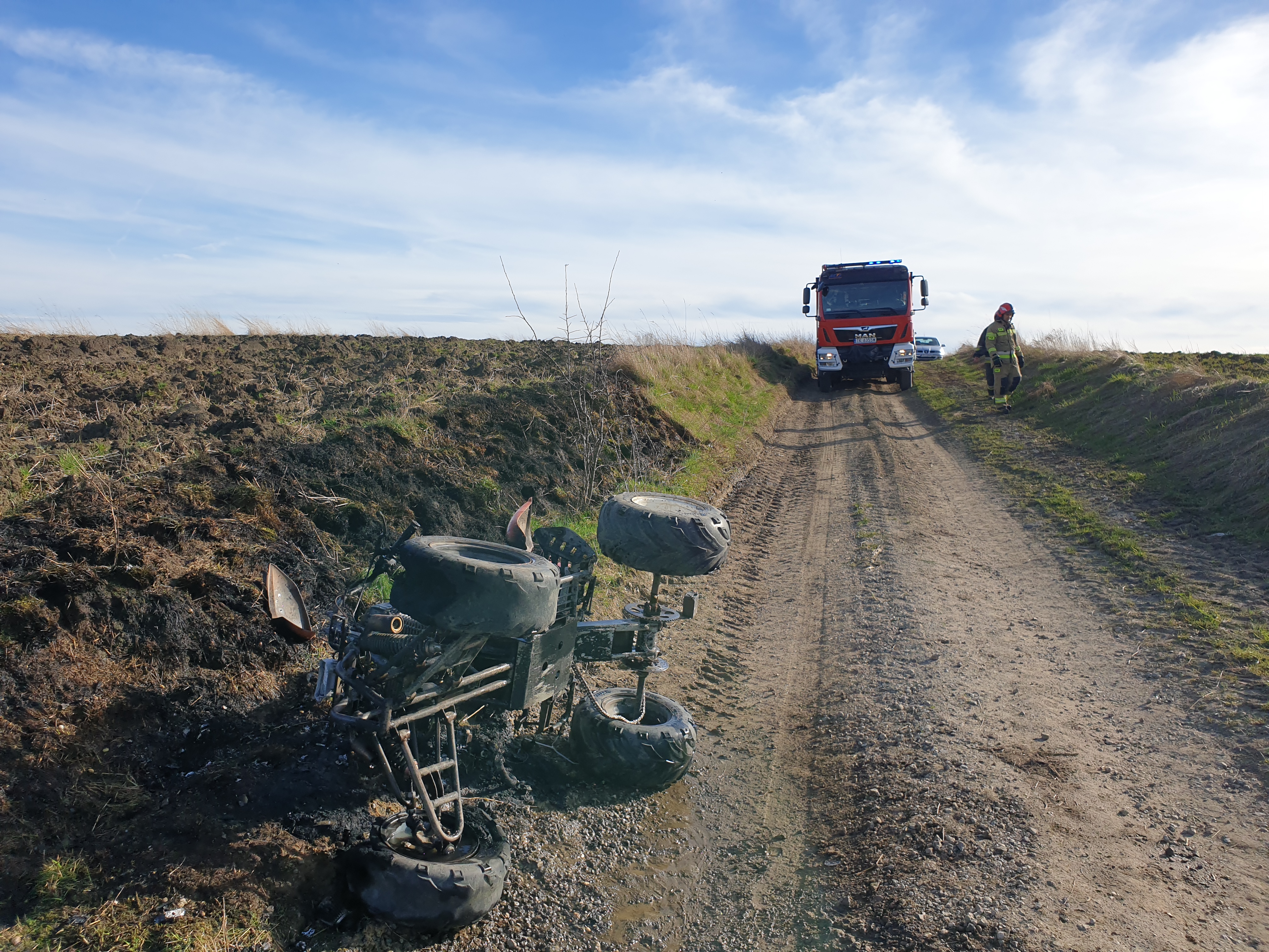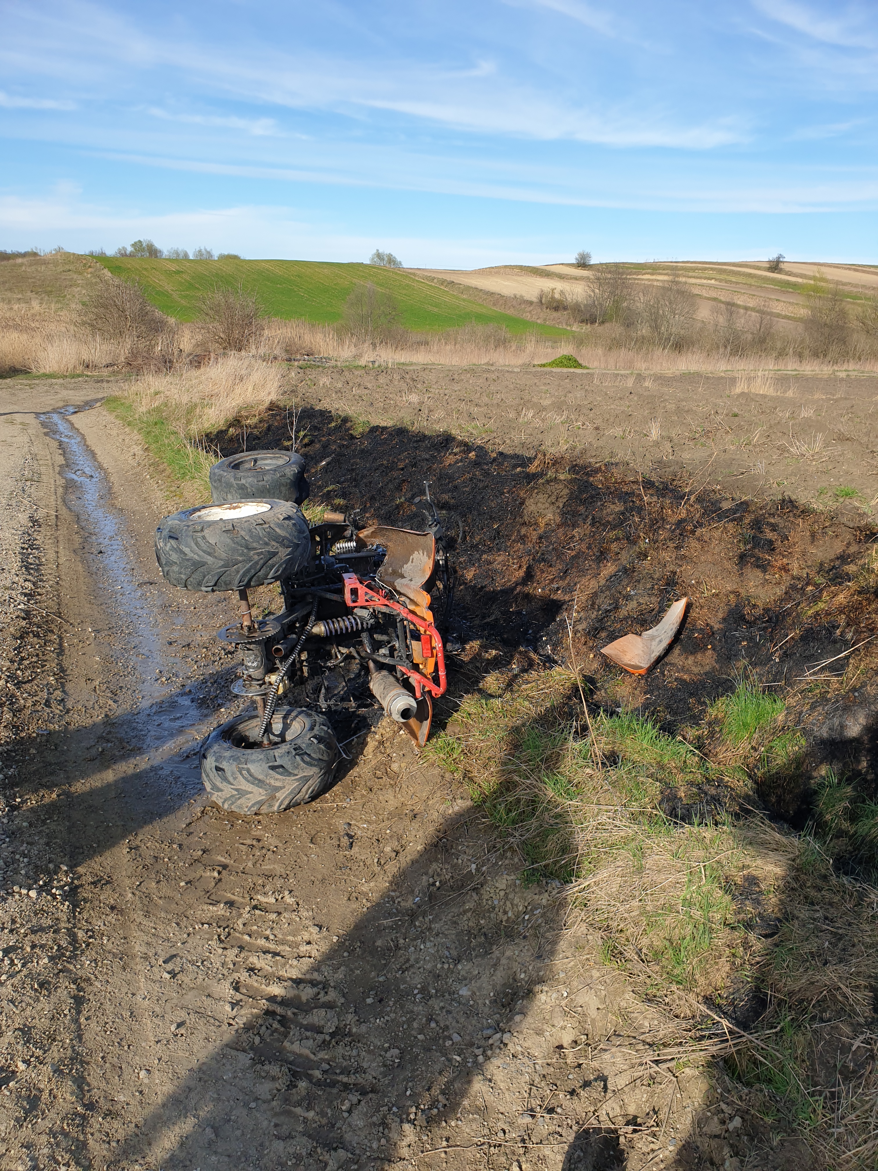 29 marca 2024 r. o godz. 15:13 Dyżurny Stanowiska Kierowania Komendanta Powiatowego Państwowej Straży Pożarnej w Kazimierzy Wielkiej otrzymał zgłoszenie o pożarze quada na polnej drodze w miejscowości Kamyszów. Do zdarzenia zadysponowano dwa zastępy z Jednostki Ratowniczo - Gaśniczej w Kazimierzy Wielkiej oraz OSP Topola z KSRG. Po przybyciu na miejsce zdarzenia w trakcie rozpoznania stwierdzono, że pożarem objęty jest leżący na prawym boku czterokołowiec. Pojazdem podróżowały dwie młode osoby, które były przytomne i uskarżały się na ogólne potłuczenia. Działania zastępów polegały na zabezpieczeniu miejsca zdarzenia oraz podaniu jednego prądu wody w natarciu na palącego się quada. Do czasu przybycia na miejsce Zespołu Ratownictwa Medycznego poszkodowanym kwalifikowanej pierwszej pomocy medycznej udzielali ratownicy Jednostek Ochrony Przeciwpożarowej. Po przebadaniu obie osoby pozostały na miejscu zdarzenia – nie wymagały hospitalizacji. Policja wyjaśnia okoliczności zdarzenia.