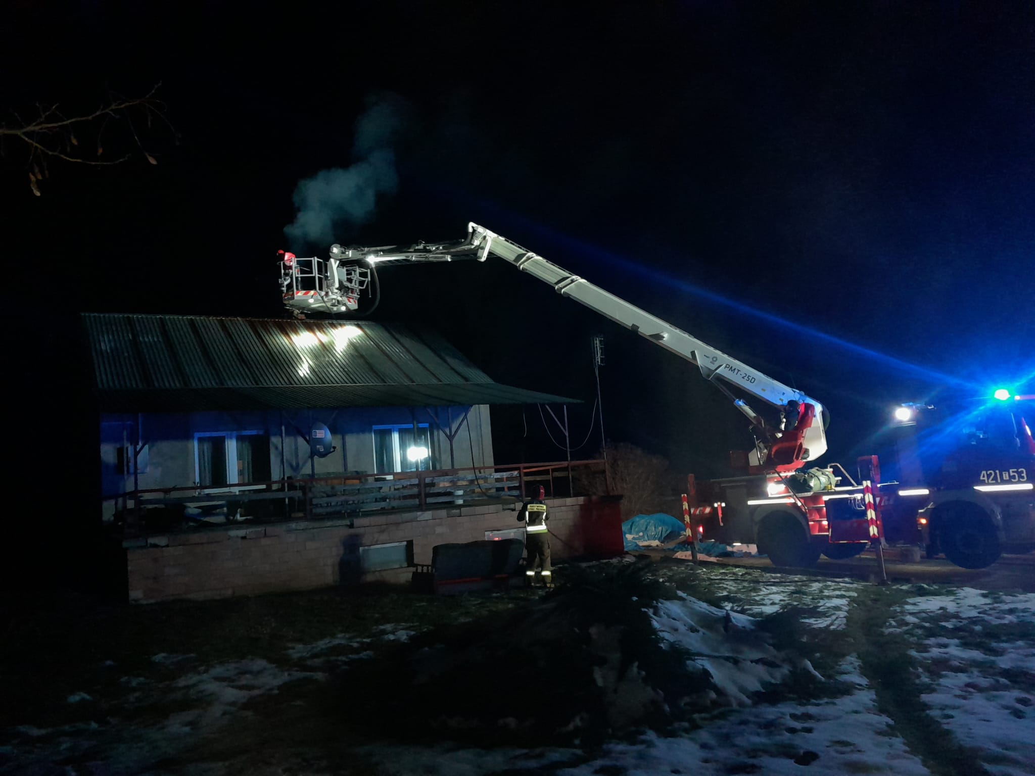 28 stycznia 2023 r. o godz. 22:25 Dyżurny Stanowiska Kierowania Komendanta Powiatowego Państwowej Straży Pożarnej w Kazimierzy Wielkiej otrzymał zgłoszenie o pożarze sadzy wewnątrz przewodu kominowego w budynku mieszkalnym jednorodzinnym w miejscowości Podolany. Do zdarzenia zadysponowano dwa zastępy z Jednostki Ratowniczo - Gaśniczej w Kazimierzy Wielkiej. Po przybyciu na miejsce zdarzenia w trakcie rozpoznania stwierdzono, że palą się sadze wewnątrz przewodu kominowego w budynku mieszkalnym jednorodzinnym. Temperatura przewodu kominowego miejscami przekraczała 1600C. Mieszkańcy domu znajdowali się na zewnątrz budynku i nie uskarżali się na żadne dolegliwości. Palenisko pieca zostało wygaszone przez właściciela przed przybyciem JOP. Działania zastępów polegały na zabezpieczeniu miejsca zdarzenia. Następnie przy pomocy podnośnika SHD-23 i lancy kominowej ratownicy ugasili palące się sadze. Przewód kominowy został udrożniony przy użyciu wycioru kominowego. Podjęte działania doprowadziły do usunięcia powstałego zagrożenia . Po zakończeniu działań gaśniczych budynek sprawdzono za pomocą kamery termowizyjnej i detektorów wielogazowych, urządzenia nie wykazały zagrożenia.