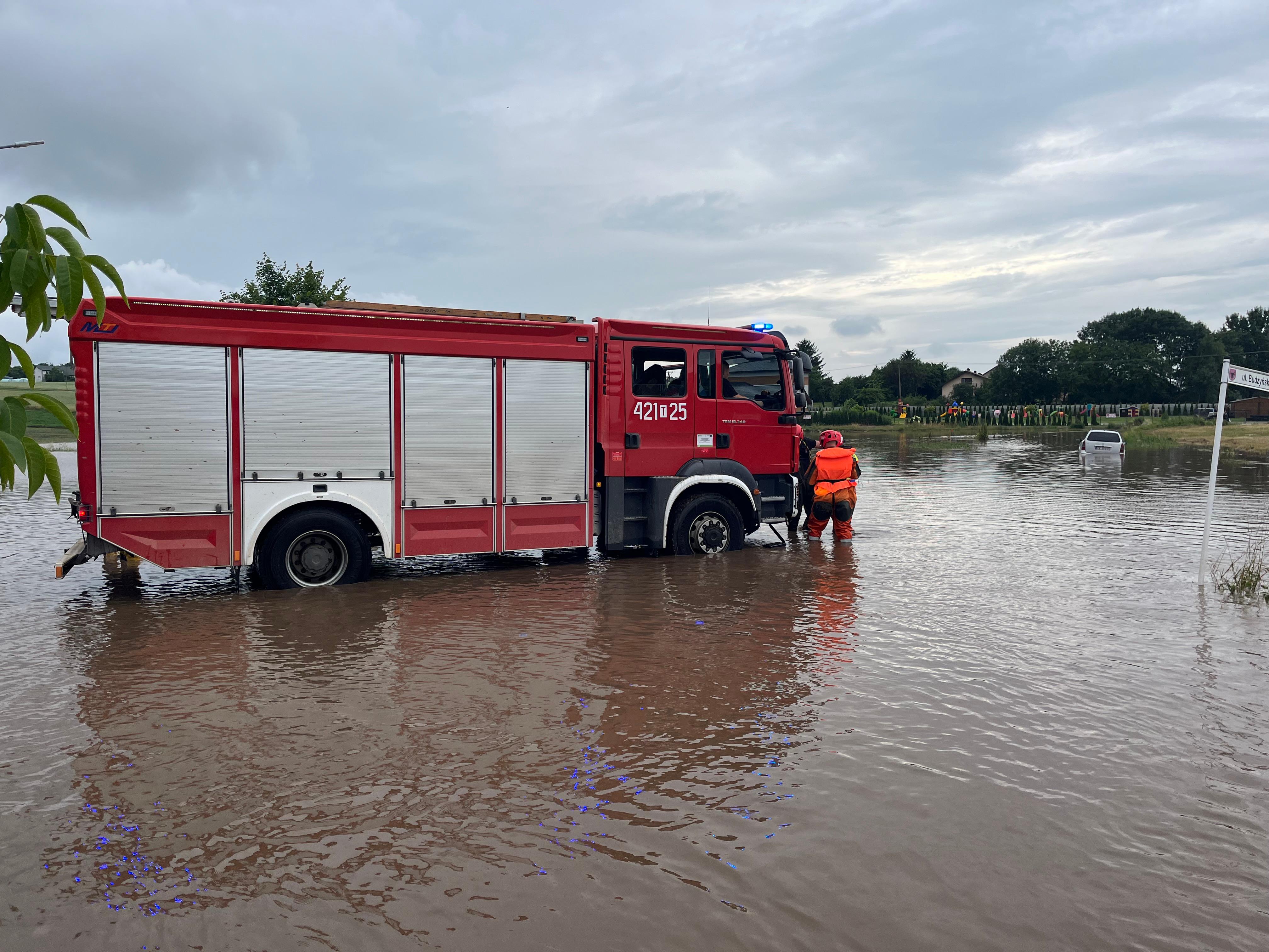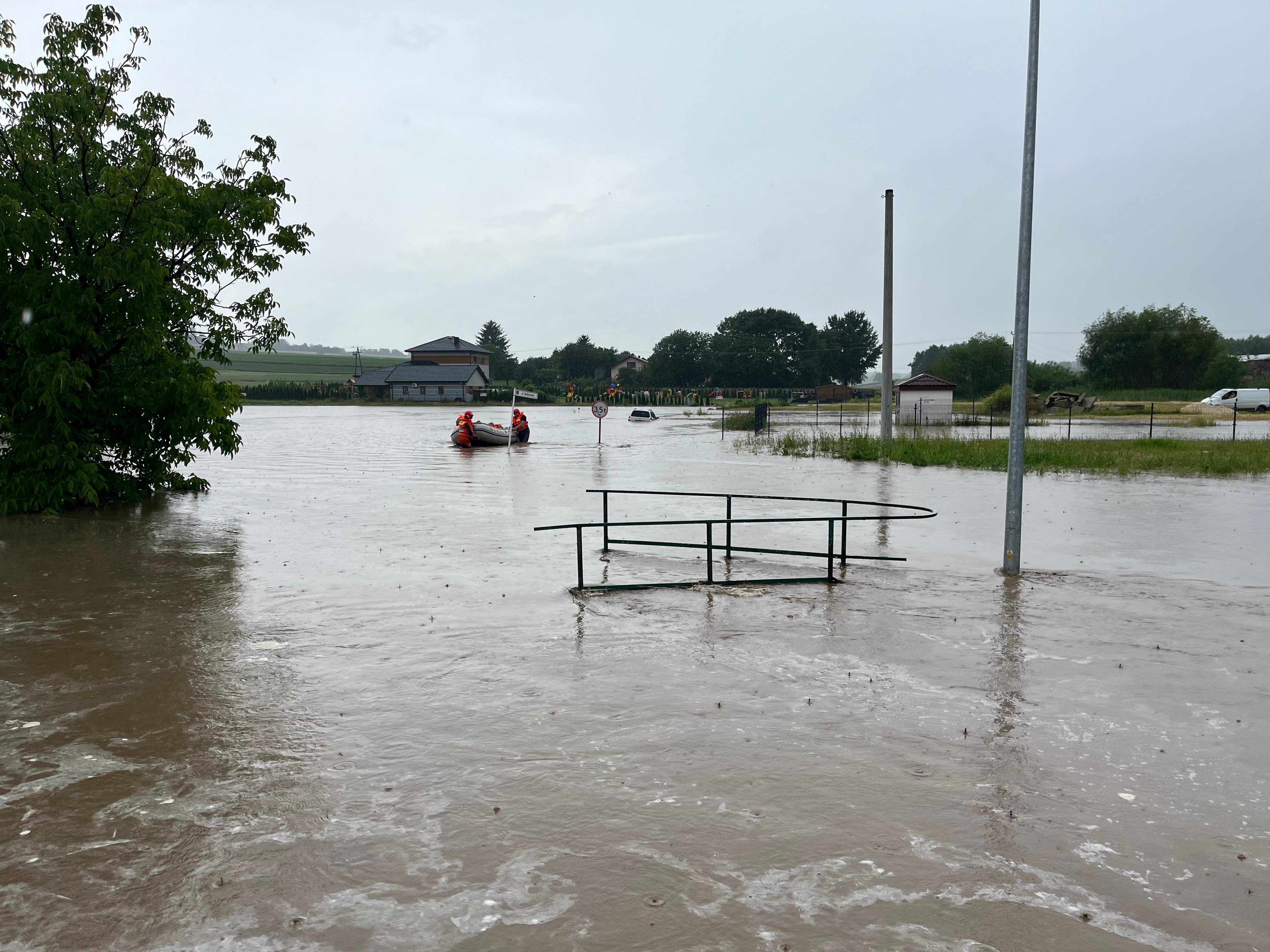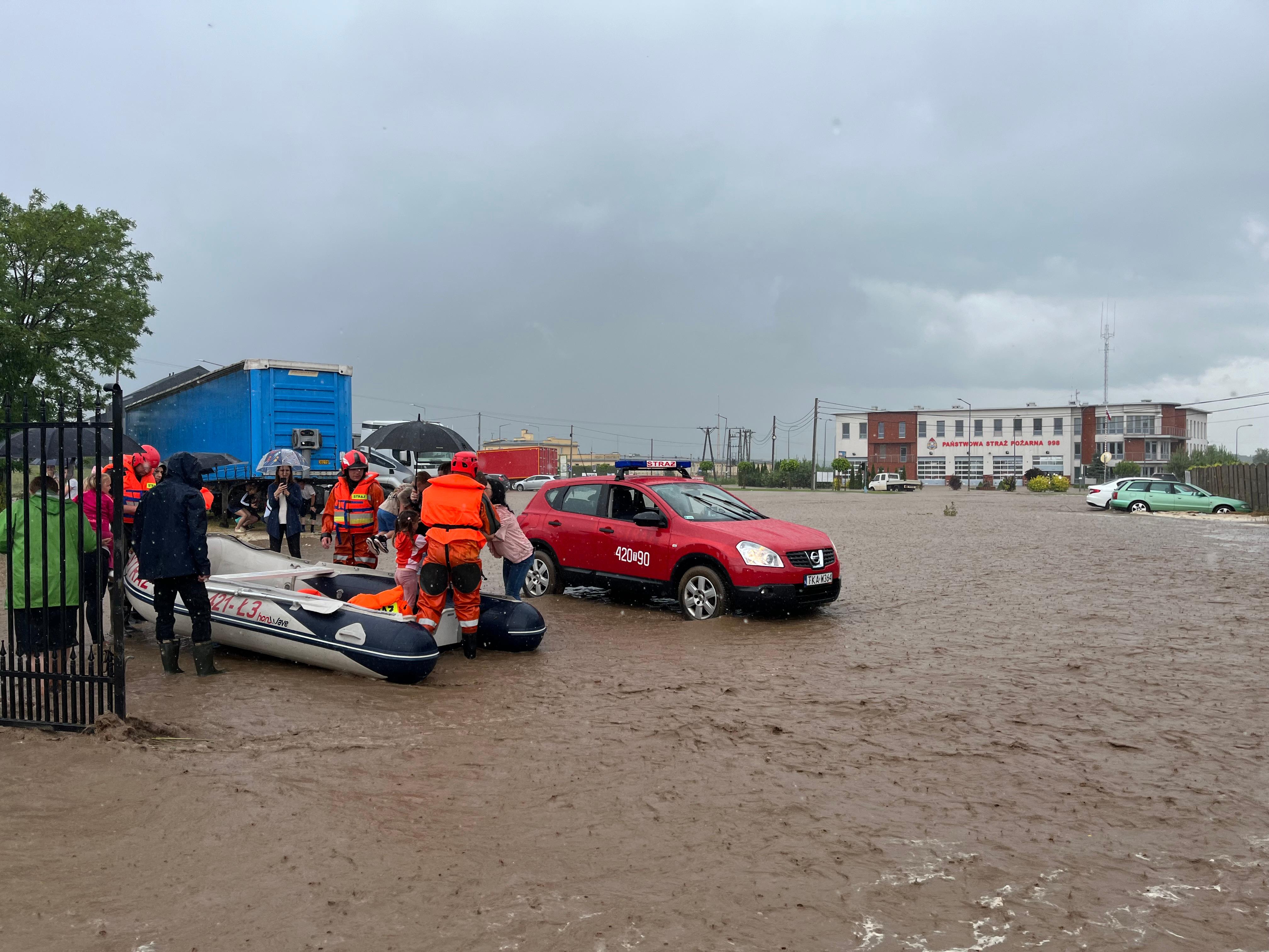 W dniu 10 czerwca 2024 r. od godz. 15:00 do Dyżurnego Stanowiska Kierowania Komendanta Powiatowego Państwowej Straży Pożarnej w Kazimierzy Wielkiej zaczęły wpływać liczne zgłoszenia o podtopieniach obiektów i posesji w miejscowościach Kazimierza Wielka i Topola. Bardzo szybki przybór wody spowodowały intensywne opady deszczu. Do usuwania skutków tych zdarzeń zadysponowane zostały zastępy z Jednostki Ratowniczo Gaśniczej w Kazimierzy Wielkiej oraz zastępy Ochotniczych Straży Pożarnych z terenu powiatu kazimierskiego. Działania Jednostek Ochrony Przeciwpożarowej polegały na zabezpieczaniu posesji i obiektów przed dalszym zalaniem oraz wypompowywaniu wody z budynków już podtopionych. Najintensywniejsze działania skupione były na ewakuacji osób z przedszkola i zabezpieczeniu KP PSP w Kazimierzy Wielkiej przed podtopieniem. Napływająca duża ilość wody zalała całkowicie drogę dojazdową do placówki przedszkola uniemożliwiając wydostanie się z jej terenu dzieciom i pracownikom. Ratownicy przy użyciu pontonu ewakuowali z terenu przedszkola w bezpieczne miejsce 52 osoby w tym 40 dzieci. Po zakończonej ewakuacji osób ratownicy przystąpili do wydobycia zatopionego samochodu znajdującego się częściowo na poboczu zalanej drogi dojazdowej do przedszkola. Pojazd za pomocą wciągarki został wyciągnięty i przemieszczony w bezpieczne miejsce. Dalsze działania zastępów polegały na usuwaniu skutków intensywnych opadów deszczu.