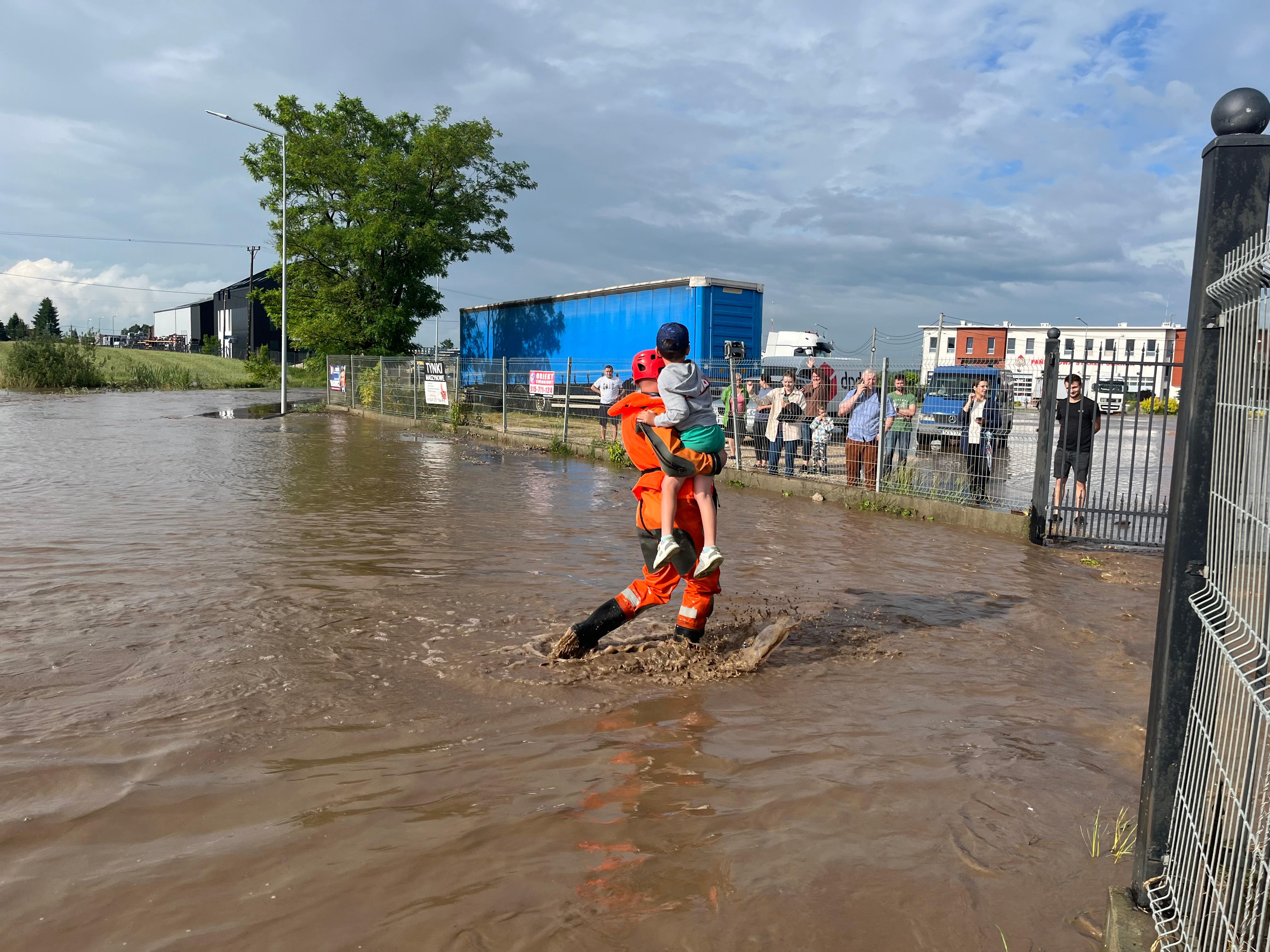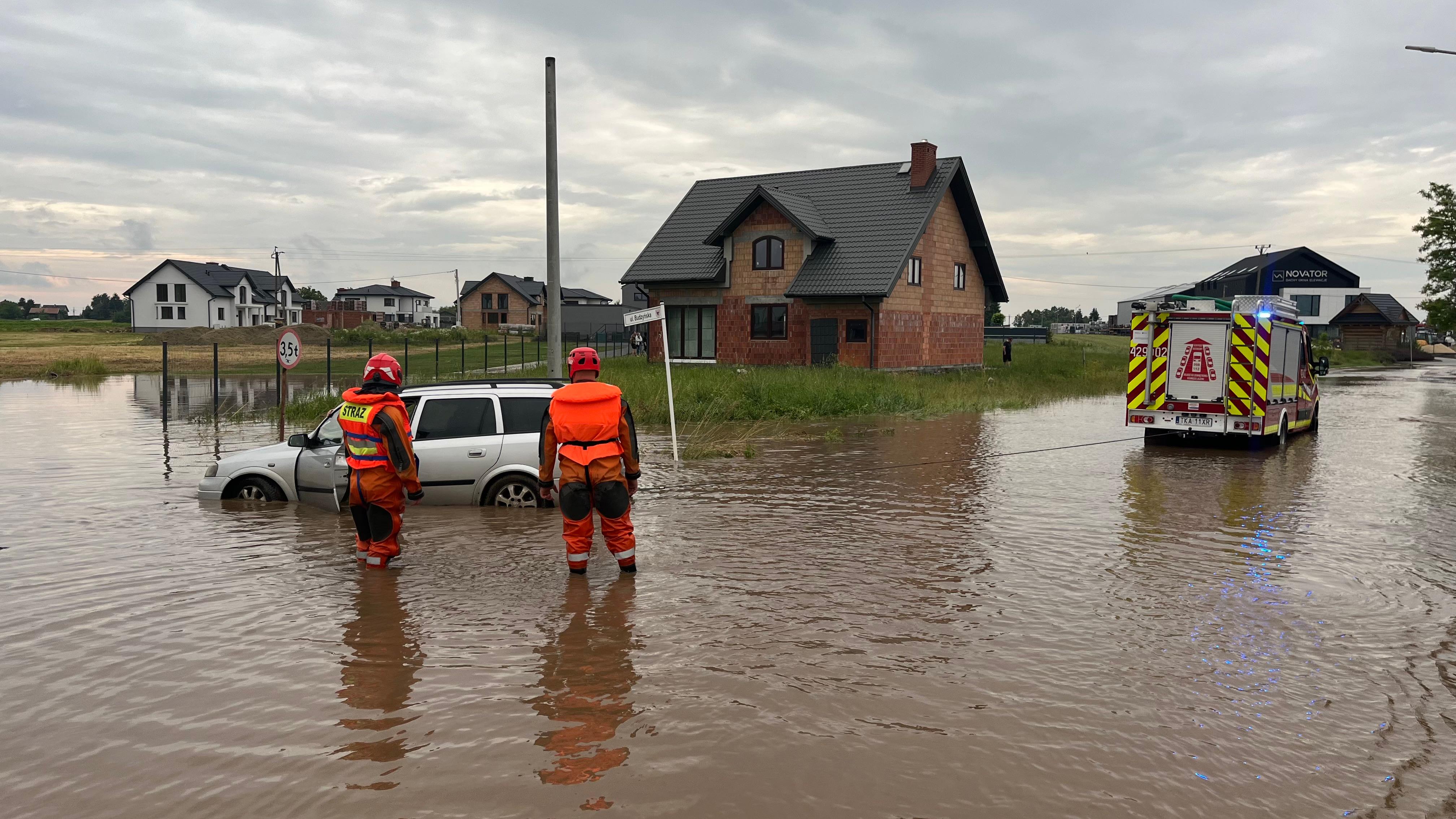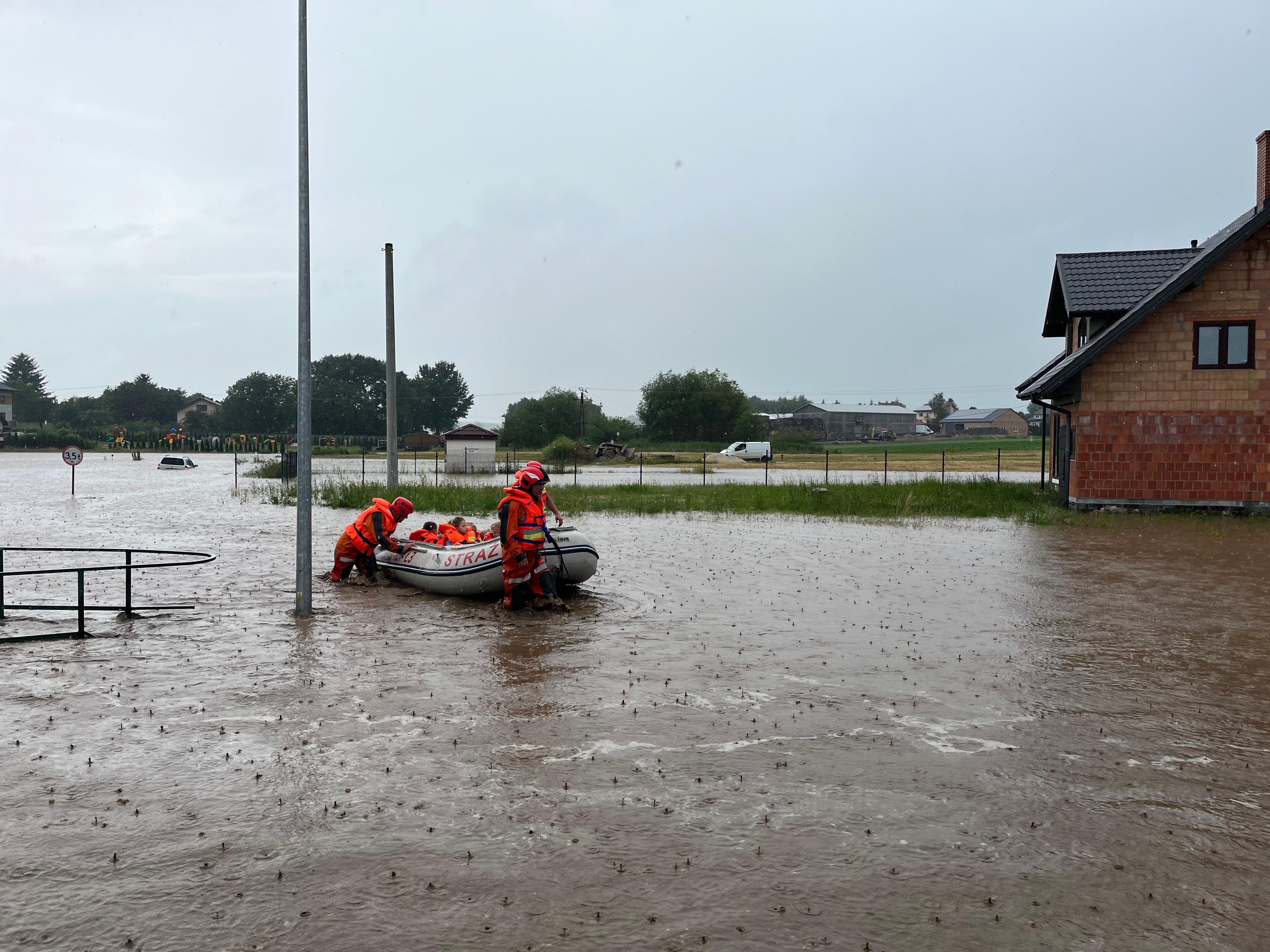 W dniu 10 czerwca 2024 r. od godz. 15:00 do Dyżurnego Stanowiska Kierowania Komendanta Powiatowego Państwowej Straży Pożarnej w Kazimierzy Wielkiej zaczęły wpływać liczne zgłoszenia o podtopieniach obiektów i posesji w miejscowościach Kazimierza Wielka i Topola. Bardzo szybki przybór wody spowodowały intensywne opady deszczu. Do usuwania skutków tych zdarzeń zadysponowane zostały zastępy z Jednostki Ratowniczo Gaśniczej w Kazimierzy Wielkiej oraz zastępy Ochotniczych Straży Pożarnych z terenu powiatu kazimierskiego. Działania Jednostek Ochrony Przeciwpożarowej polegały na zabezpieczaniu posesji i obiektów przed dalszym zalaniem oraz wypompowywaniu wody z budynków już podtopionych. Najintensywniejsze działania skupione były na ewakuacji osób z przedszkola i zabezpieczeniu KP PSP w Kazimierzy Wielkiej przed podtopieniem. Napływająca duża ilość wody zalała całkowicie drogę dojazdową do placówki przedszkola uniemożliwiając wydostanie się z jej terenu dzieciom i pracownikom. Ratownicy przy użyciu pontonu ewakuowali z terenu przedszkola w bezpieczne miejsce 52 osoby w tym 40 dzieci. Po zakończonej ewakuacji osób ratownicy przystąpili do wydobycia zatopionego samochodu znajdującego się częściowo na poboczu zalanej drogi dojazdowej do przedszkola. Pojazd za pomocą wciągarki został wyciągnięty i przemieszczony w bezpieczne miejsce. Dalsze działania zastępów polegały na usuwaniu skutków intensywnych opadów deszczu.