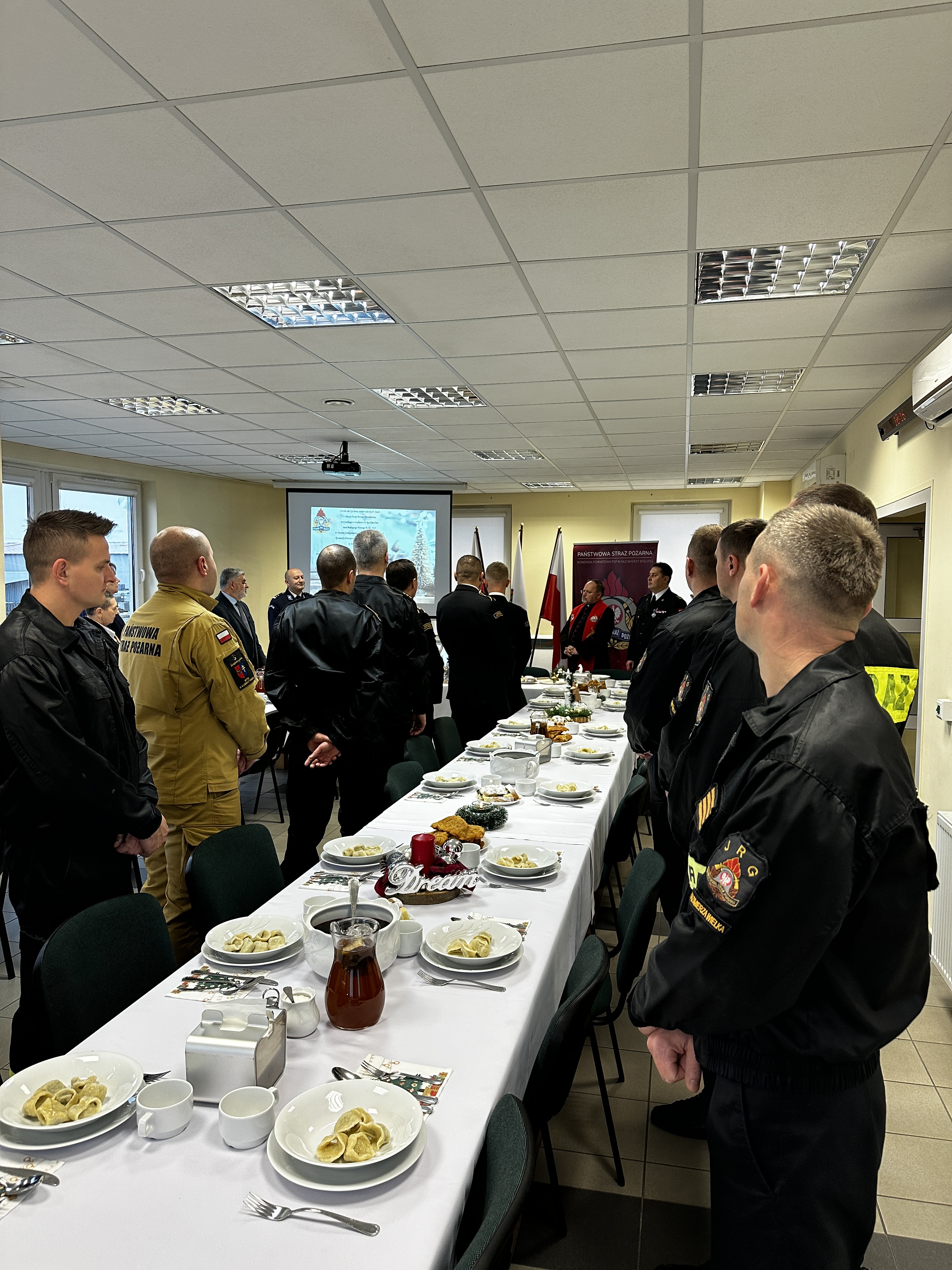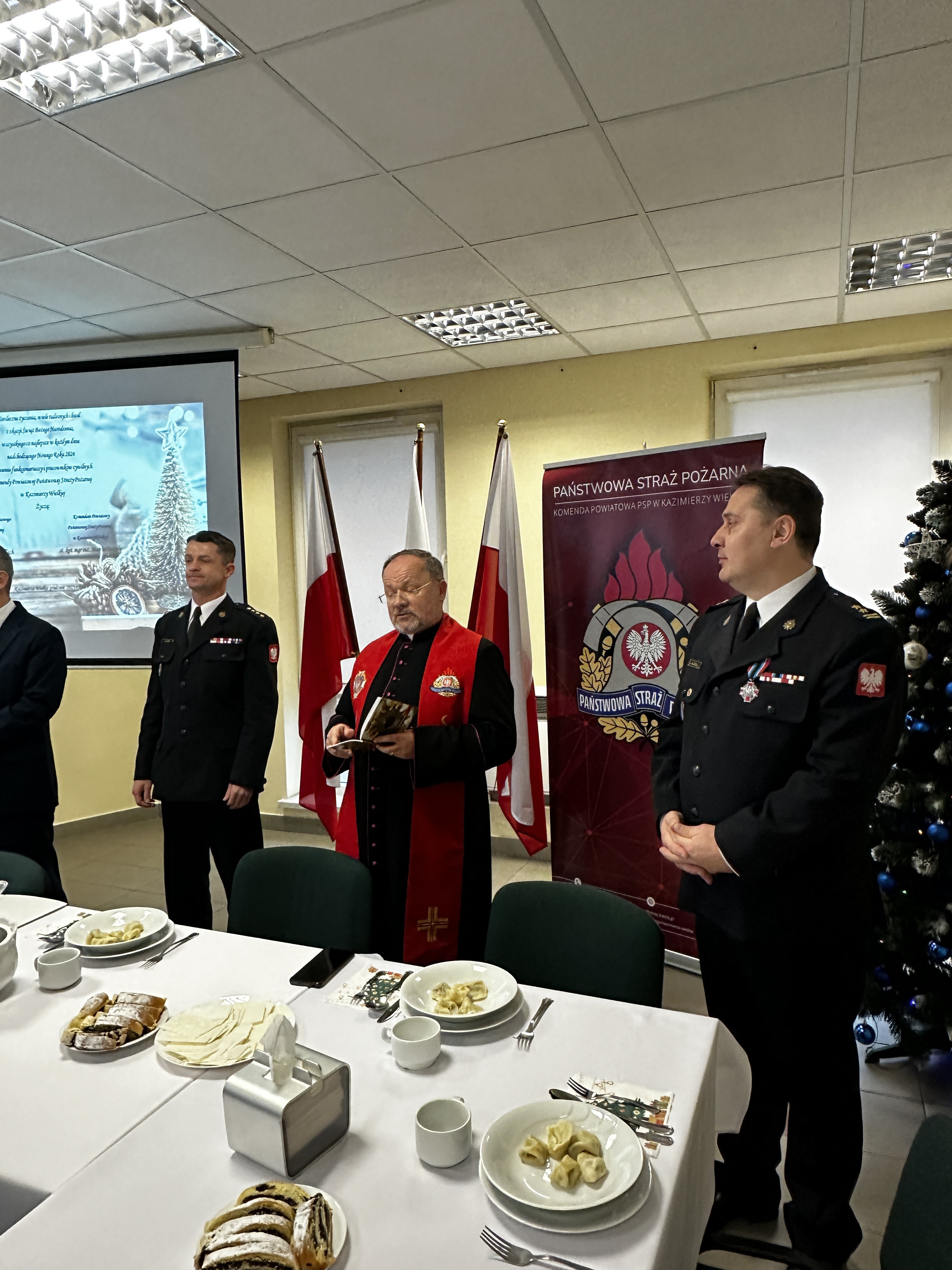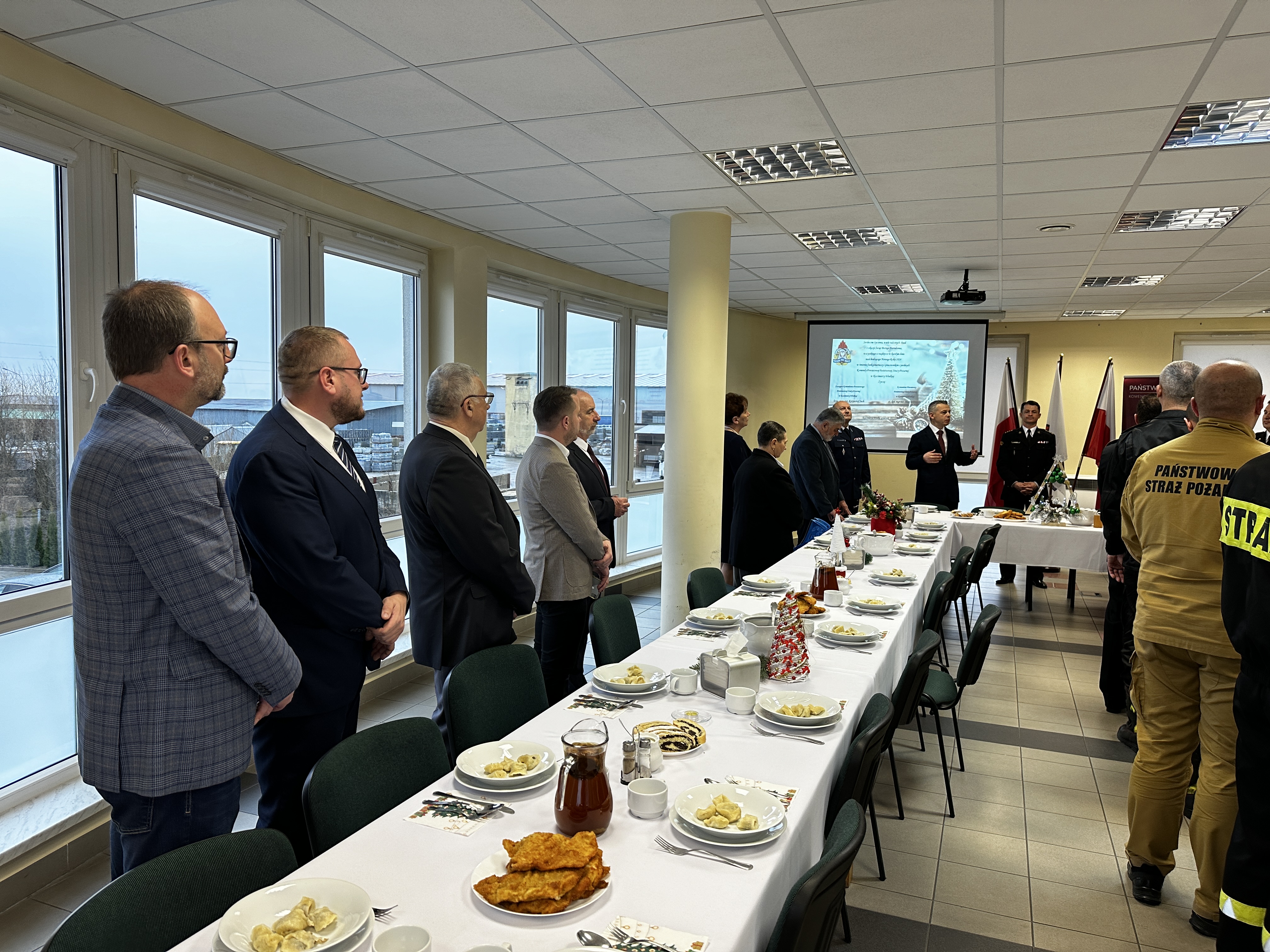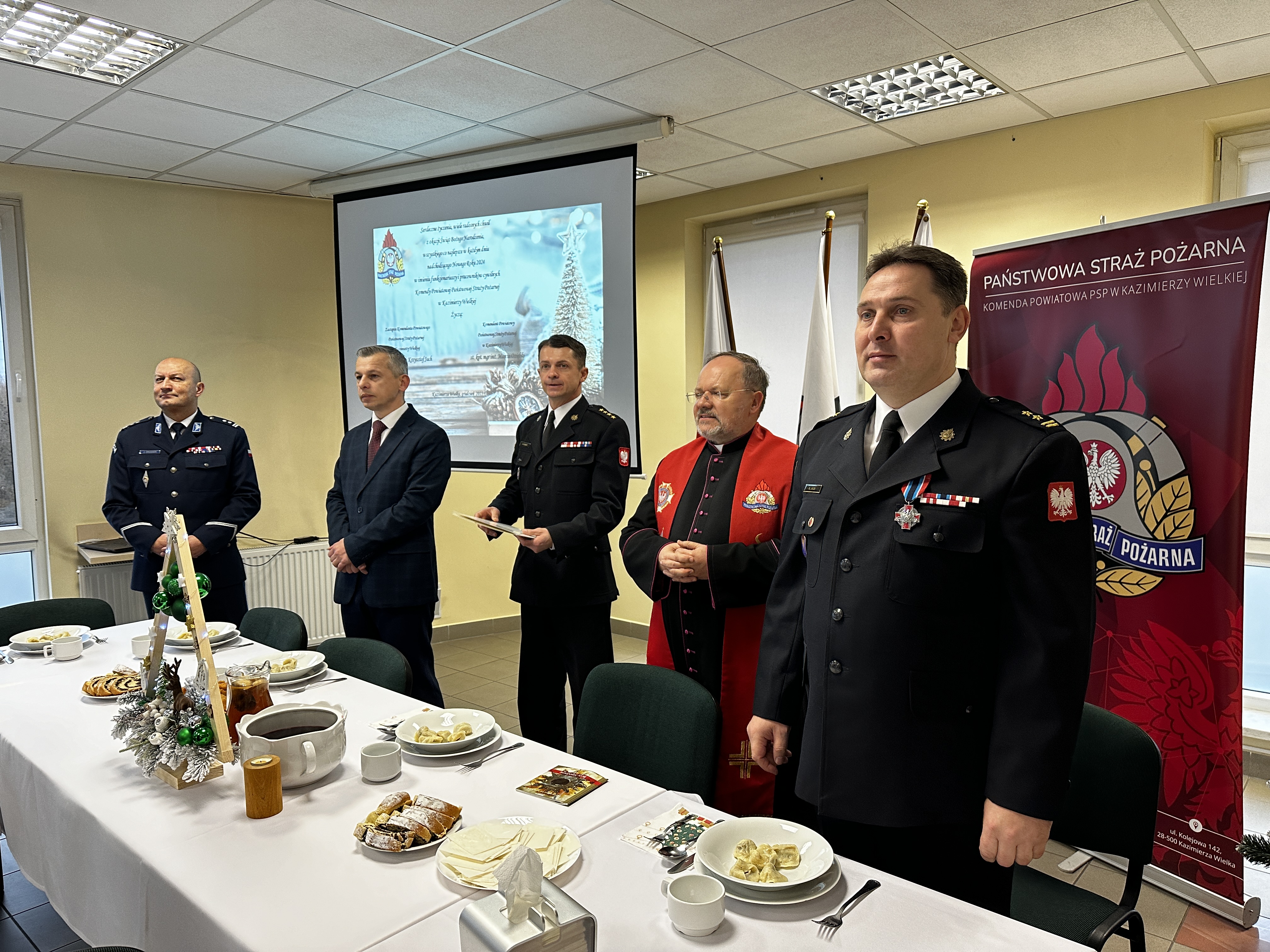 20 grudnia 2023 roku o godzinie 10:00, w sali konferencyjnej Komendy Powiatowej Państwowej Straży Pożarnej w Kazimierzy Wielkiej odbyło się spotkanie opłatkowe funkcjonariuszy i pracowników cywilnych. Stało się już tradycją, że przed każdymi świętami kazimierscy strażacy spotykają się, by złożyć sobie wzajemnie życzenia. Spotkanie rozpoczął Komendant Powiatowy PSP w Kazimierzy Wielkiej st. kpt. Marcin Oziębło, który w imieniu własnym oraz swojego Zastępcy bryg. Krzysztofa Jacha przywitał wszystkich strażaków, pracowników cywilnych i zaproszonych gości składając im i ich rodzinom życzenia zdrowych, spokojnych, radosnych i rodzinnych Świąt Bożego Narodzenia, a także dziękując za codzienny trud w służbie i w pracy. Uroczystość swoją obecnością zaszczycili znamienici goście: