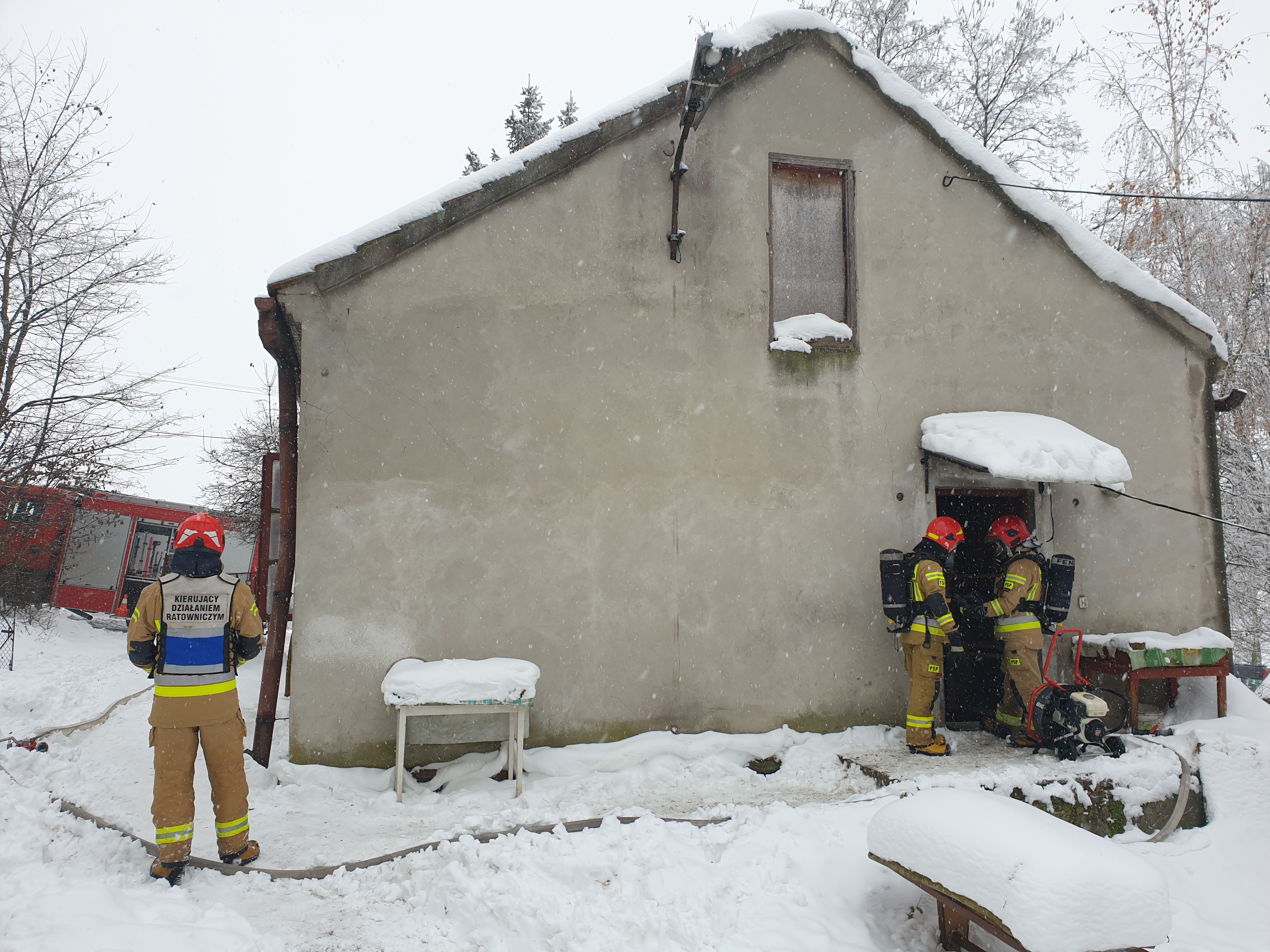 07 grudnia 2023 r. o godz. 12:49 Dyżurny Stanowiska Kierowania Komendanta Powiatowego Państwowej Straży Pożarnej w Kazimierzy Wielkiej otrzymał zgłoszenie o pożarze budynku mieszkalnego w miejscowości Nagórzanki. Do zdarzenia zadysponowano cztery zastępy z Jednostki Ratowniczo - Gaśniczej w Kazimierzy Wielkiej i zastęp OSP Łękawa z KSRG. Po przybyciu na miejsce zdarzenia w trakcie rozpoznania stwierdzono, że w budynku parterowym panuje bardzo duże zadymienie. Od zgłaszającego otrzymano informację, że w środku może znajdować się właściciel. Działania jednostek ochrony przeciwpożarowej polegały na zabezpieczeniu miejsca zdarzenia. Następnie ratownicy w sprzęcie ochrony układu oddechowego weszli do obiektu i podali jeden prąd wody w natarciu. Podjęte działania doprowadziły do zlokalizowania i całkowitego ugaszenia powstałego pożaru. W trakcie działań gaśniczych znaleziono na podłodze częściowo zwęglone ciało mężczyzny. Na miejsce zdarzenia przybył z-ca Komendanta Powiatowego PSP w Kazimierzy Wielkiej bryg. Krzysztof Jach, który przejął dowodzenie. Po zakończeniu działań gaśniczych budynek powtórnie przeszukano, oddymiono i sprawdzono za pomocą kamery termowizyjnej i detektorów wielogazowych - urządzenia nie wykazały zagrożenia. Dalsze czynności dochodzeniowe prowadzi Policja i przybyły na miejsce Prokurator.