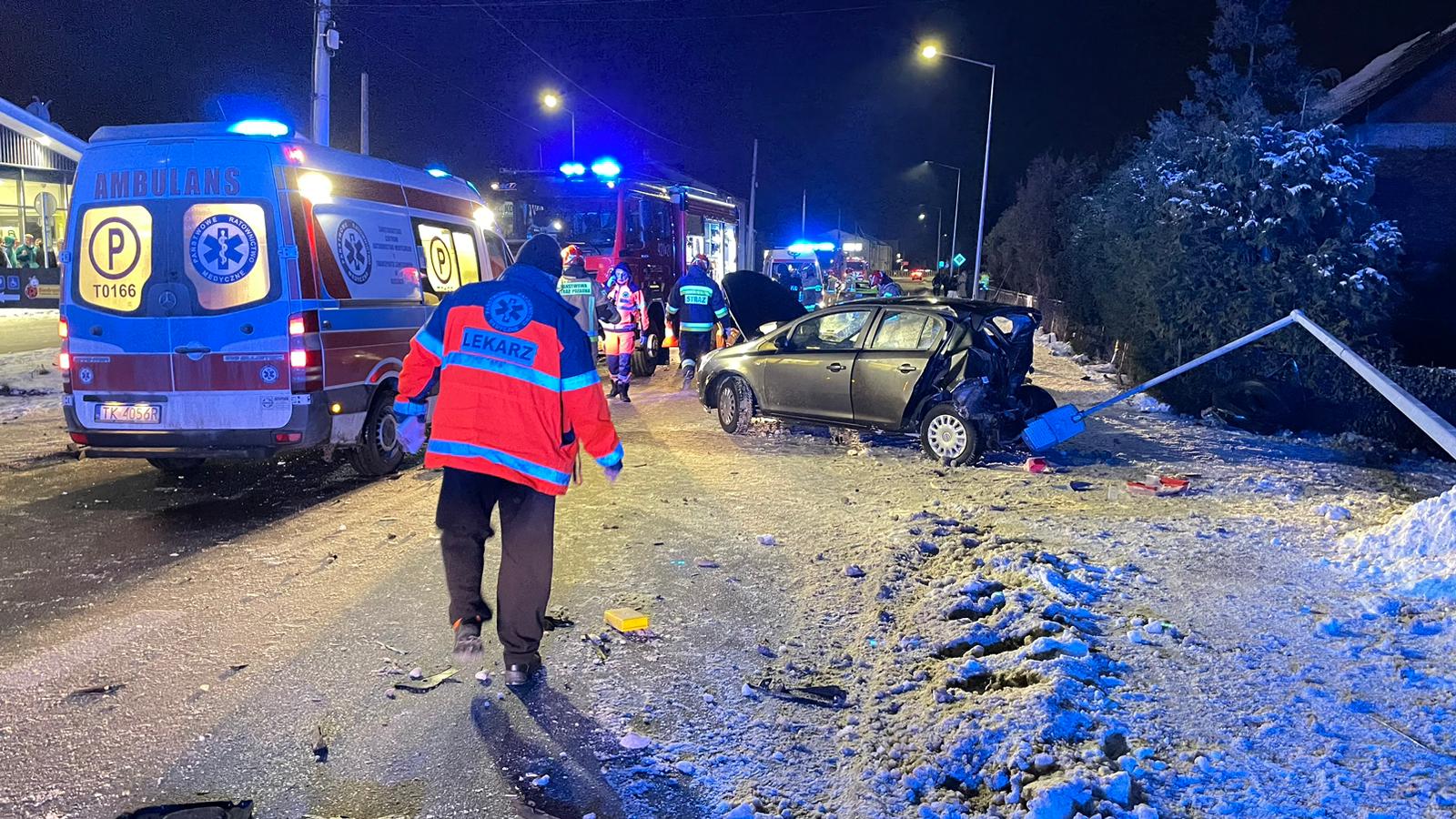 W dniu 19 stycznia 2024 r. o godz. 20:40 zastęp GBA-Rt z JRG Kazimierza Wielka jadący do zdarzenia w miejscowości Dalechowice (Pomoc Pogotowiu Ratunkowemu) natrafił na wypadek z udziałem dwóch samochodów osobowych na ulicy Kolejowej w Kazimierzy Wielkiej. Dyżurny Stanowiska Kierowania Komendanta Powiatowego Państwowej Straży Pożarnej dodatkowo zadysponował do zdarzenia jeden zastęp z JRG Kazimierza oraz zastęp OSP Topola z KSRG. Po przeprowadzeniu rozpoznania ustalono, że samochód Audi najechał na tył Opla. W chwili przybycia zastępów PSP w Audi znajdowało się trzech mężczyzn, a w oplu trzy kobiety. Działania jednostek ochrony przeciwpożarowej polegały na wykonaniu dostępu do kierującej i pasażerki opla. Z użyciem narzędzi hydraulicznych ewakuowano kobiety z uszkodzonego samochodu i przekazano do Zespołu Ratownictwa Medycznego. Pasażerka została zabrana karetką do szpitala w Proszowicach, natomiast kierująca została zabrana przez śmigłowiec Lotniczego Pogotowia Ratunkowego do szpitala w Krakowie. Mężczyzna kierujący Audi po przebadaniu został przewieziony do szpitala w Busku Zdroju. Pozostałe osoby nie uskarżały się na żadne dolegliwości. Na czas prowadzonych działań ratowniczych ruch na drodze został wstrzymany.