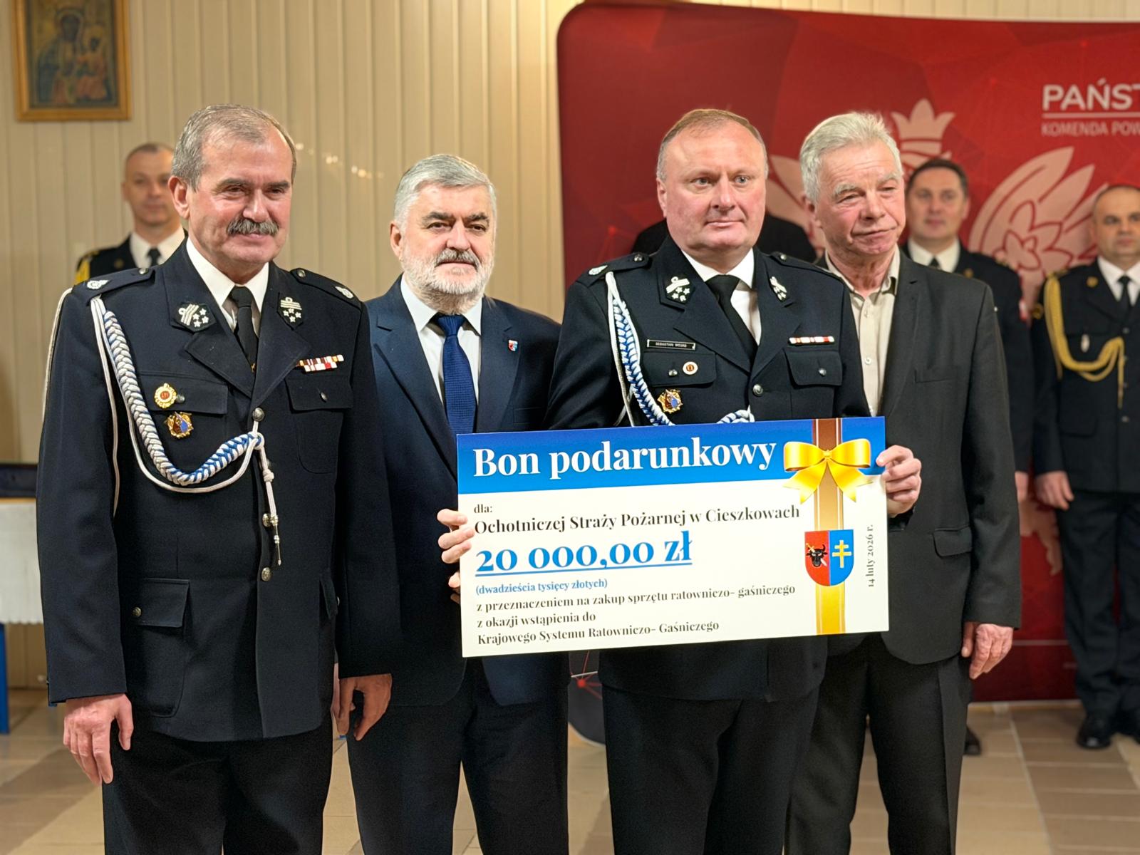W dniu 14 lutego 2026 roku o godz. 17:00 odbyła się uroczysta zbiórka z okazji włączenia jednostki OSP Cieszkowy do Krajowego Systemu Ratowniczo-Gaśniczego. Meldunek Z-cy Świętokrzyskiego Komendanta Wojewódzkiego PSP w Kielcach bryg. Piotrowi Wieczorkowi złożył dowódca uroczystości mł. kpt. Marcin Nowak. Zaproszonych gości przywitał Komendant Powiatowy PSP w Kazimierzy Wielkiej bryg. Krzysztof Jach. Uroczystość zaszczycili swoją obecnością : wicewojewoda świętokrzyski Michał Skotnicki, Zastępca Świętokrzyskiego Komendanta PSP bryg. Piotr Wieczorek, Jan Nowak - Prezes Zarządu Oddziału Powiatowego Związku Ochotniczych Straży Pożarnych RP w Kazimierzy Wielkiej, jednocześnie Starosta Powiatu Kazimierskiego, Jerzy Bojanowicz-Przewodniczący Rady Powiatu Kazimierskiego, Beata Buła -Prezes Zarządu Oddziału Gminnego Związku Ochotniczych Straży Pożarnych RP jednocześnie wójt gminy Czarnocin, Agata Wróbel - sekretarz gminy Czarnocin, Robert Lalewicz – dyrektor Szkoły Podstawowej im. Armii Krajowej w Cieszkowach, Józef Cetnarski – Komendant Gminny Ochotniczych Straży Pożarnych. W spotkaniu udział wzięli także druhowie OSP Cieszkowy i radni gminy Czarnocin.