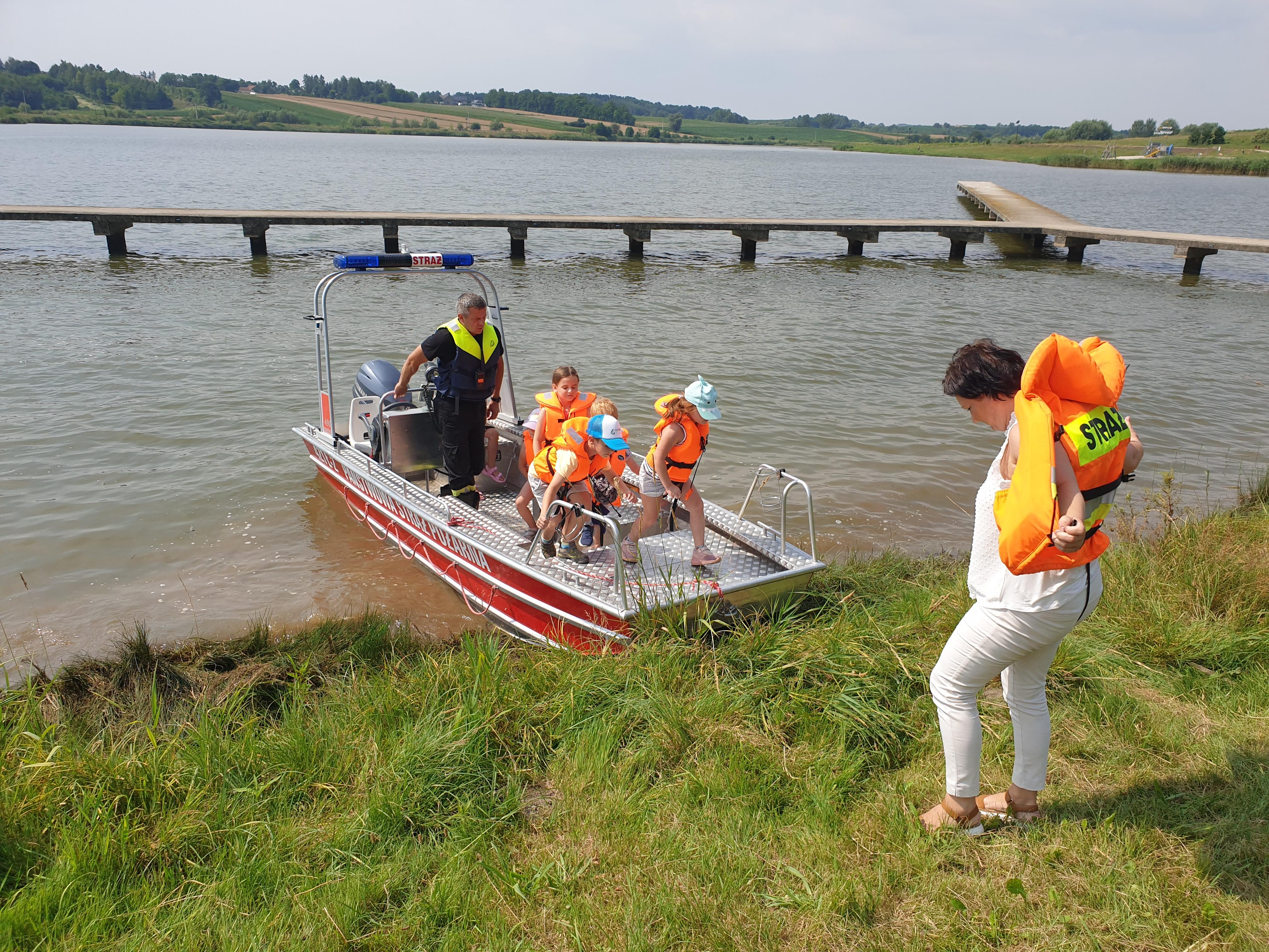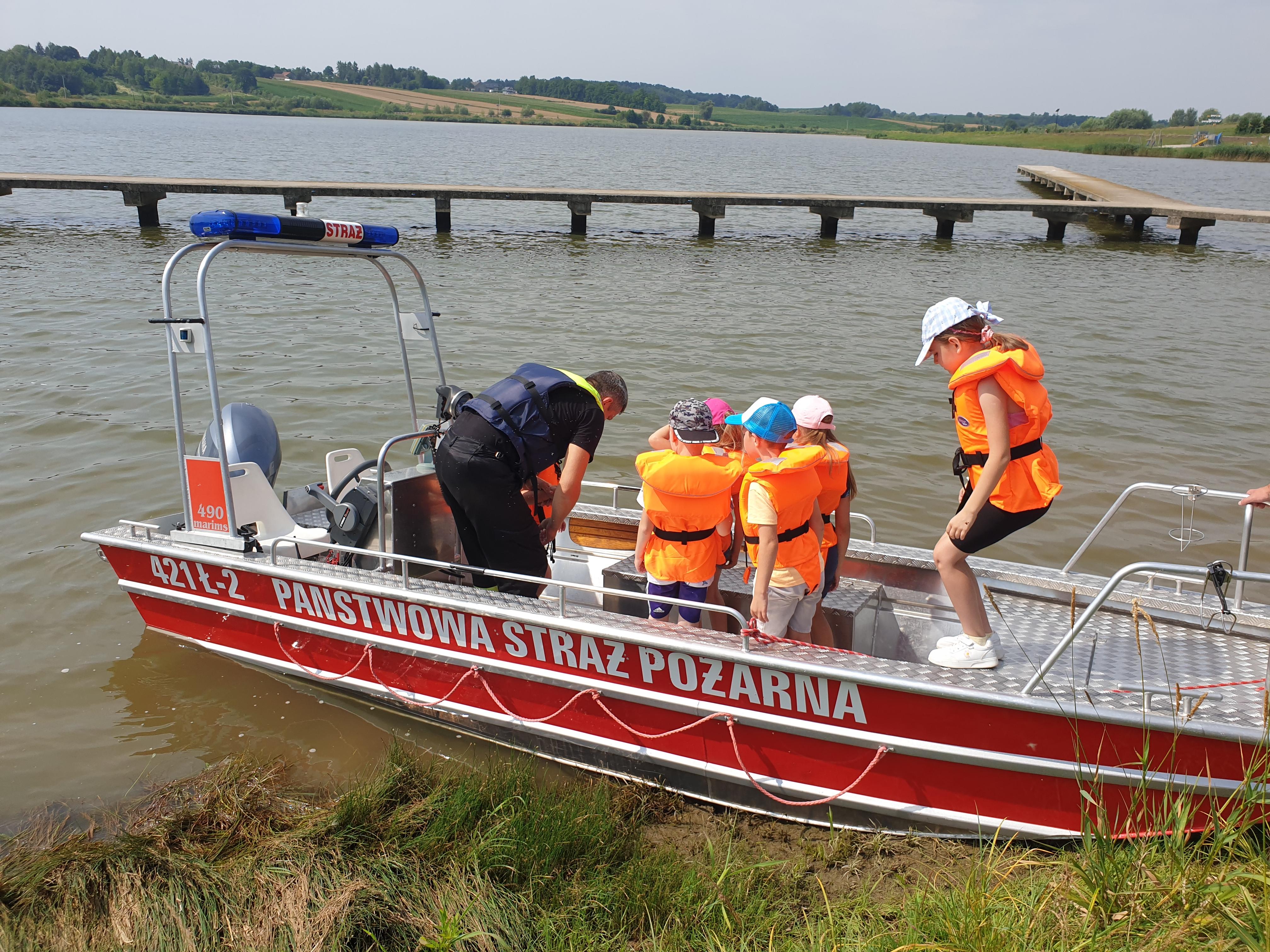 Wspólne patrole funkcjonariuszy Państwowej Straży Pożarnej i funkcjonariuszy Policji na kazimierskich akwenach wodnych oraz prelekcja dla dzieci „Bezpieczne wakacje nad wodą”