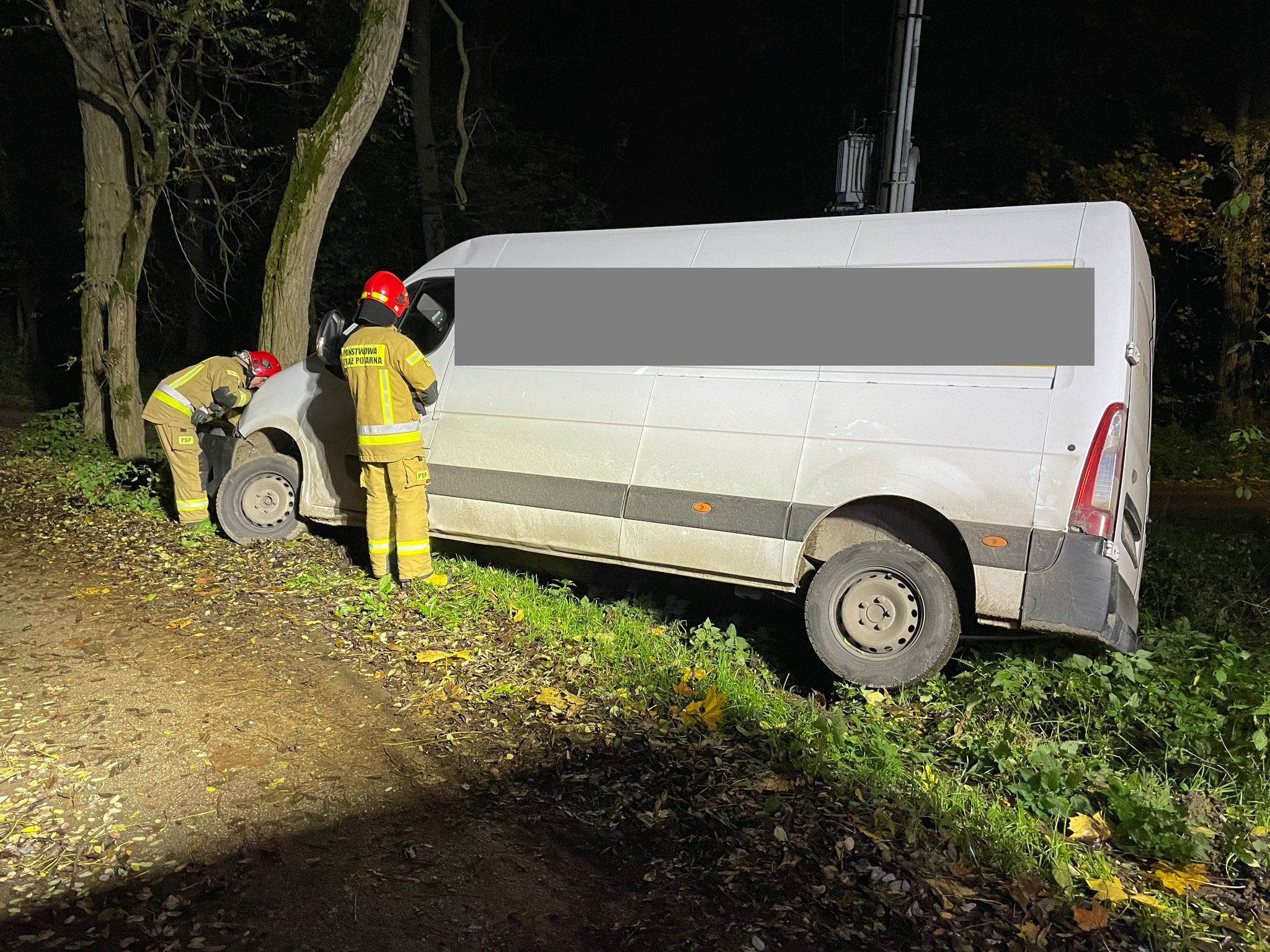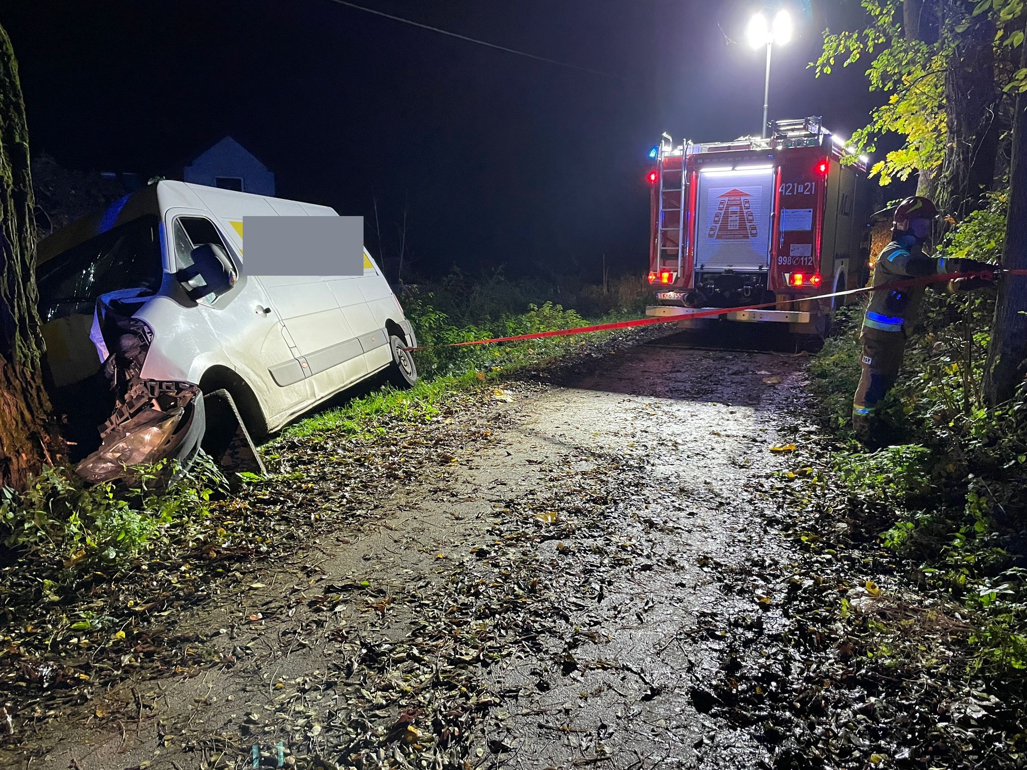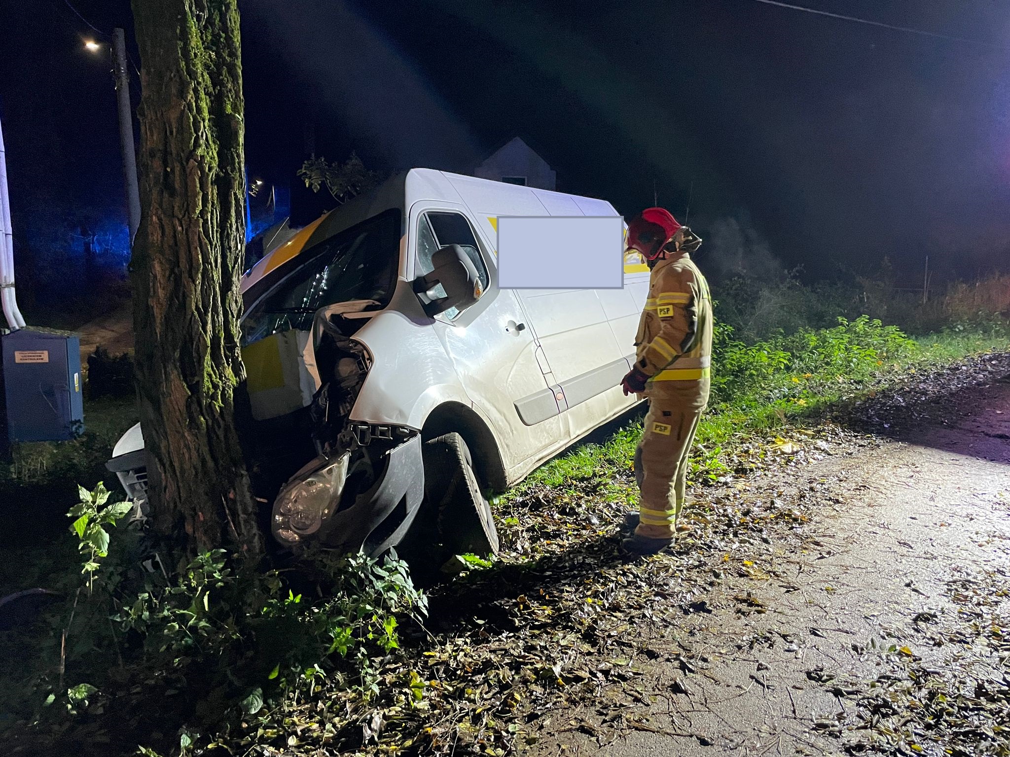 07 listopada 2023 r. o godz. 18:57 Dyżurny Stanowiska Kierowania Komendanta Powiatowego Państwowej Straży Pożarnej w Kazimierzy Wielkiej otrzymał zgłoszenie, że w miejscowości Boronice samochód dostawczy Renault Master wjechał na łuku drogi w drzewo. Do zdarzenia zadysponowano dwa zastępy z Jednostki Ratowniczo - Gaśniczej z Kazimierzy Wielkiej i jeden z OSP Łękawa z KSRG. Po przybyciu na miejsce zdarzenia w trakcie rozpoznania stwierdzono, że pojazd biorący udział w zdarzeniu znajduje się w pozycji na kołach. Samochodem podróżował tylko kierowca, który opuścił pojazd o własnych siłach przed przybyciem zastępów służb ratowniczych. Działania jednostek ochrony przeciwpożarowej polegały na oświetleniu i zabezpieczeniu miejsca zdarzenia oraz odcięciu zasilania elektrycznego w pojeździe. Pomocy medycznej poszkodowanemu udzielił przybyły równocześnie z zastępami Straży Pożarnej Zespół Ratownictwa Medycznego. Lekarz po przebadaniu poszkodowanego podjął decyzję o pozostawieniu go na miejscu zdarzenia. Kierujący pojazdem nie wymagał hospitalizacji. Na czas prowadzonych działań ruch na drodze gminnej został wstrzymany. Po wykonaniu wszystkich czynności dochodzeniowych przeprowadzonych przez Policję samochód został umieszczony na lawecie, a pozostałości powypadkowe uprzątnięte.