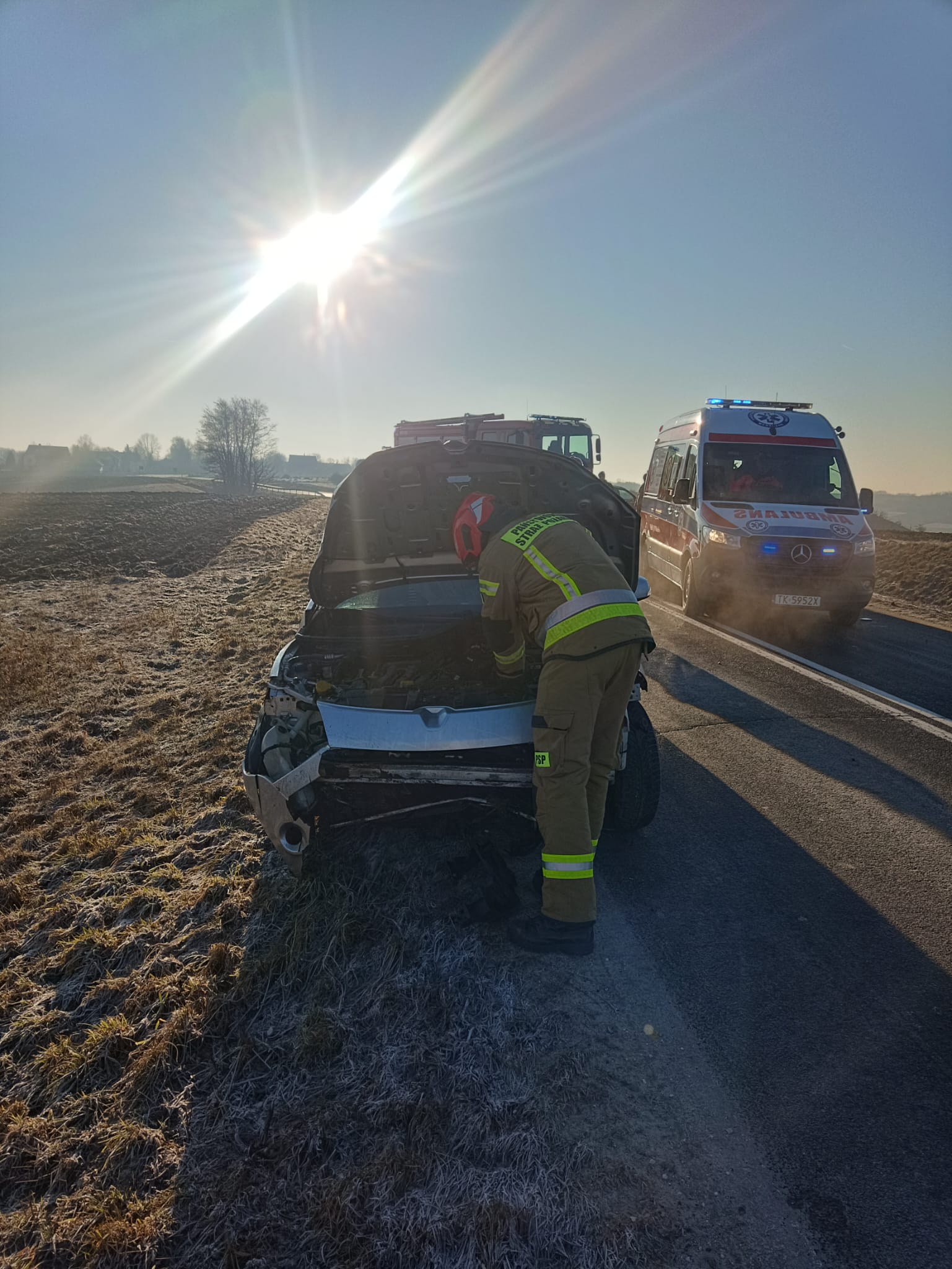 26 lutego 2026 r. o godz. 07:36 Dyżurny Stanowiska Kierowania Komendanta Powiatowego Państwowej Straży Pożarnej w Kazimierzy Wielkiej otrzymał zgłoszenie, że na drodze wojewódzkiej 770 znajduje się uszkodzony samochód, który wypadł z drogi i uderzył w przydrożny rów. Do zdarzenia zadysponowano trzy zastępy z Jednostki Ratowniczo - Gaśniczej z Kazimierzy Wielkiej oraz zastęp OSP Sokolina z KSRG. Pojazdem podróżowały dwie osoby, które w momencie dotarcia JOP znajdowały poza pojazdem. Decyzją ZRM kierowca został zabrany do szpitala w Busku Zdroju. Działania JOP polegały na zabezpieczeniu miejsca zdarzenia, odłączeniu źródła zasilania w pojeździe, zamknięciu zbiornika paliwa LPG, zebraniu uszkodzonych fragmentów auta oraz usunięciu pojazdu z drogi, tak aby nie stwarzał zagrożenia. Dodatkowo pojazd został sprawdzony wykrywaczem nieszczelności gazu LPG i kamerą termowizyjną - brak zagrożenia. Podczas działań ruch na drodze odbywał się wahadłowo.