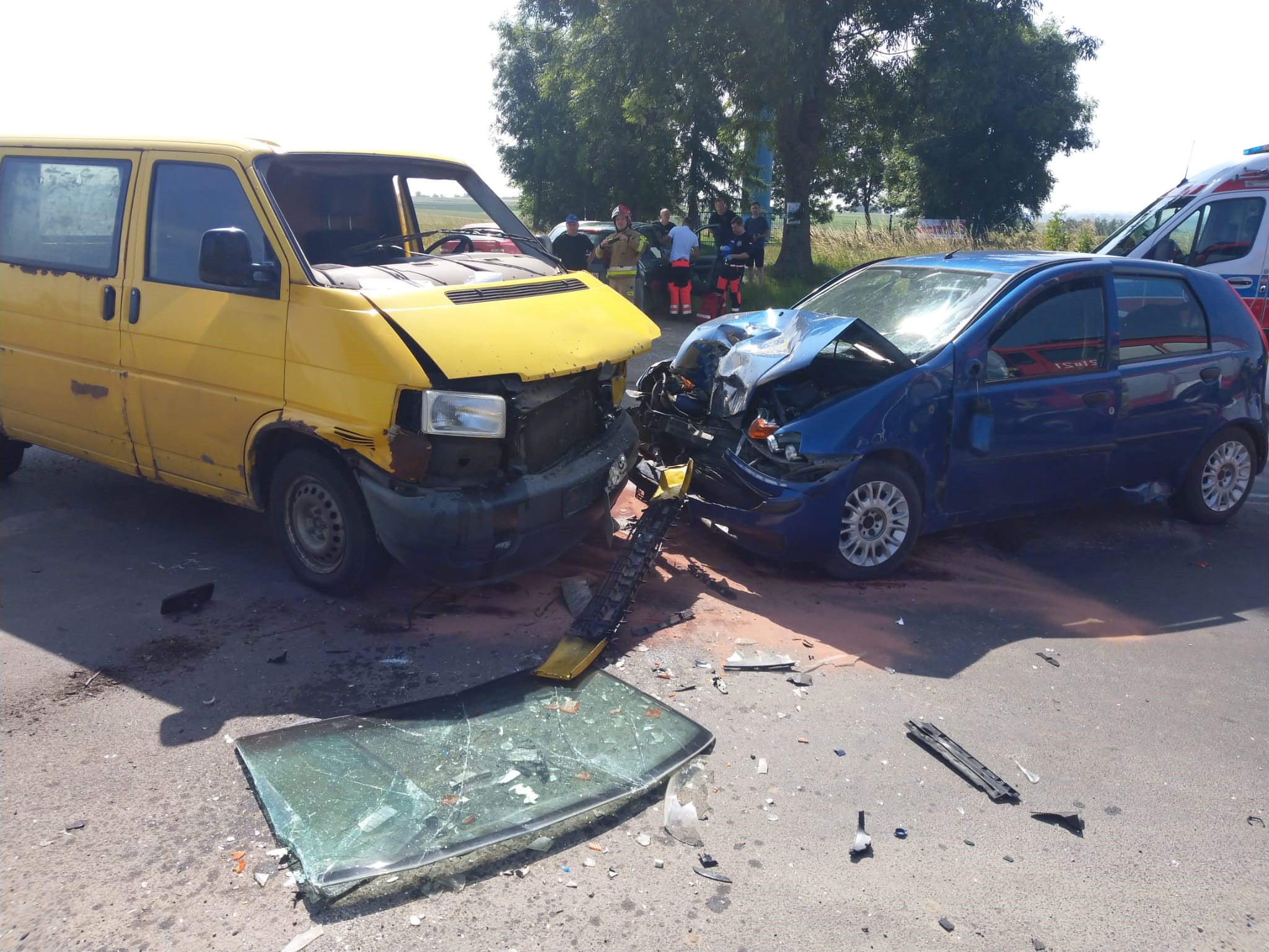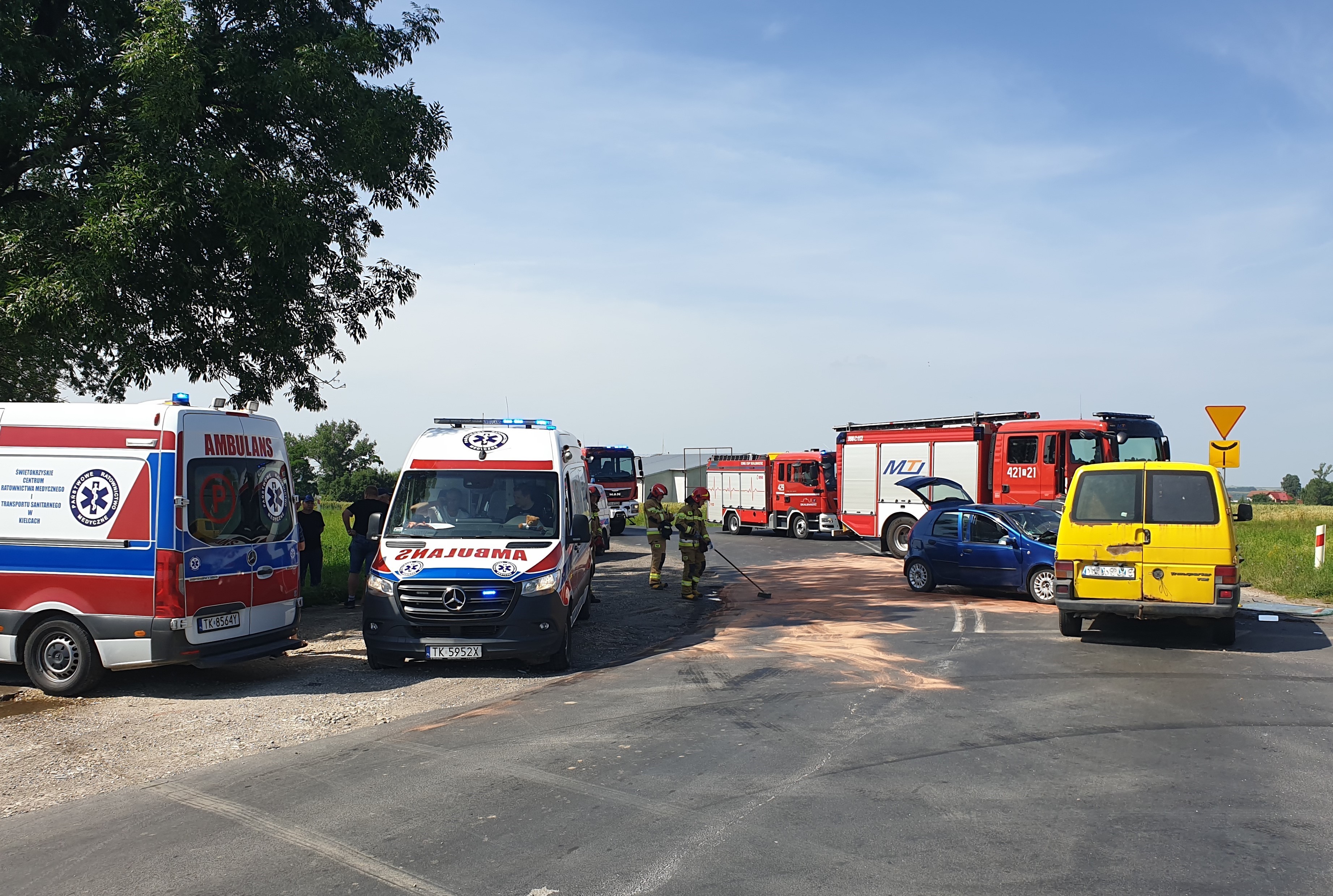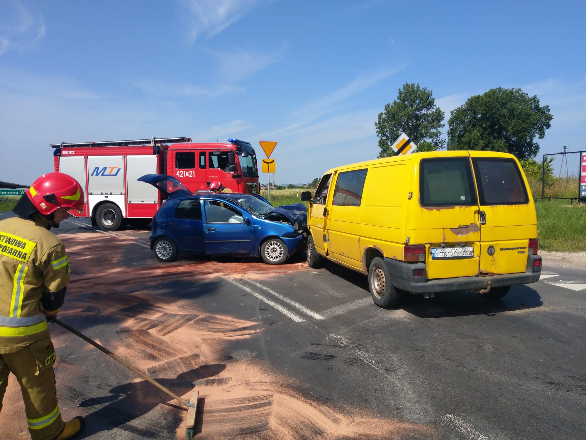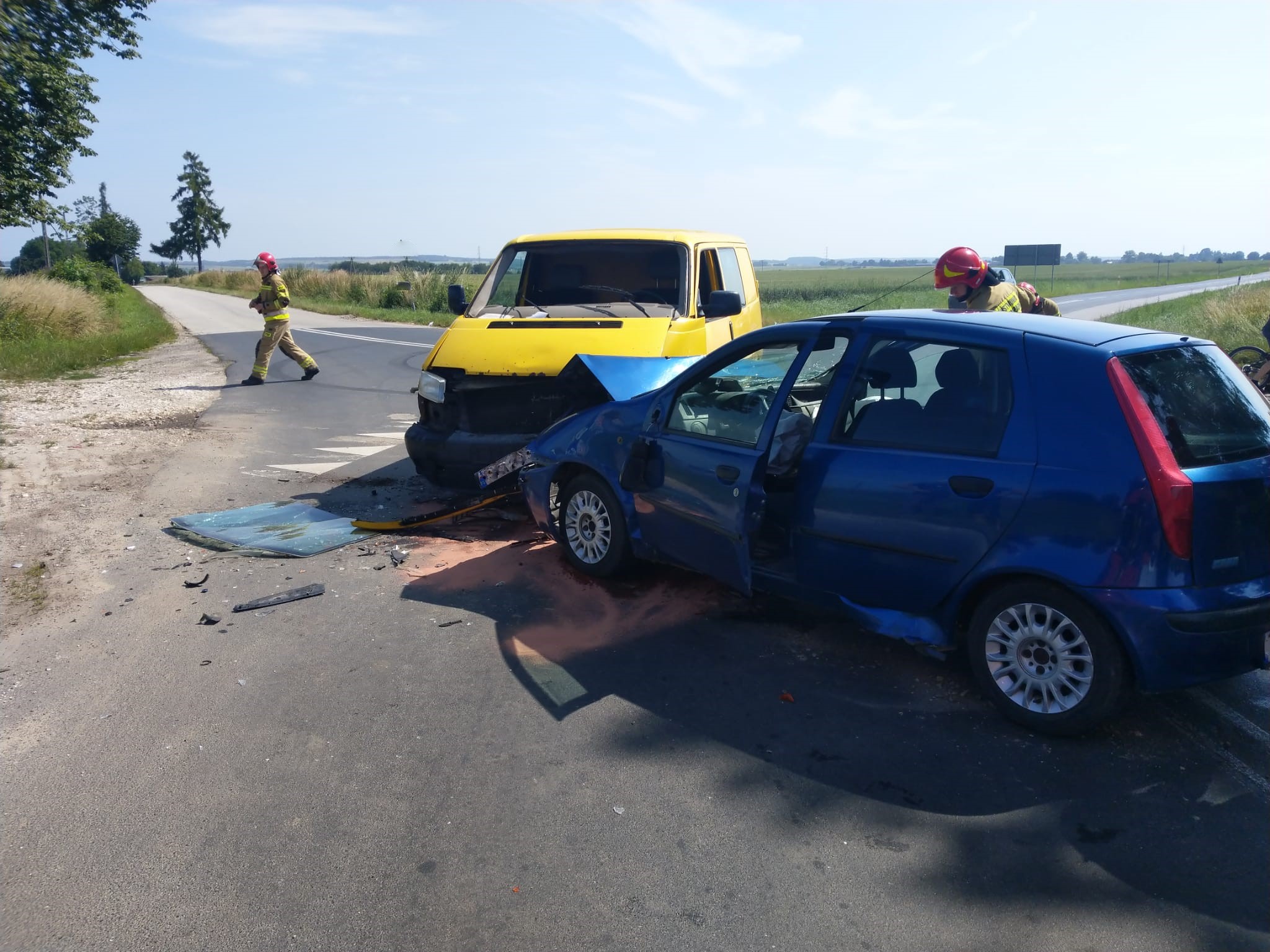 04 lipca 2023 r. o godz. 09:53 Dyżurny Stanowiska Kierowania Komendanta Powiatowego Państwowej Straży Pożarnej w Kazimierzy Wielkiej otrzymał zgłoszenie o zderzeniu samochodu osobowego z samochodem dostawczym na drodze wojewódzkiej nr 770 w miejscowości Drożejowice. Do zdarzenia zadysponowano dwa zastępy z Jednostki Ratowniczo - Gaśniczej w Kazimierzy Wielkiej oraz zastęp OSP Skalbmierz z KSRG. Po przybyciu na miejsce zdarzenia w trakcie rozpoznania stwierdzono, że pojazdy znajdują się w pozycji na kołach i blokują całkowicie przejazd drogą wojewódzką. Samochodami podróżowali tylko kierowcy, którymi zajęły się dwa zespoły ratownictwa medycznego (ZRM) przybyłe na miejsce zdarzenia razem z zastępami jednostek ochrony przeciwpożarowej. Działania zastępów straży pożarnej polegały na zabezpieczeniu miejsca zdarzenia, odcięciu źródeł zasilania elektrycznego w obu pojazdach oraz zakręceniu zaworu butli LPG w samochodzie osobowym. Po przebadaniu obu kierowców lekarz przybyłego na miejsce ZRM podjął decyzje o przetransportowaniu jednego z nich do szpitala, natomiast drugi pozostał na miejscu (nie wymagał hospitalizacji). Po wykonaniu wszystkich czynności dochodzeniowych przeprowadzonych przez techników Policji samochody usunięto z jezdni tak, aby nie stwarzały zagrożenia dla innych uczestników. Rozlane płyny eksploatacyjne zostały usunięte przy pomocy sorbentu.