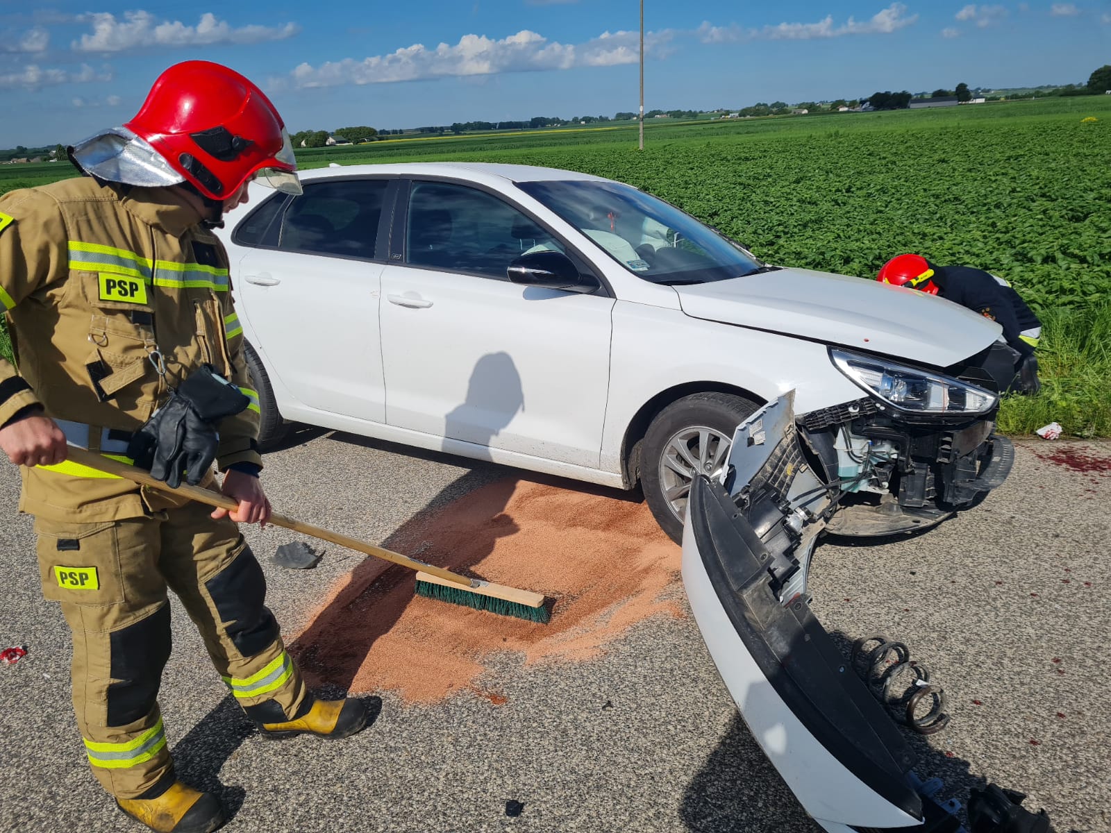 31 maja około godz.07:46 do stanowiska kierowania komendanta powiatowego w Kazimierzy Wielkiej wpłynęło zgłoszenie o wypadku drogowym w miejscowości Kocina na drodze powiatowej nr 0135T. W zdarzeniu brały udział samochody osobowe marki Honda Civic oraz Hyundai i30 . Do zdarzenia dyżurny SK KP w Kazimierzy Wielkiej zadysponował jeden zastęp z Jednostki Ratowniczo - Gaśniczej z Kazimierzy Wielkiej oraz jeden zastęp z jednostki OSP Kocina z KSRG. Po przybyciu na miejsce zdarzenia i wykonaniu rozpoznania Kierujący Działaniem Ratowniczym ustalił, że samochody te znajdują się w pozycji na kołach i jeden z nich blokuje pas jezdni. Na miejscu przed przybyciem zastępów jednostek ochrony przeciwpożarowej Zespół Ratownictwa Medycznego udzielał pomocy uczestnikom zdarzenia. W samochodzie Honda Civic podróżowały dwie osoby, natomiast w samochodzie Hyundai jedna osoba. Decyzją Zespołu Ratownictwa Medycznego wszyscy uczestnicy zdarzenia, z wyjątkiem pasażerki samochodu Honda, zostali zabrani na dalsze badania do szpitala w Busku Zdroju. Działania jednostki ochrony przeciwpożarowej polegały na zabezpieczeniu miejsca zdarzenia, odcięciu źródła zasilania elektrycznego w pojazdach oraz sorpcji rozlanych płynów eksploatacyjnych. Po wykonaniu wszystkich czynności dochodzeniowych przeprowadzonych przez Policję wraki samochodów zostały usunięte przez Pomoc Drogową. W działaniach trwających blisko 4 godziny brały udział: 2 zastępy straży pożarnej (9 strażaków), 4 radiowozy Policji oraz 2 karetki pogotowia.