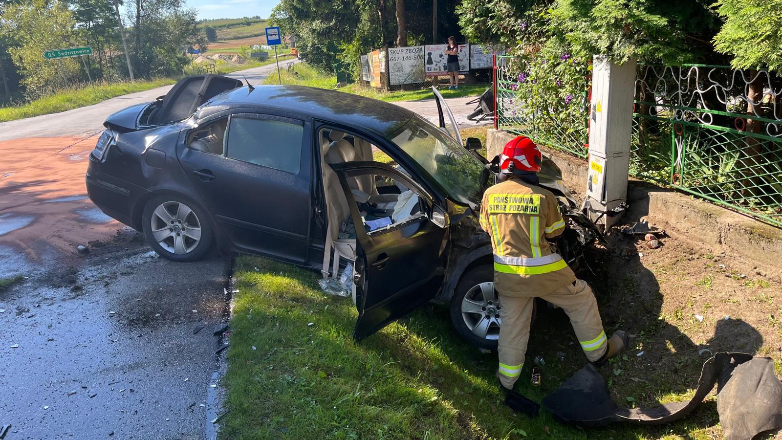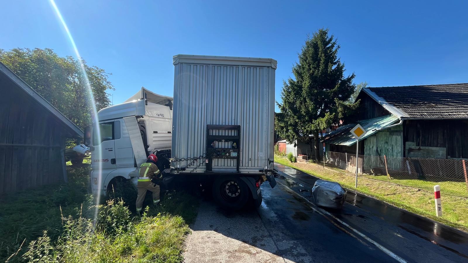 7 sierpnia 2024 r. o godz. 08:53 dyżurny Stanowiska Kierowania Komendanta Powiatowego Państwowej Straży Pożarnej w Kazimierzy Wielkiej otrzymał zgłoszenie, że na skrzyżowaniu drogi wojewódzkiej z drogą powiatową w miejscowości Prokocice doszło do zderzenia dwóch samochodów: osobowego – Skoda Octavia i ciągnika siodłowego MAN z naczepą. Do zdarzenia zadysponowano dwa zastępy z Jednostki Ratowniczo - Gaśniczej w Kazimierzy Wielkiej oraz dwa zastępy Ochotniczych Straży Pożarnych włączonych do Krajowego Systemu Ratowniczo - Gaśniczego: OSP Sędziszowice oraz OSP Zagórzyce. Samochód osobowy znajdował się w pozycji na kołach w przydrożnym rowie. Ciągnik siodłowy znajdował się całkowicie w rowie natomiast jego naczepa na jezdni blokując jeden pas drogi wojewódzkiej. W wyniku zderzenia w samochodzie ciężarowym uszkodzony został zbiornik paliwa, z którego wylało się na jezdnię około 500 litrów oleju napędowego. W chwili przybycia Jednostek Ochrony Przeciwpożarowej wszyscy uczestnicy zdarzenia znajdowali się poza pojazdami - wyszli o własnych siłach. Po przebadaniu uczestników zdarzenia (trzy osoby) lekarz podjął decyzję o pozostawieniu ich na miejscu. Działania zastępów polegały na zabezpieczeniu miejsca zdarzenia, odłączeniu źródła zasilania elektrycznego w pojazdach, zebraniu z jezdni oleju napędowego przy pomocy sorbentu oraz usunięciu pojazdów w bezpieczne miejsce. W trakcie prowadzonych działań ruch na drodze wojewódzkiej odbywał się wahadłowo.