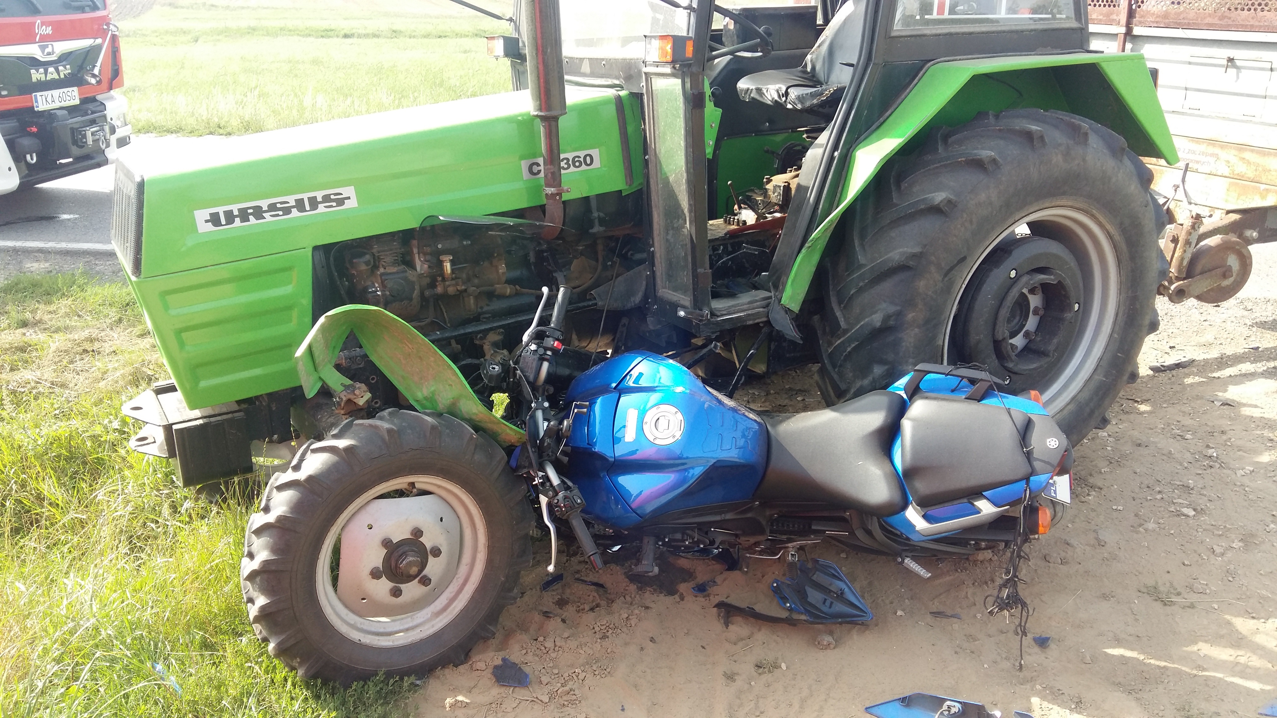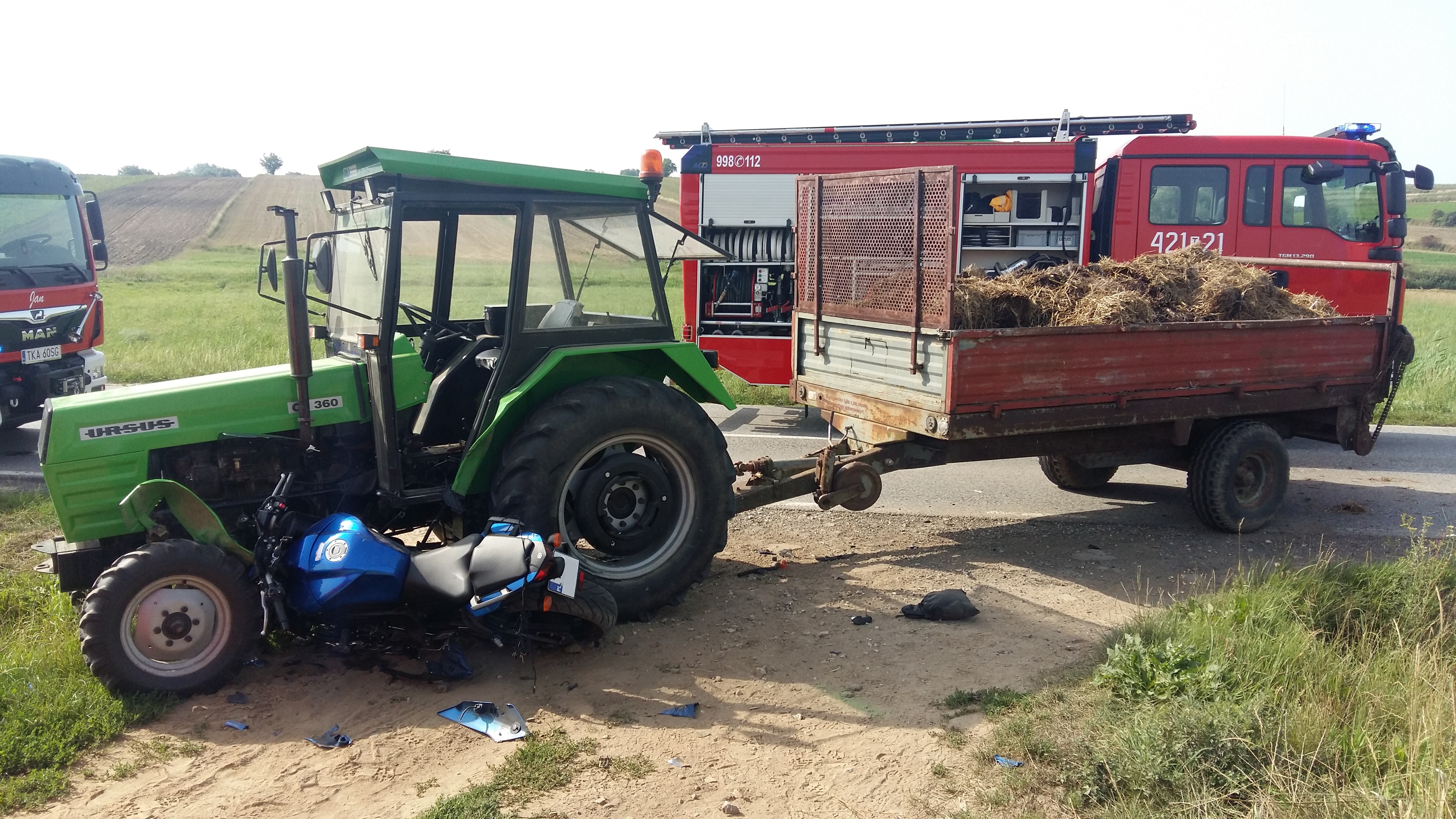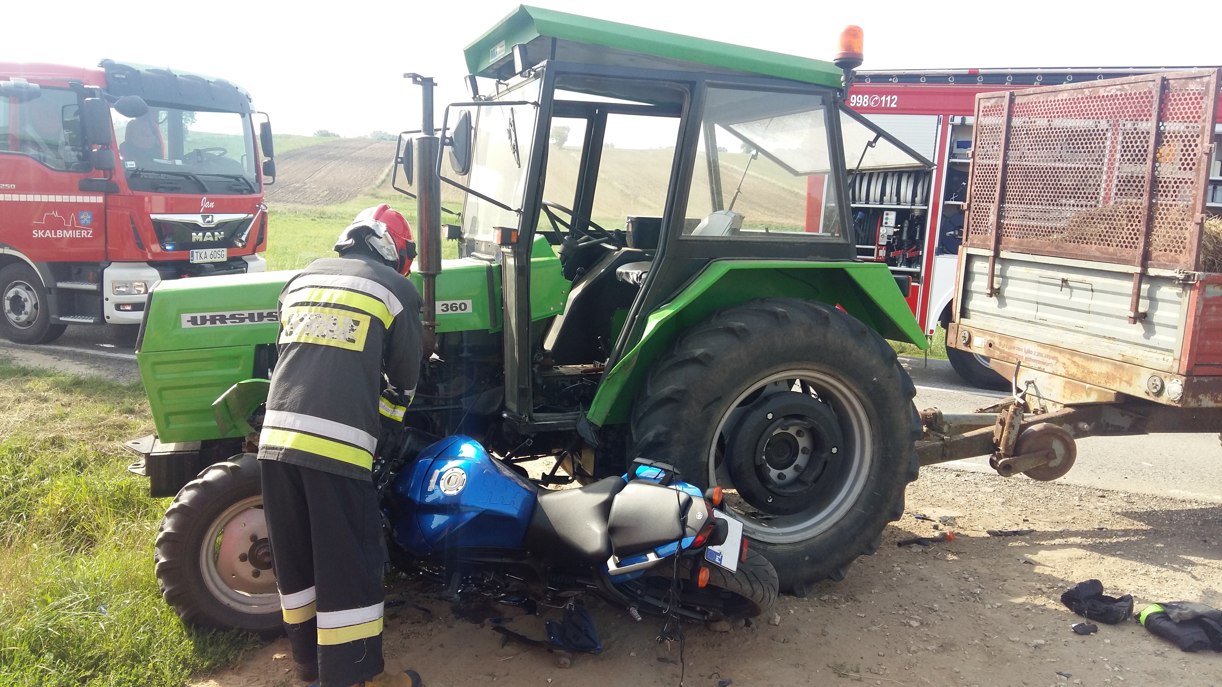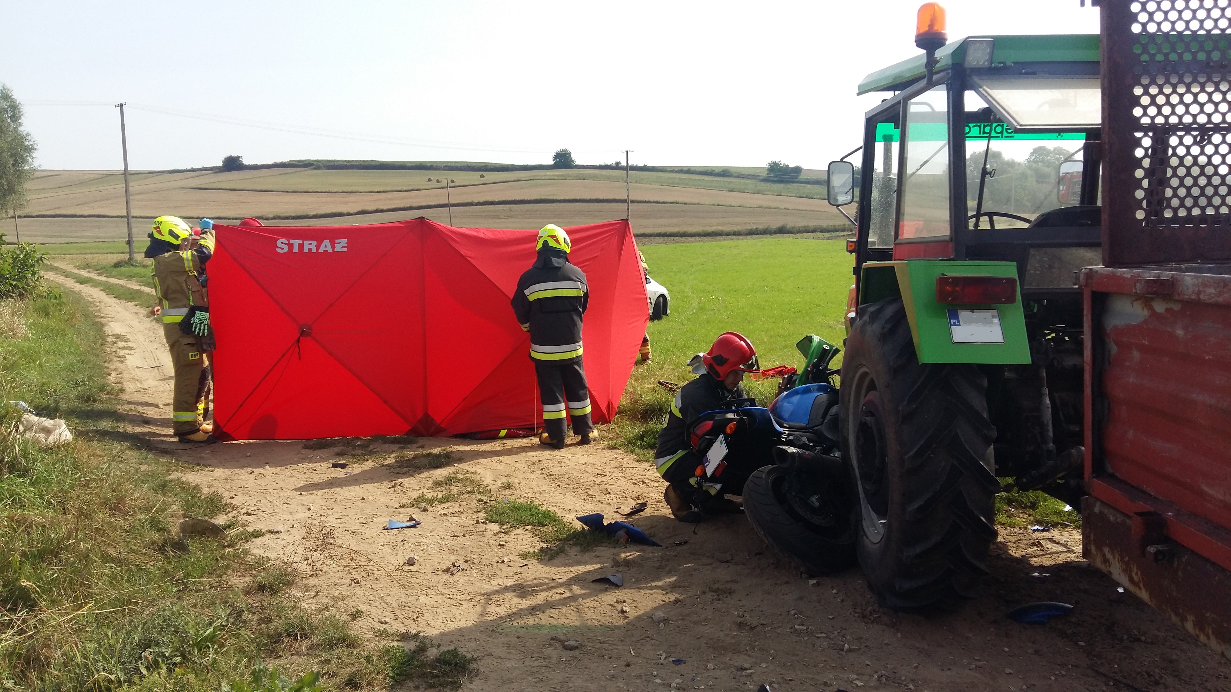 19 sierpnia 2022 r. o godz. 9:26 Dyżurny Stanowiska Kierowania Komendanta Powiatowego Państwowej Straży Pożarnej w Kazimierzy Wielkiej otrzymał zgłoszenie o zderzeniu motocykla Yamaha z ciągnikiem rolniczym Ursus C360 w miejscowości Rosiejów na drodze wojewódzkiej 783. Do zdarzenia zadysponowano cztery zastępy z Jednostki Ratowniczo - Gaśniczej z Kazimierzy Wielkiej oraz dwa zastępy z OSP Skalbmierz. Po przybyciu na miejsce zdarzenia w trakcie rozpoznania stwierdzono, że motocykl uderzył w bok ciągnika rolniczego. Pojazdy blokowały jeden pas ruchu. Działania jednostek ochrony przeciwpożarowej polegały na zabezpieczeniu miejsca zdarzenia, odcięciu zasilania elektrycznego w pojazdach i udzieleniu kierowcy kwalifikowanej pierwszej pomocy (KPP) do czasu przybycia na miejsce zdarzenia Zespołu Ratownictwa Medycznego (ZRM). W wyniku odniesionych obrażeń lekarz ZRM stwierdził zgon motocyklisty. Po wykonaniu wszystkich czynności dochodzeniowych przeprowadzonych przez Policję pojazdy usunięto z jezdni aby nie stwarzał zagrożenia dla innych uczestników.