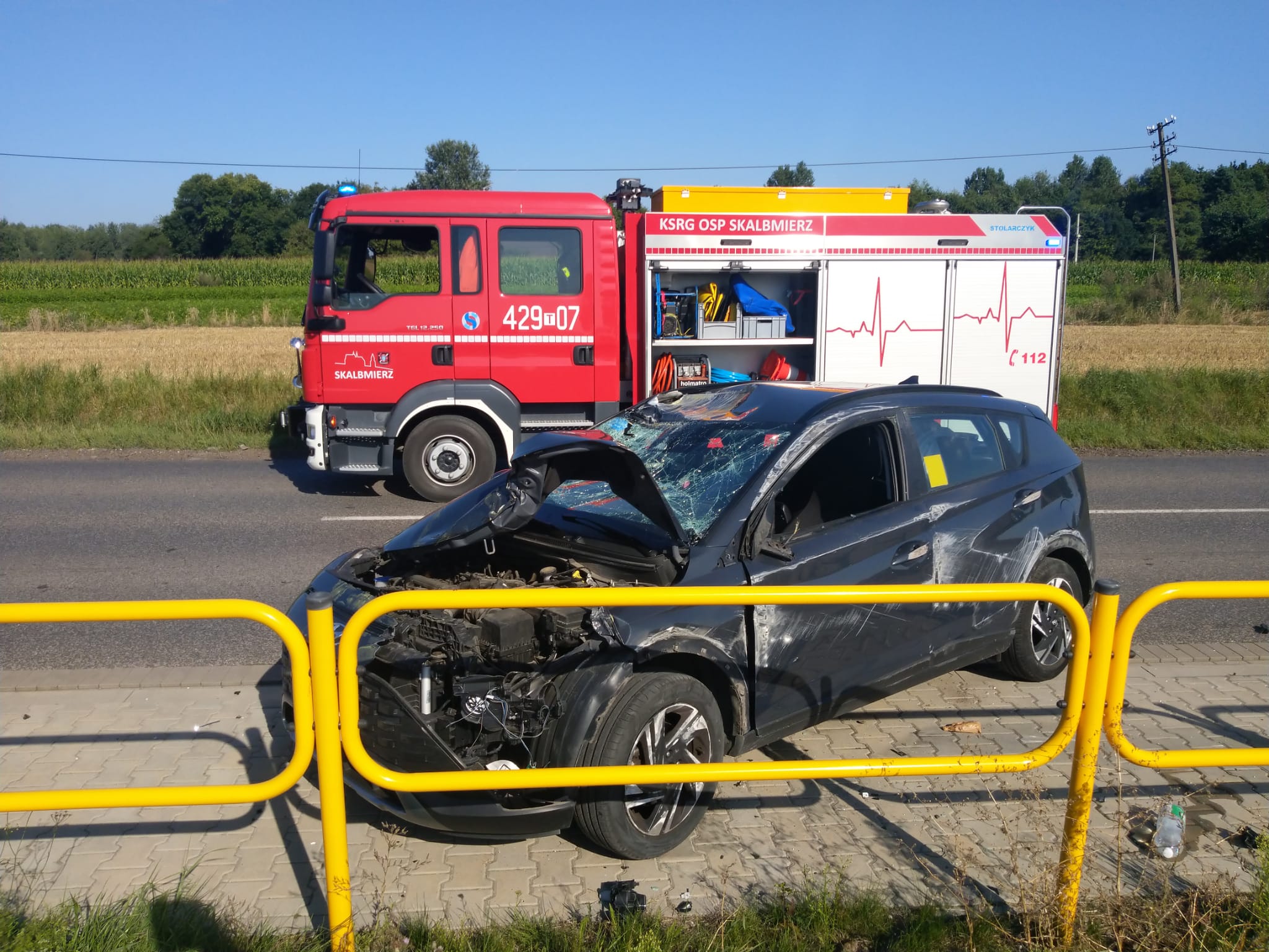 W dniu 12 sierpnia 2023 r. o godz. 16:21 dyżurny stanowiska kierowania komendanta powiatowego Państwowej Straży Pożarnej w Kazimierzy Wielkiej otrzymał zgłoszenie o zderzeniu dwóch samochodów osobowych na drodze wojewódzkiej nr 768 w miejscowości Skalbmierz. Do zdarzenia zadysponowano dwa zastępy z Jednostki Ratowniczo - Gaśniczej w Kazimierzy Wielkiej oraz zastęp OSP Skalbmierz z KSRG. Po przybyciu na miejsce zdarzenia, w trakcie rozpoznania stwierdzono, że po zderzeniu pojazdy znajdują się w pozycji na kołach i blokują całkowicie przejazd drogą wojewódzką. Samochodami łącznie podróżowało dziesięć osób. Działania zastępów JOP polegały na zabezpieczeniu miejsca zdarzenia, odcięciu elektrycznych źródeł zasilania w obu pojazdach oraz udzieleniu kwalifikowanej pierwszej pomocy poszkodowanym. Lekarz ZRM przybyłego na miejsce zdarzenia, po przebadaniu wszystkich poszkodowanych podjął decyzje o konieczności przetransportowania dwóch poszkodowanych do szpitala. Po wykonaniu wszystkich czynności dochodzeniowych przeprowadzonych przez techników Policji samochody usunięto z jezdni tak, aby nie stwarzały zagrożenia dla innych uczestników. Rozlane płyny eksploatacyjne zostały usunięte przy pomocy sorbentu.