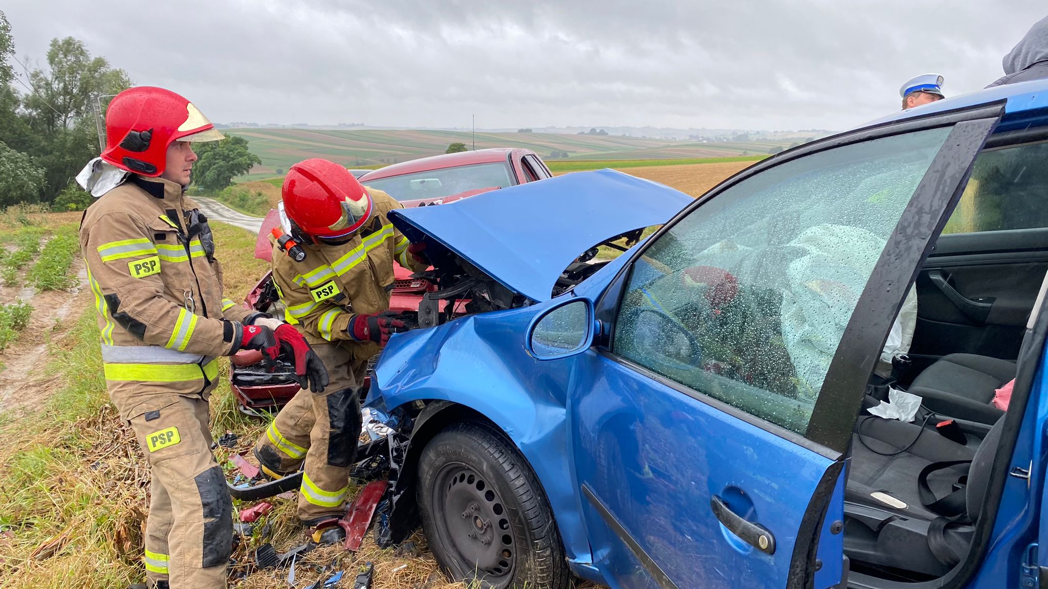 26 lipca 2023 r. ok. godz. 16:05 Dyżurny Stanowiska Kierowania Komendanta Powiatowego Państwowej Straży Pożarnej w Kazimierzy Wielkiej otrzymał zgłoszenie o czołowym zderzeniu dwóch samochodów osobowych. Do wypadku zadysponowano zastęp z Jednostki Ratowniczo - Gaśniczej z Kazimierzy Wielkiej oraz jednostkę OSP Skalbmierz z KSRG. Po dojeździe na miejsce zdarzenia i przeprowadzeniu rozpoznania ustalono, że pojazdy znajdujące się w pozycjach „na kołach”, którymi podróżowali tylko kierowcy blokowały jeden pas ruchu. Kierowca jednego z pojazdu znajdował się poza autem, natomiast drugiego-wewnątrz samochodu. Na miejsce zdarzenia wraz z zastępem JOP przybył Zespół Ratownictwa Medycznego oraz Policja. Kierowcy-uczestnicy zdarzenia, po przebadaniu zostali przetransportowani do szpitala. Działania jednostek ochrony przeciwpożarowej polegały na zabezpieczeniu miejsca zdarzenia oraz odłączeniu źródeł zasilania elektrycznego w uszkodzonych pojazdach. Przy użyciu sorbentu zebrano wyciekłe płyny eksploatacyjne. Po zakończeniu czynności dochodzeniowych przeprowadzonych przez Policję uszkodzone pojazdy zostały usunięte przez pomoc drogową. W trakcie prowadzonych działań ruch na drodze odbywał się wahadłowo.