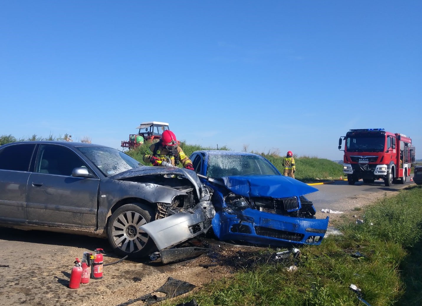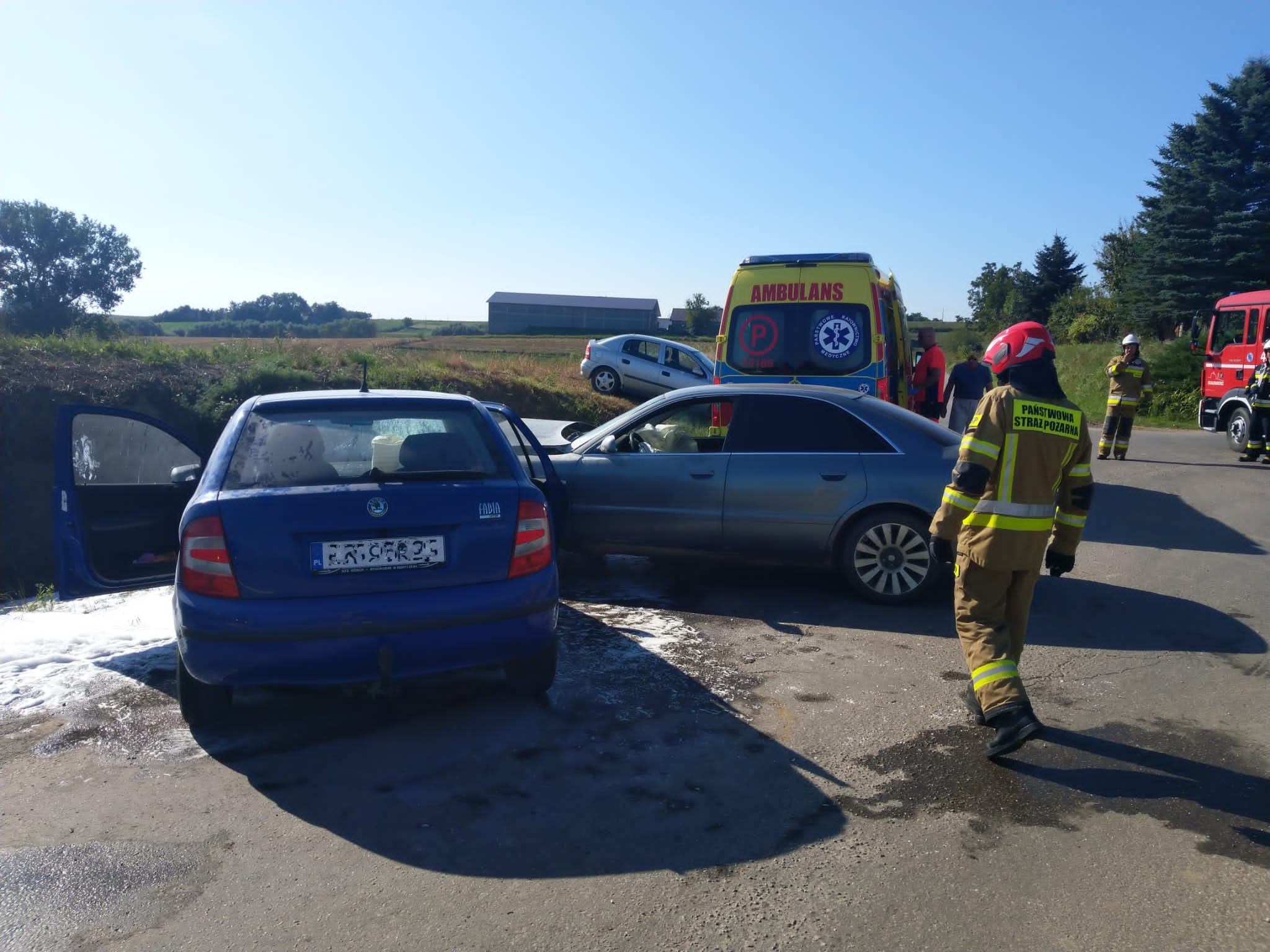 24 sierpnia 2023 r. o godz. 08:47 Dyżurny Stanowiska Kierowania Komendanta Powiatowego Państwowej Straży Pożarnej w Kazimierzy Wielkiej otrzymał zgłoszenie o zderzeniu dwóch samochodów osobowych: Skody Fabia i Audi A4. Zdarzenie miało miejsce na skrzyżowaniu drogi powiatowej z drogą gminną w miejscowości Zakrzów. Do wypadku zadysponowano dwa zastępy z Jednostki Ratowniczo - Gaśniczej z Kazimierzy Wielkiej oraz jednostkę OSP Skalbmierz z KSRG. Po dojeździe na miejsce zdarzenia i przeprowadzeniu rozpoznania ustalono, że auta znajdują się w pozycji na kołach blokując ruch w obu kierunkach. Podróżowali nimi tylko kierowcy, którzy znajdowali się poza samochodami. Do czasu przyjazdu Zespołu Ratownictwa Medycznego poszkodowanymi zajmowali się strażacy jednostek ochrony przeciwpożarowej. Po przekazaniu kierowców do przybyłego ZRM lekarz podjął decyzję o przewiezieniu jednego z nich do szpitala w Proszowicach. Działania zastępów JOP polegały na zabezpieczeniu miejsca zdarzenia oraz odłączeniu źródła zasilania elektrycznego w uszkodzonych pojazdach. W celu ugaszenia pożaru komory silnika Skody został podany prąd piany ciężkiej. Po zakończeniu czynności dochodzeniowych przeprowadzonych przez Policję samochody uczestniczące w zdarzeniu zostały usunięte przez przybyłe na miejsce dwie pomoce drogowe. Przy użyciu sorbentu zebrano wyciekłe płyny eksploatacyjne. W trakcie prowadzonych działań ruch na skrzyżowaniu dróg był wstrzymany.