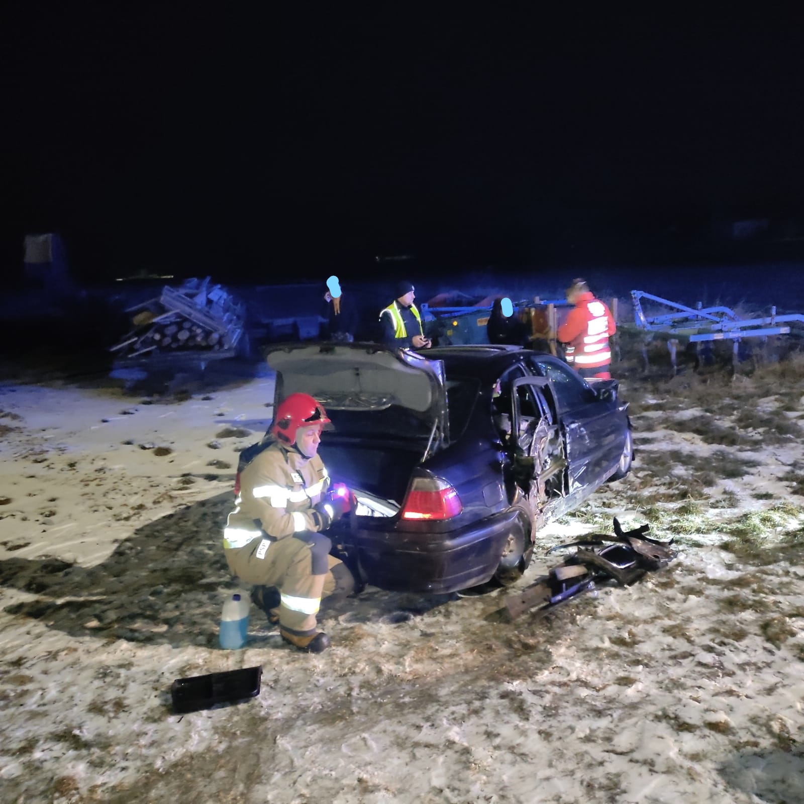 Po przybyciu na miejsce kierujący działaniem ratowniczym (KDR) w trakcie rozpoznania ustalił, że samochód osobowy BMW E-46 z nieustalonych przyczyn wypadł z drogi gminnej po czym uderzył w ogrodzenie jednej z posesji. Pojazd znajdował się na poboczu drogi gminnej w pozycji na kołach. Podróżowało nim pięć osób (czterech mężczyzn i jedna kobieta), którzy opuścili pojazd o własnych siłach przed przybyciem na miejsce jednostek ochrony przeciwpożarowej.