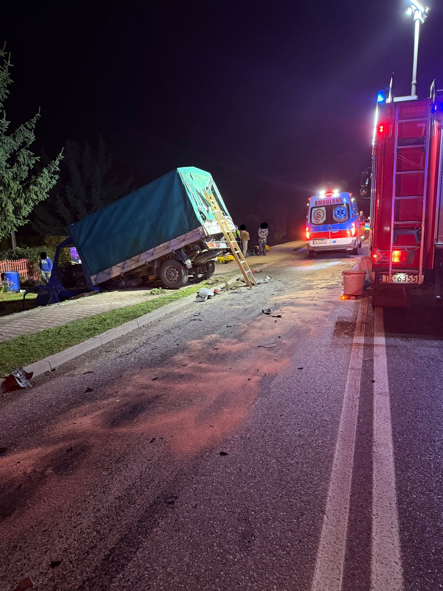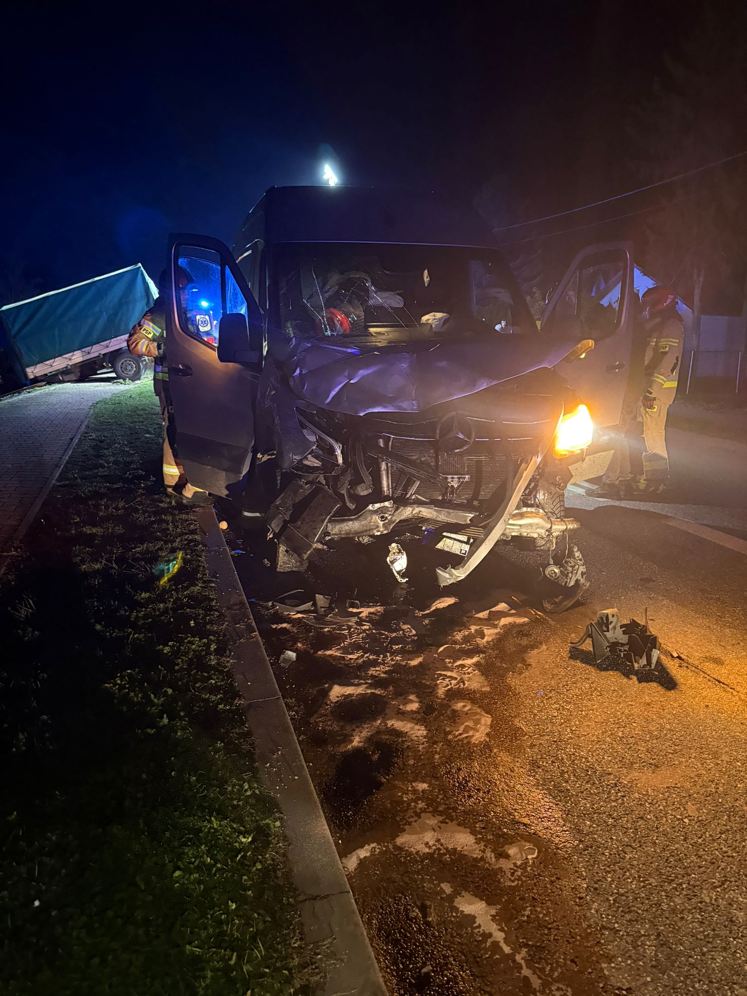 W dniu 29 października 2025 r. o godz. 20:06 Dyżurny Stanowiska Kierowania Komendanta Powiatowego Państwowej Straży Pożarnej w Kazimierzy Wielkiej otrzymał zgłoszenie o zderzeniu dwóch samochodów dostawczych. Samochodami podróżowało łącznie trzy osoby. Do zdarzenia doszło na drodze wojewódzkiej nr 776 w miejscowości Boronice. Na miejsce wypadku zadysponowano dwa zastępy z Jednostki Ratowniczo – Gaśniczej z Kazimierzy Wielkiej. Działania polegały na wykonaniu dostępu do kierowcy pojazdu marki Lublin przy użyciu sprzętu hydraulicznego oraz przetransportowaniu go wraz z ratownikami medycznymi do karetki pogotowia. Lekarz Zespołu Ratownictwa Medycznego po przebadaniu wszystkich uczestników zdarzenia stwierdził potrzebę hospitalizacji dwóch osób. Pozostałe działania zastępów JOP polegały na zabezpieczeniu miejsca zdarzenia, odcięciu źródeł zasilania elektrycznego w pojazdach oraz usunięciu ich z jezdni tak, aby nie stwarzały zagrożenia dla innych uczestników ruchu drogowego. Rozlane na jezdnię płyny eksploatacyjne z pojazdów zostały usunięte przy pomocy sorbentu. Na czas prowadzonych działań ratowniczych ruch na drodze został wstrzymany.