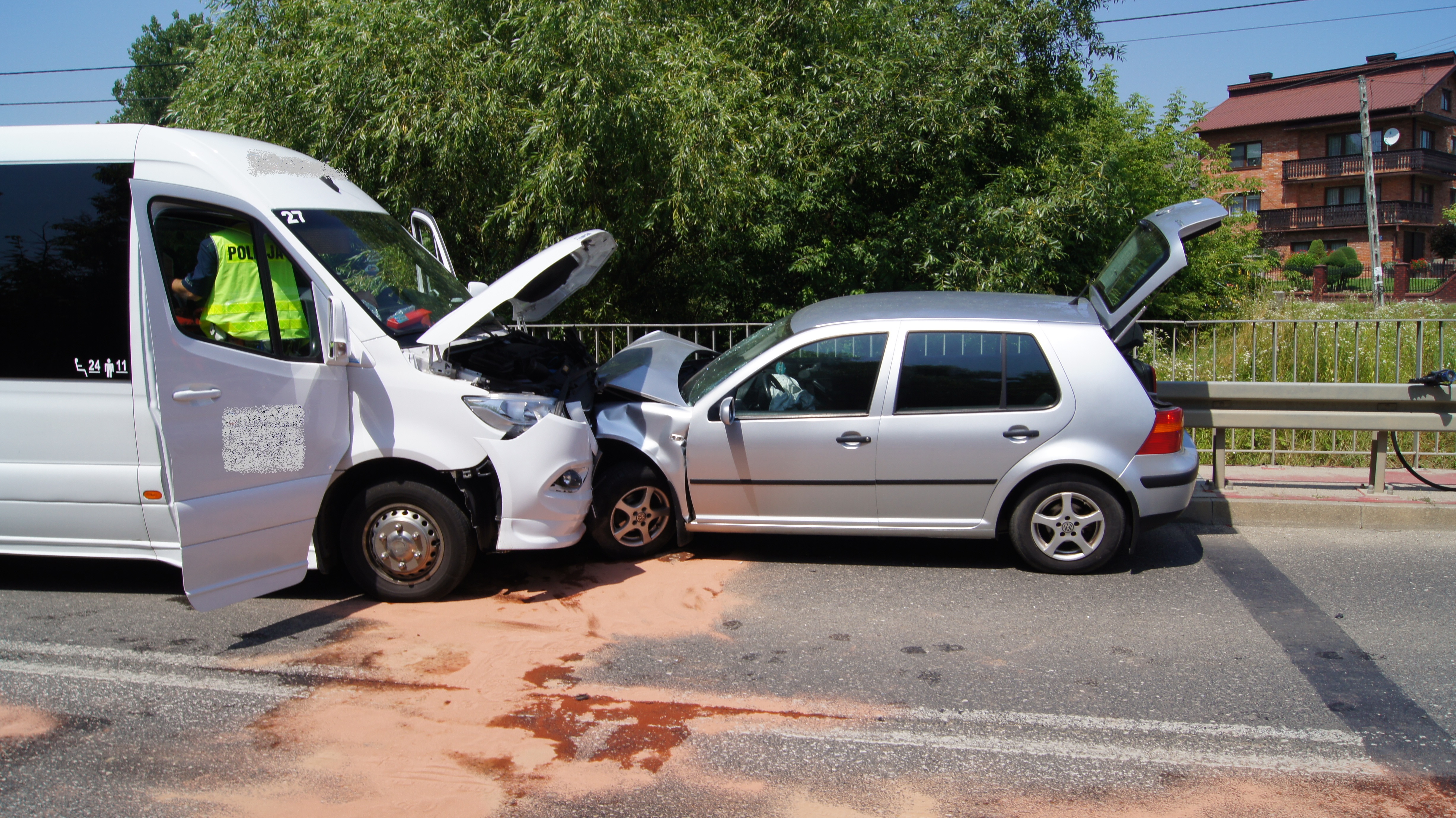 z jednostki OSP Łękawa z KSRG. Po przybyciu na miejsce zdarzenia w trakcie rozpoznania stwierdzono, że na drodze wojewódzkiej doszło do czołowego zderzenia samochodu osobowego VW Golf z busem pasażerskim marki Mercedes. Samochody znajdowały się w pozycji na kołach blokując jeden pas ruchu. Samochodem osobowym podróżowały dwie osoby natomiast busem 16 pasażerów oraz kierowca. W chwili przybycia zastępów Jednostek Ochrony Przeciwpożarowej na miejsce zdarzenia wszyscy poszkodowani opuścili pojazdy o własnych siłach i znajdowali się pod opieką będącego na miejscu ZRM. Decyzją lekarza dwie osoby podróżujące VW Golfem zostały przetransportowane do szpitala, reszta uczestników zdarzenia pozostała na miejscu. Działania JOP polegały na zabezpieczeniu miejsca zdarzenia, odłączeniu źródeł zasilania w pojazdach oraz posypaniu i zebraniu rozlanych płynów eksploatacyjnych przy pomocy sorbentu. Podczas prowadzonych działań ruch na drodze został wstrzymany. W akcji ratowniczej trwającej ponad 3 godziny brały udział: 3 zastępy straży pożarnej, 4 radiowozy Policji, 3 karetki ZRM oraz Prokurator.