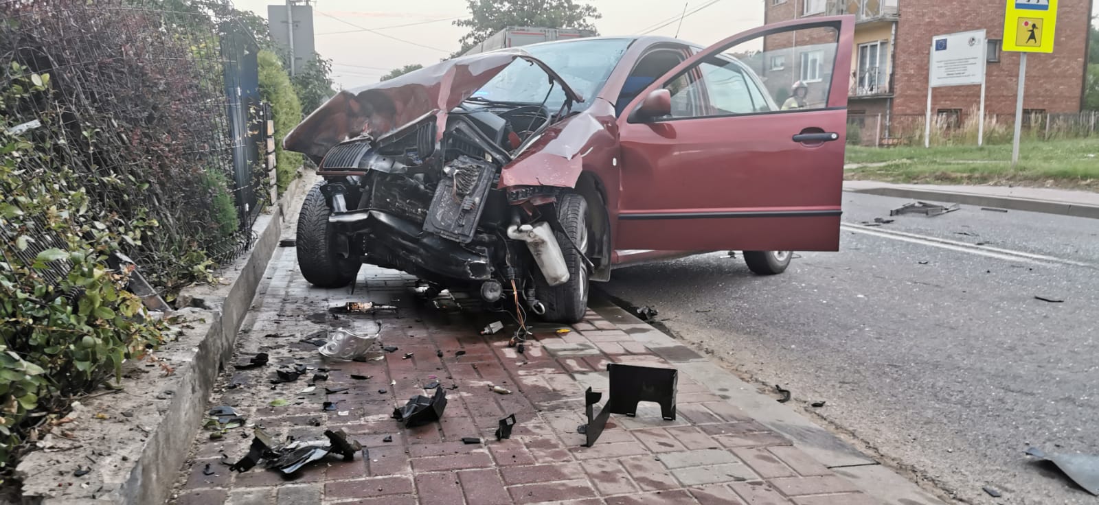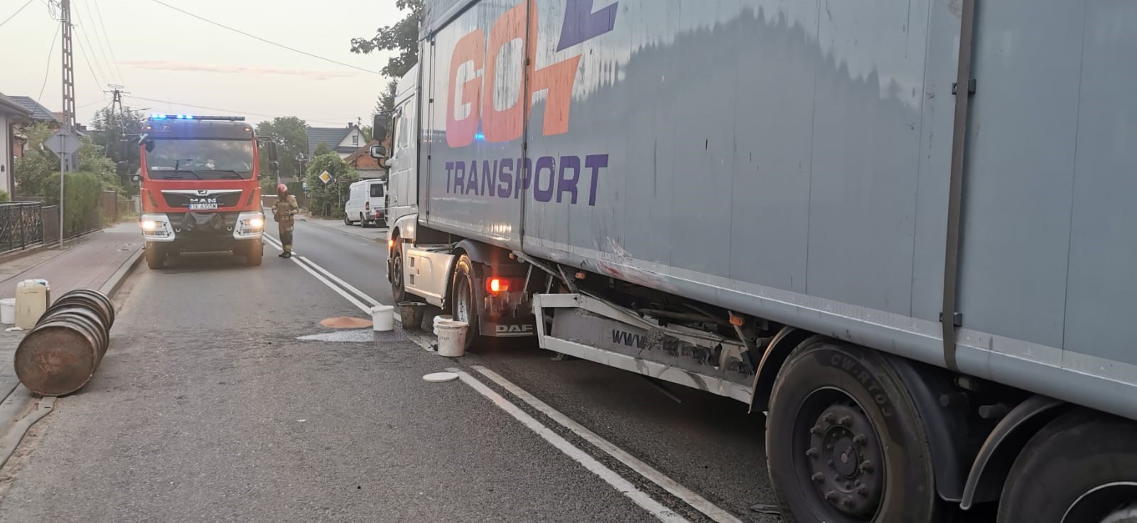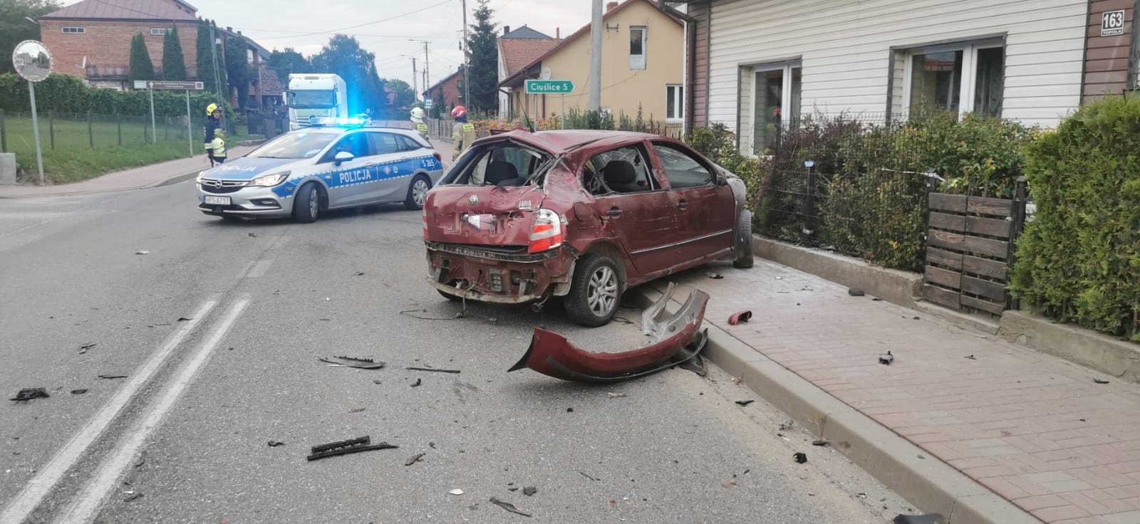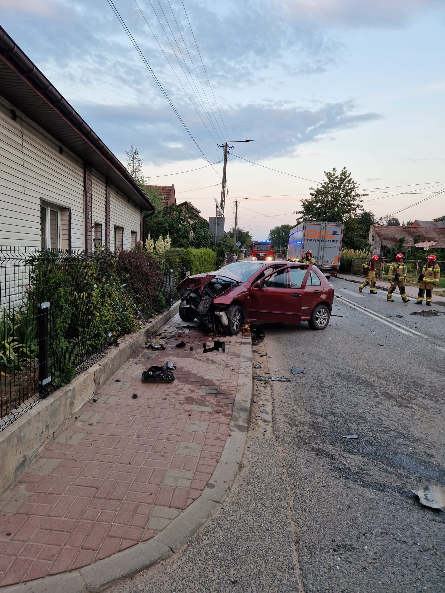 W dniu 3 lipca 2025 r. o godz. 19:51 Dyżurny Stanowiska Kierowania Komendanta Powiatowego Państwowej Straży Pożarnej w Kazimierzy Wielkiej otrzymał zgłoszenie o zderzeniu samochodu osobowego z ciężarowym. Do zdarzenia doszło na skrzyżowaniu drogi wojewódzkiej z drogą powiatową w miejscowości Topola. Na miejsce wypadku zadysponowano dwa zastępy z Jednostki Ratowniczo – Gaśniczej z Kazimierzy Wielkiej oraz zastęp OSP Topola włączony do Krajowego Systemu Ratowniczo – Gaśniczego. Przybyły na miejsce zdarzenia Zespół Ratownictwa Medycznego po przebadaniu wszystkich uczestników wypadku podjął decyzję o hospitalizacji trzech osób podróżujących samochodem osobowym. Działania zastępów Jednostek Ochrony Przeciwpożarowej polegały na zabezpieczeniu miejsca zdarzenia, odcięciu źródeł zasilania elektrycznego w pojazdach oraz usunięciu ich z jezdni tak, aby nie stwarzały zagrożenia dla innych uczestników ruchu drogowego. W wyniku zderzenia w pojeździe ciężarowym został uszkodzony zbiornik paliwa. Ratownicy wypompowali z niego około 600 litrów oleju napędowego. Rozlane na jezdnię płyny eksploatacyjne z pojazdów zostały usunięte przy pomocy sorbentu. Na czas prowadzonych działań ratowniczych ruch na drodze wojewódzkiej został wstrzymany.