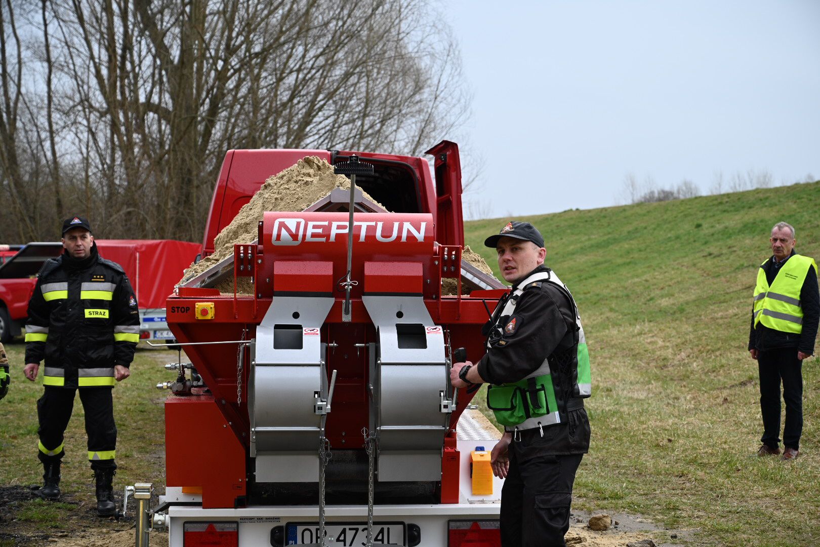 Każdy dzień ćwiczeń podzielony był na dwie części. Pierwsza z nich stanowiła warsztaty szkoleniowe dla strażaków z zakresu umiejętności obsługi mobilnej dozowarki NEPTUN przeznaczonej do zasypywania worków piaskiem.