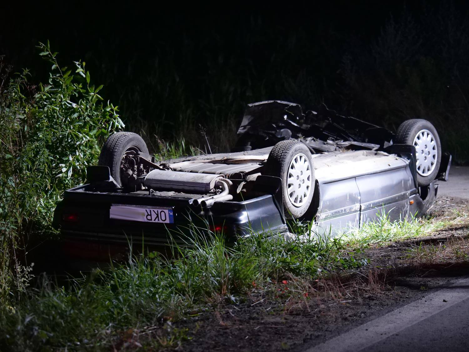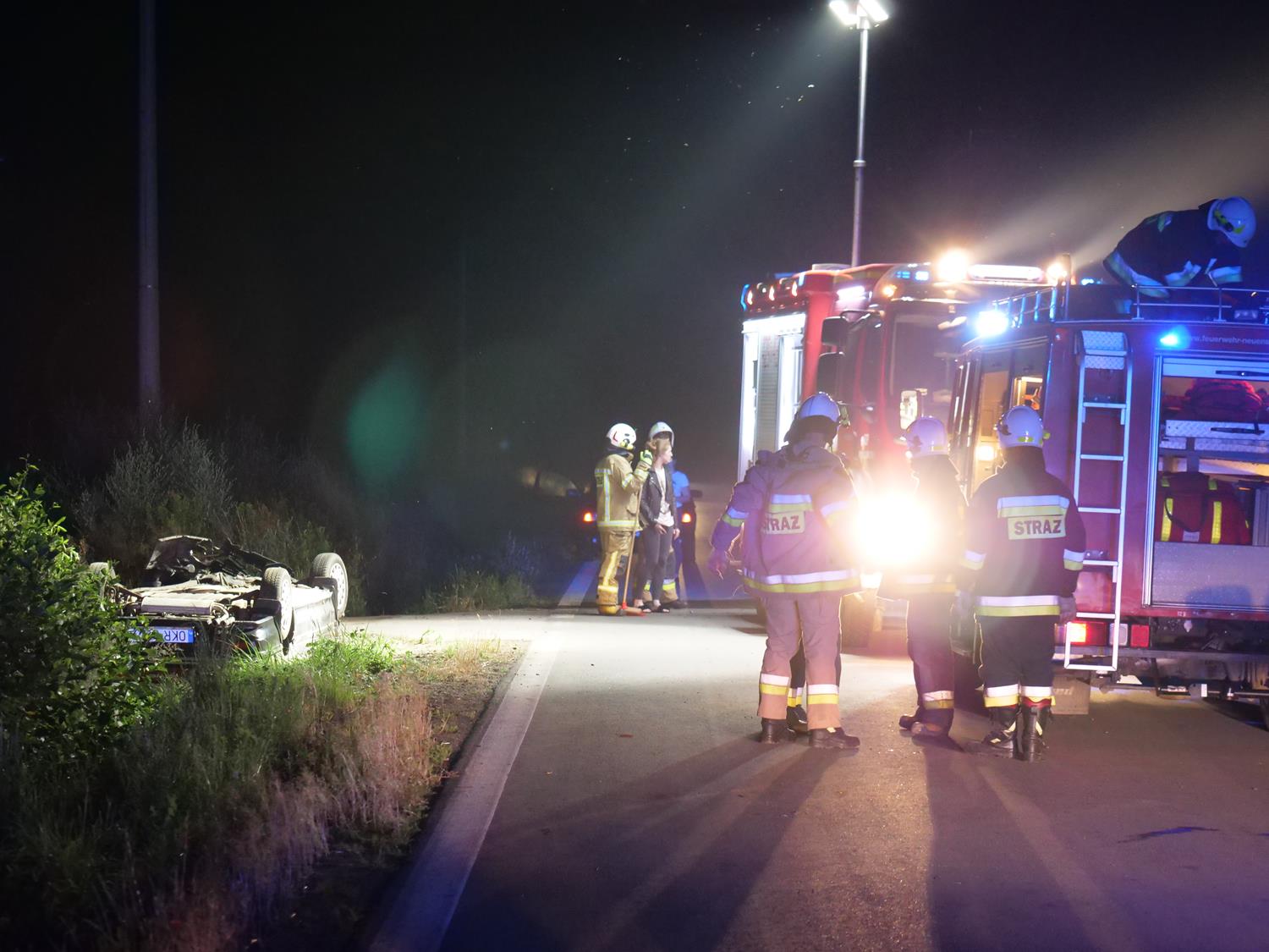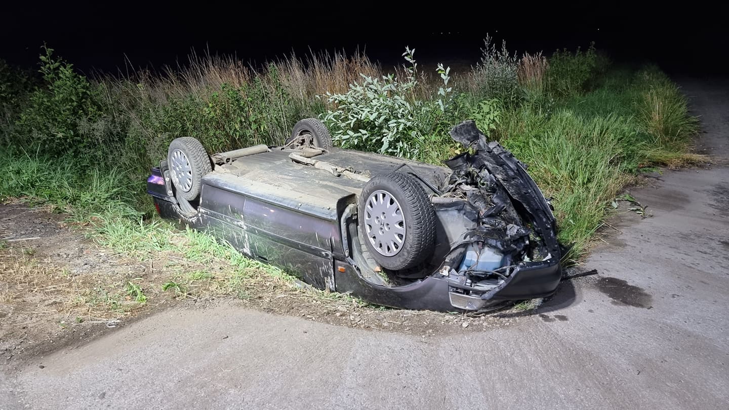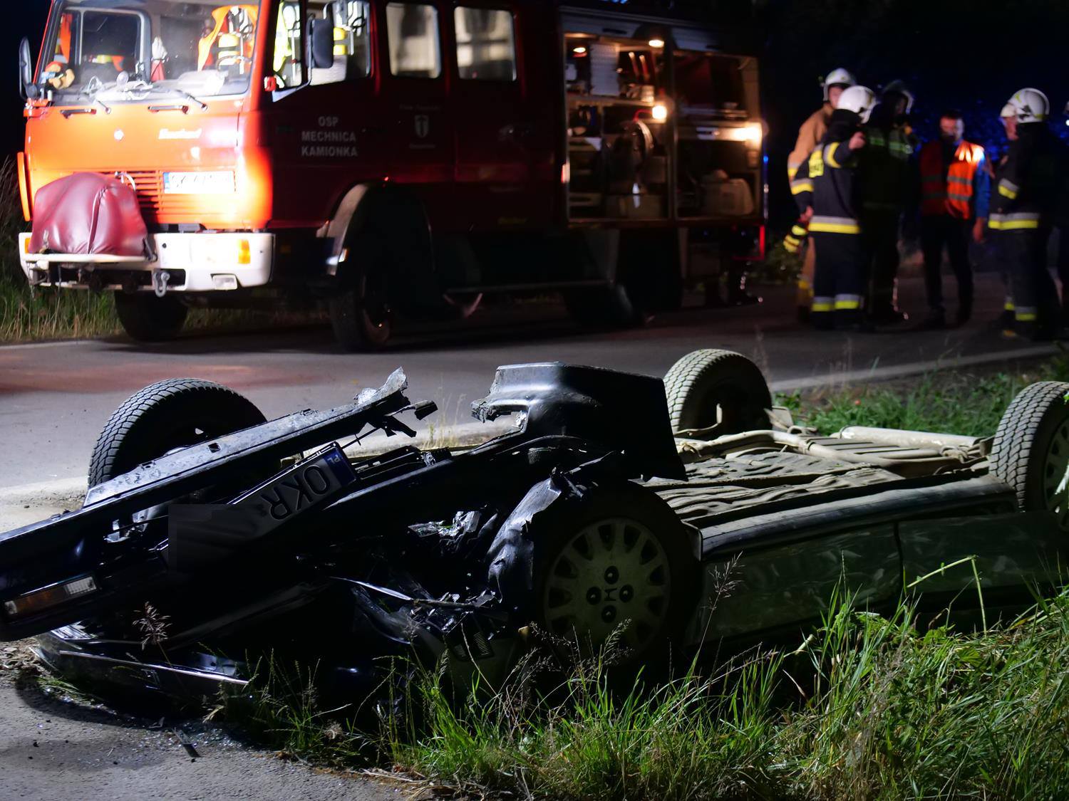 W dniu 08.07.2021 r. o godzinie 21:48 dyżurny Stanowiska Kierowania Komendanta Powiatowego PSP w Kędzierzynie-Koźlu otrzymał zgłoszenie o dachowaniu samochodu osobowego. Niezwłocznie do tego zdarzenia zadysponował zastepy z JRG 2 oraz OSP Mechnica. Po dojeździe na miejsce Kierujący działaniami ratowniczymi ustalił, że: samochód osobowy znajduje się na dachu w rowie, nie ma wycieków płynów eksploatacyjnych oraz że jedna osoba została poszkodowana i znajduje się w samochodzie. Osoba poszkodowana była przytomna, w kontakcie słownym. Działania ratowników polegały na zabezpieczeniu i oświetleniu terenu działań, udzieleniu poszkodowanej kobiecie kwalifikowanej pomocy przedmedycznej, ustabilizowaniu pojazdu, odłączeniu akumulatora, a także dokładnym przeszkaniu ternu działań pod kątem ewentualnych innych osób biorących udział w zdarzeniu. Przeszukanie potwierdziło, że w zdarzeniu brała tylko jedna osoba - kierująca samochodem marki Honda. Osobę poszkodowaną funkcjonariusze przekazali przybyłemu na miejsce zespołowi ratownictwa medycznego. Teren działań został przekazany Policji. Zdjęcia dzięki uprzejmoći Pana Rafała Pulkowskiego.