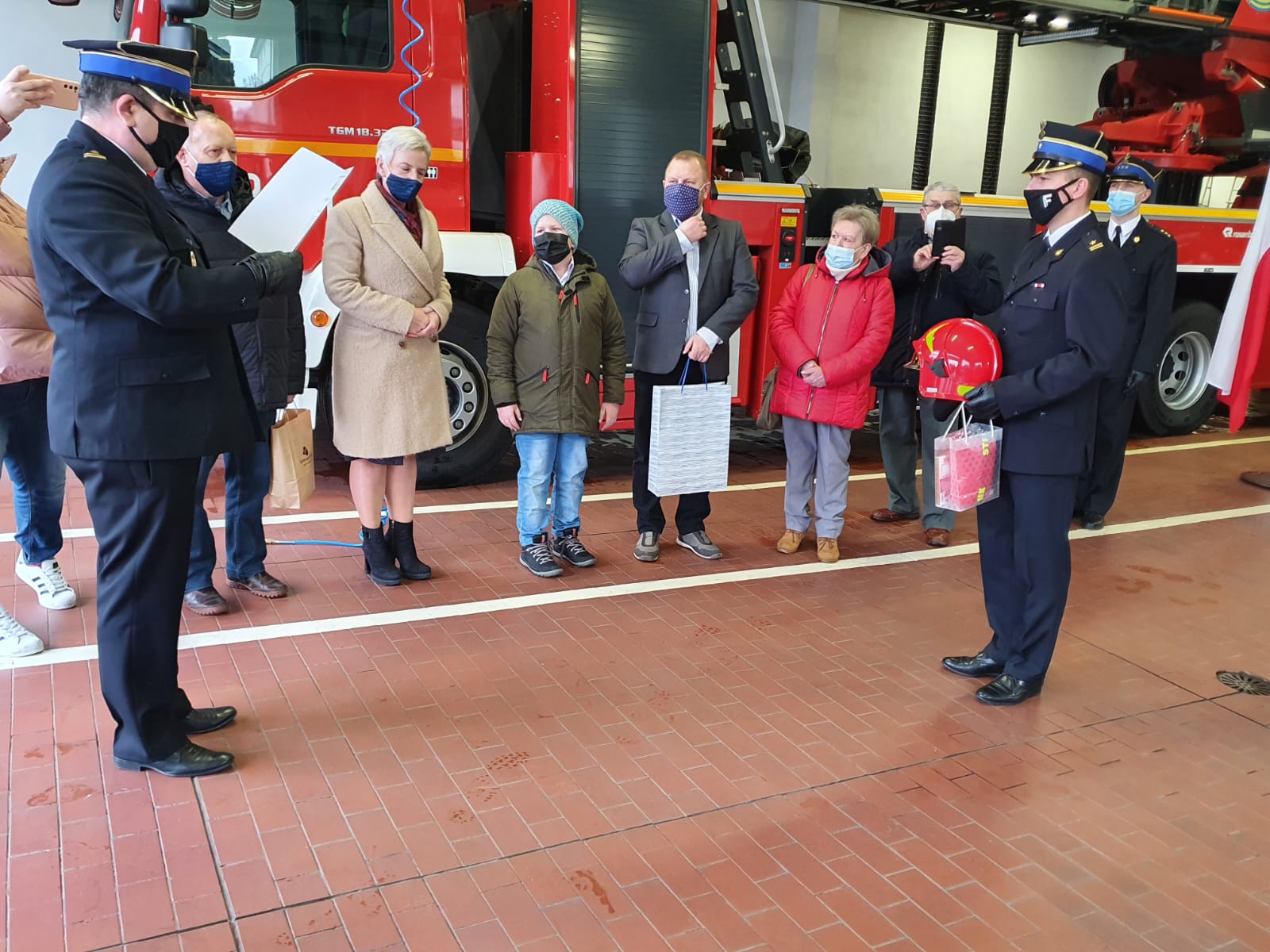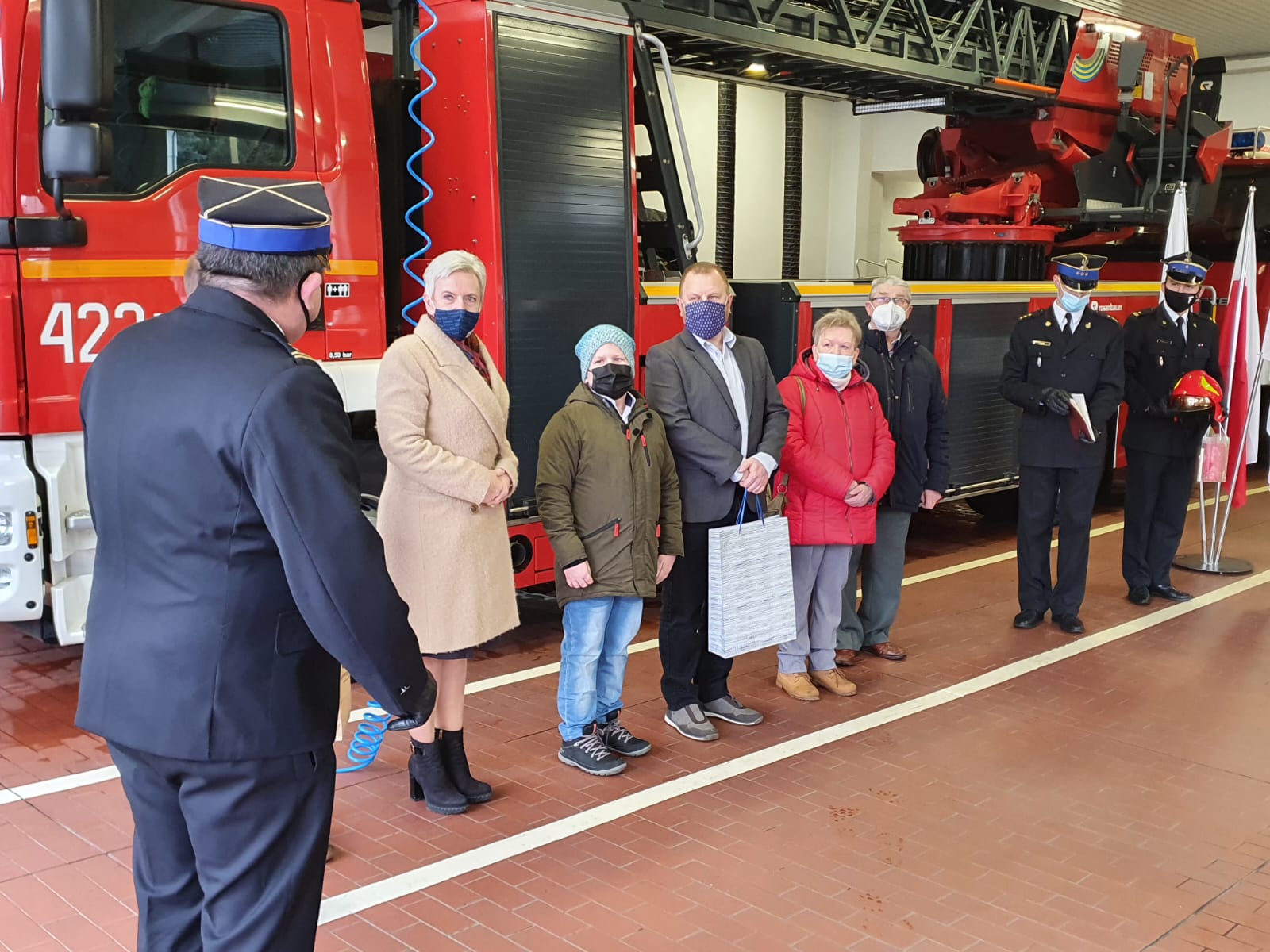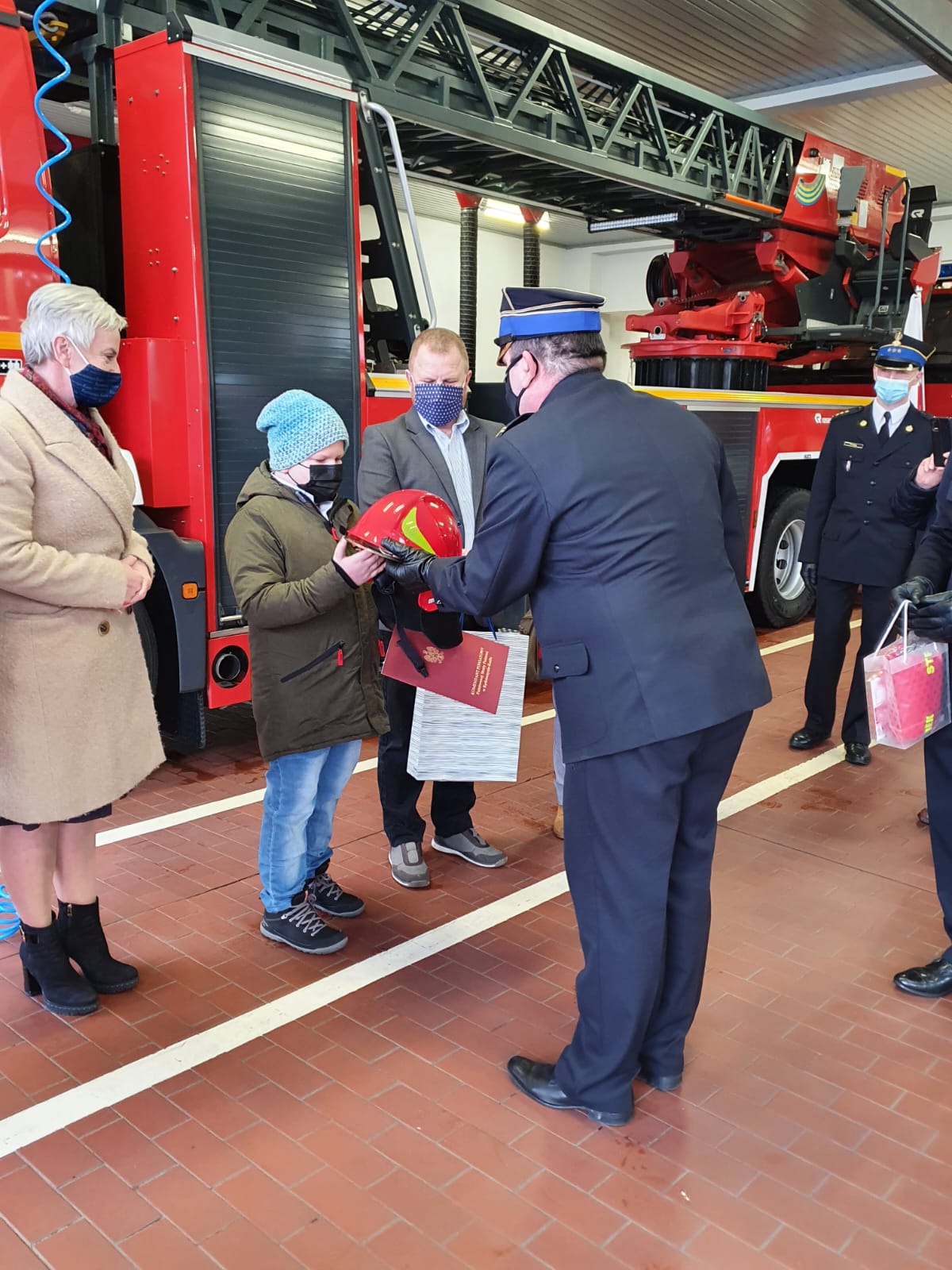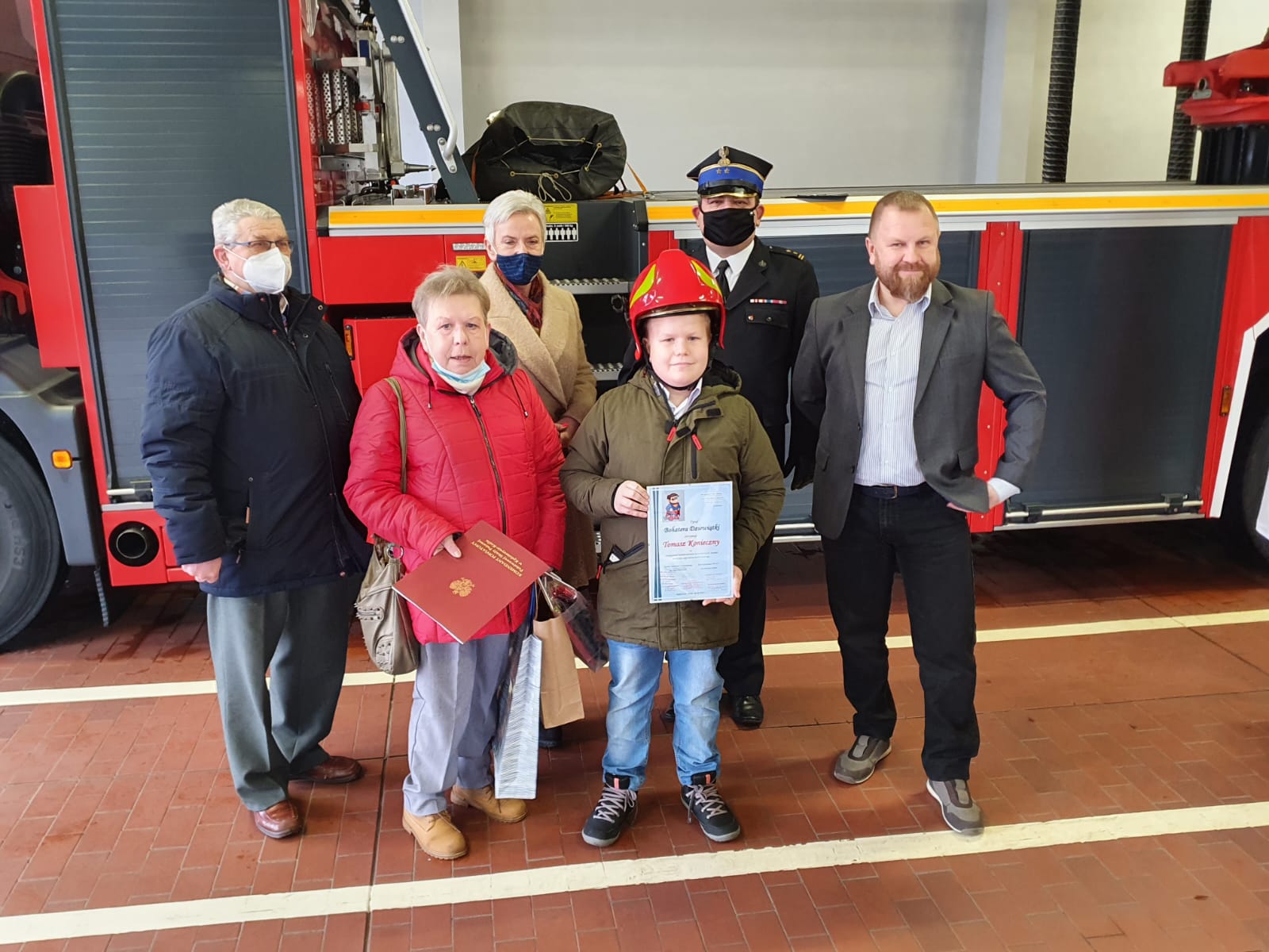 W dniu 26.01.2022 r. Zastępca Komendanta Powiatowego PSP w Kędzierzynie-Koźlu bryg. Marek Kocielski wręczył nagrodę "Małego Bohatera" dwunastoletniemu Tomaszowi Koniecznemu, który w dniu 22.12.2021 r. o godzinie 08:38 zgłosił na numer alarmowy 112 zdarzenie dotyczące utraty przytomności swojej mamy, która była jedyną dorosłą osobą w mieszkaniu. Chłopiec wykazał się opanowaniem w dramatycznej sytuacji zagrożenia życia swojej mamy, z którą przebywał w mieszkaniu. W pełni świadomy udzielił pierwszej pomocy przez nawiązanie kontaktu i sprawdzenie podstawowych funkcji życiowych, a następnie bezzwłocznie zadzwonił po pomoc wybierając numer alarmowy 112. Tomek udzielił wszystkich niezbędnych danych dotyczących miejsca oraz okoliczności zdarzenia, a także przekazał informacje na temat stanu zdrowia swojej mamy co przyczyniło się do skrócenia czasu podjęcia czynności ratowniczych przez powiadomione służby. Sytuacja była niezwykle dużym obciążeniem emocjonalnym, ponieważ świadkiem całej sytuacji była też jego trzyletnia siostra. Tomasz wykazał się niezwykłym opanowaniem, odwagą i dojrzałością. Jego postawa jest godna naśladowania, pokazuje jak ważnym jest zachowanie zimnej krwi pomimo wielu przeciwności, aby dać szanse służbom ratunkowym na skuteczne dotarcie z pomocą osobom potrzebującym.