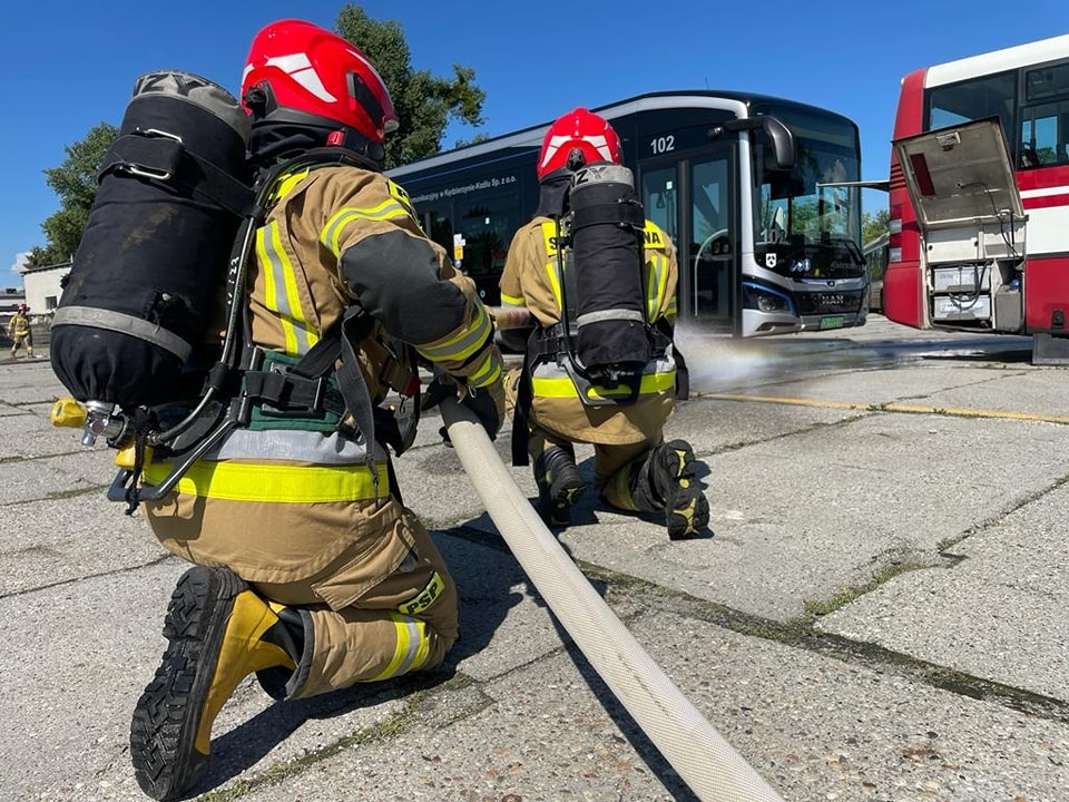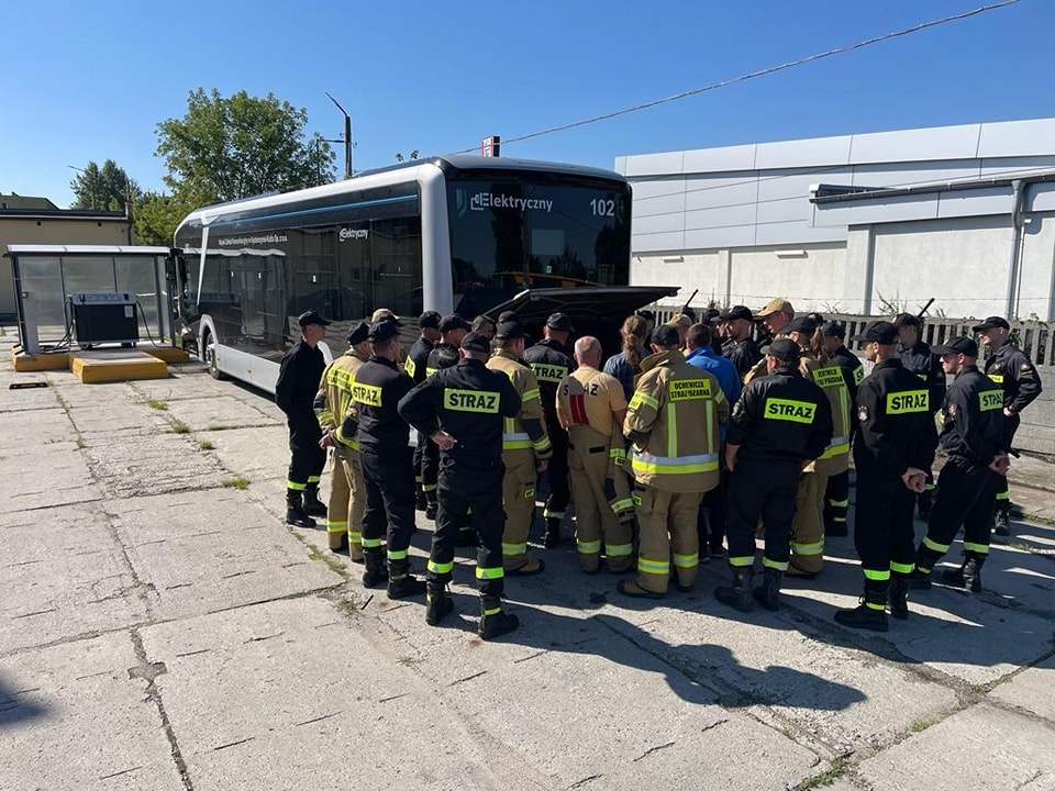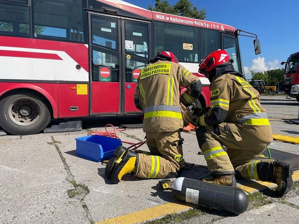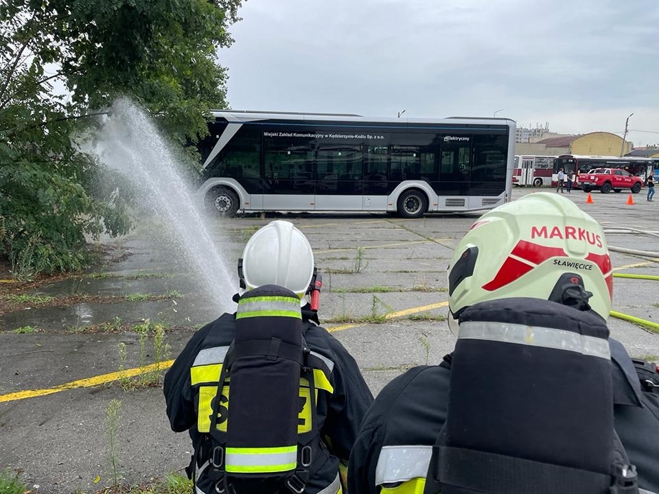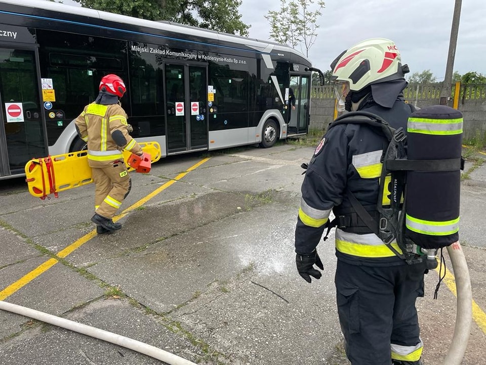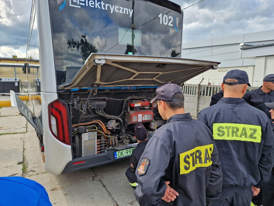 Obecność pojazdów elektrycznych w taborze Miejskiego Zakładu Komunikacyjnego Sp. z o.o. w Kędzierzynie-Koźlu wiąże się z nowymi zagrożeniami podczas udziału takiego autobusu w zdarzeniu komunikacyjnym. Ważnym elementem jest zapoznanie ratowników z procedurami bezpiecznego działania podczas zdarzeń z pojazdami elekrycznymi. Strażacy ratownicy OSP oraz funkcjonariusze KP PSP w Kędzierzynie-Koźlu zmagali się z z założonymi scenariuszami zdarzeń wypadkowych aby w ten sposób utrwalić obowiązujące procedury. Jednym z założeń był pożar takiego pojazdu.