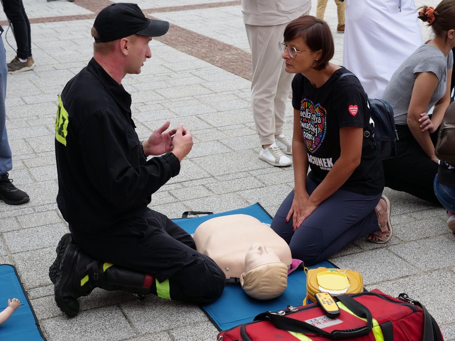 Mieszkańcy mieli możliwość zapoznania się z podstawowymi zasadami udzielania pierwszej pomocy. Warto pamiętać, że u osoby, która nie oddycha, a jej krążenie jest niewydolne, mamy tylko 4 minuty na uratowanie jej mózgu przed nieodwracalnymi zmianami, dlatego tak ważna jest znajomość podstawowych zasad pierwszej pomocy.