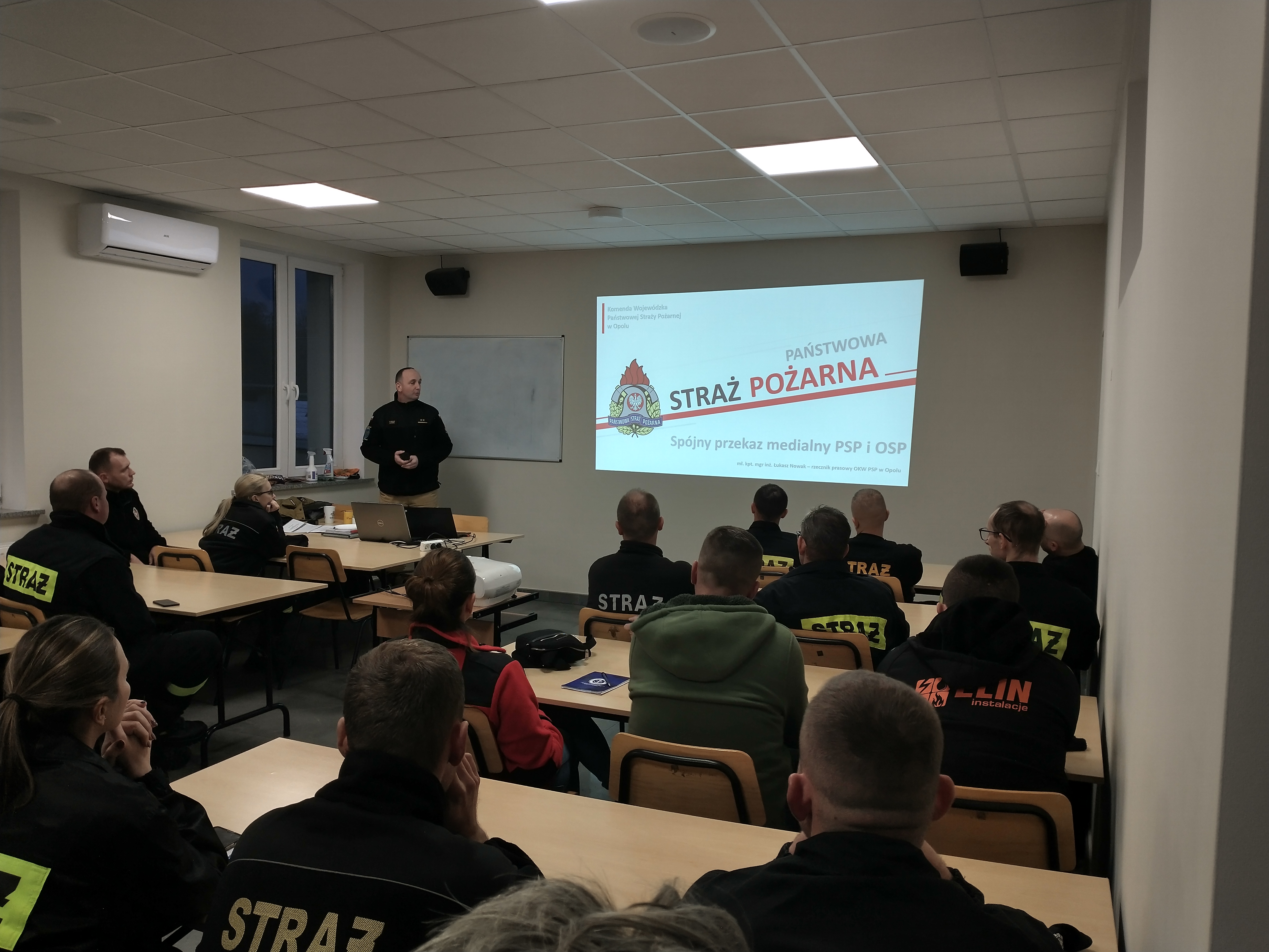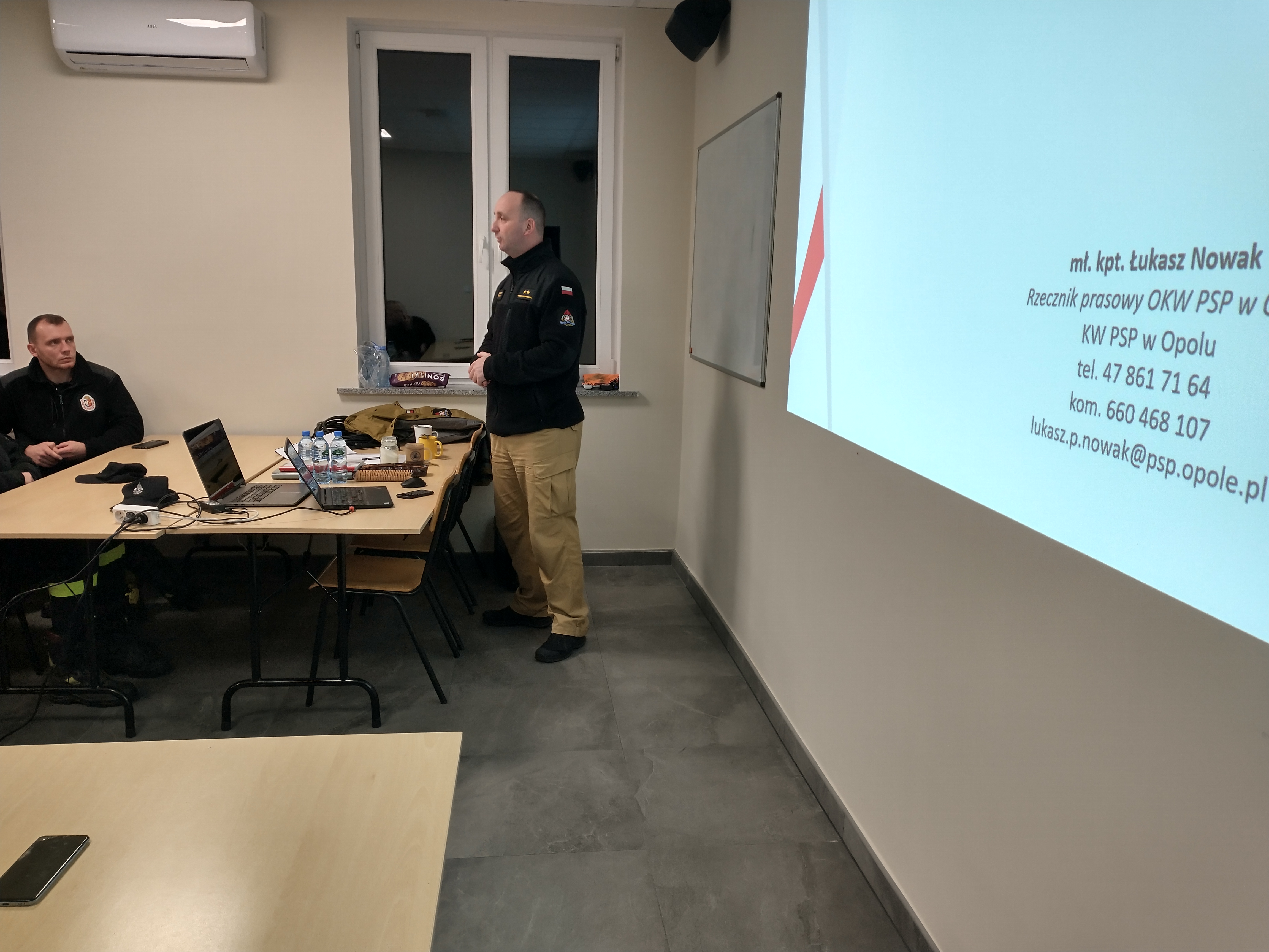Szkolenie z zakresu BHP połączone było także z warsztatami dotyczącymi spójnego przekazu medialnego podczas prowadzonych działań ratowniczych przez jednostki PSP oraz OSP. Warsztaty przeprowadził rzecznik Opolskiego Komendanta Wojewódzkiego PSP w Opolu – mł. kpt. Łukasz Nowak.