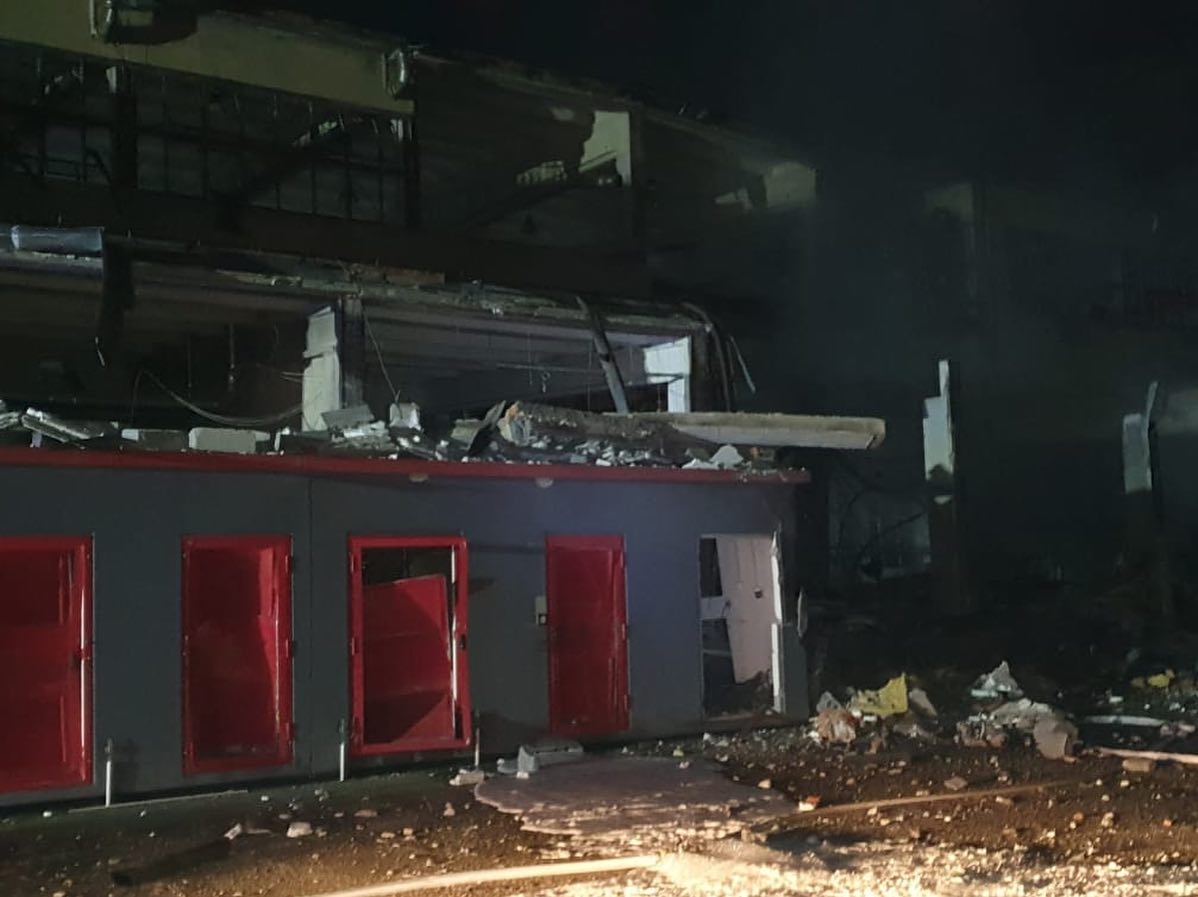 Po przybyciu na miejsce działań, kierujący działaniem ratowniczym w toku rozpoznania potwierdził, że doszło do wybuchu w hali, która uległa częściowemu zawaleniu a uszkodzone elementy obiektu porozrzucane są na przyległym terenie. Ponadto zlokalizowano pojedyncze ogniska pożaru.
