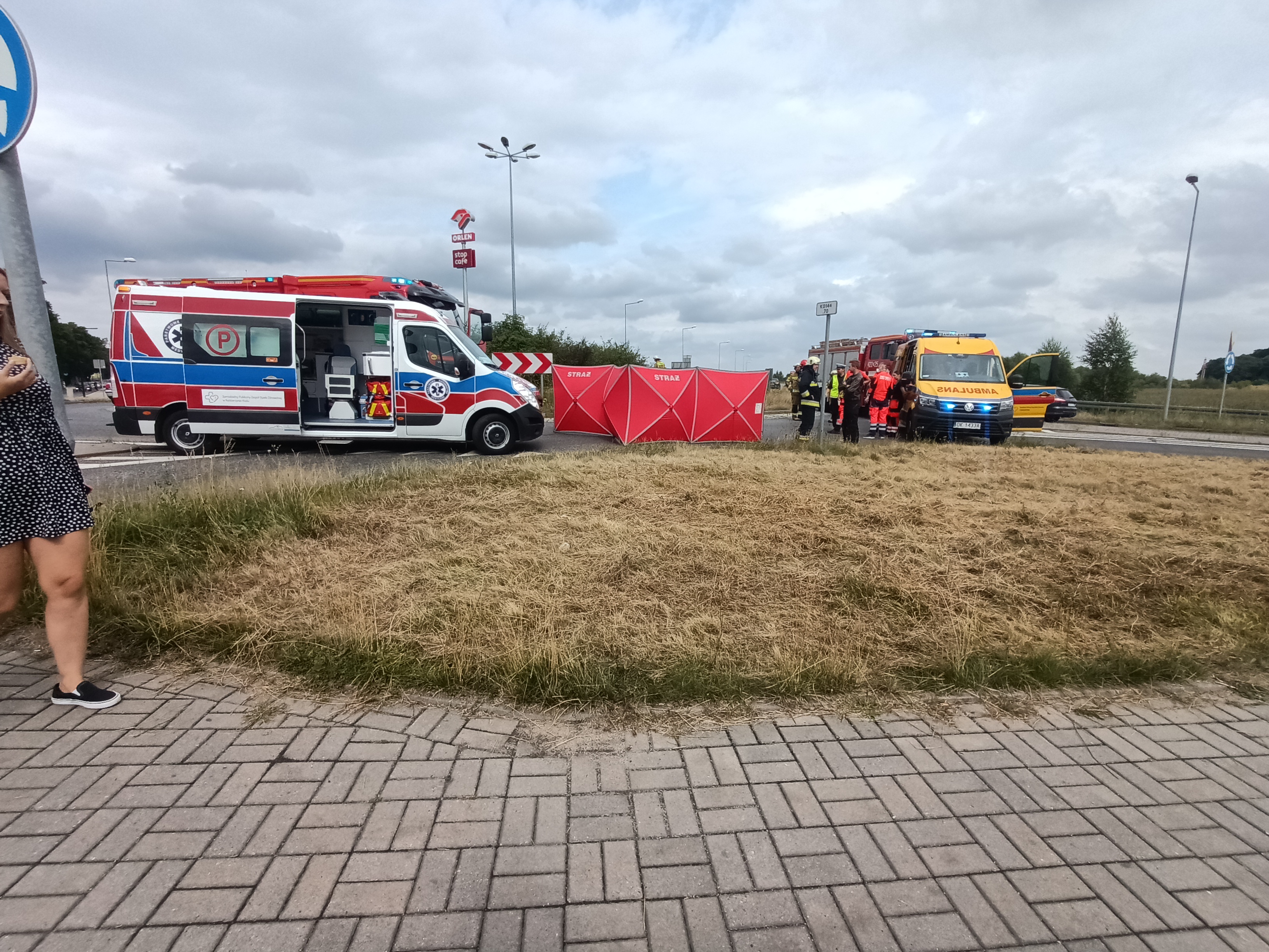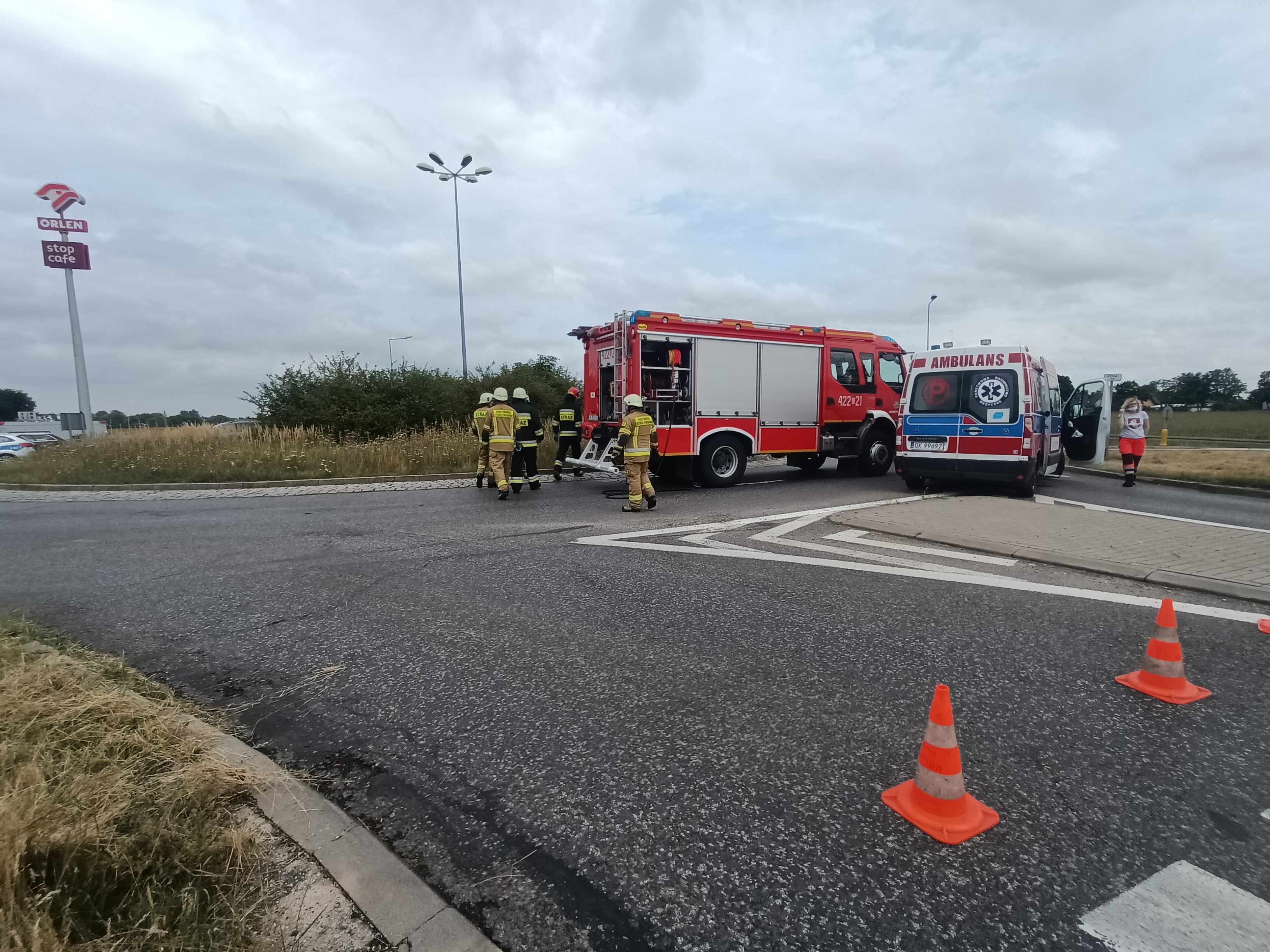 W dniu 01.08.2021 r. o godzinie 15:12 dyżurny stanowiska kierowania otrzymał zgłoszenie o wypadku samochodu osobowego z motocyklem. Do tego zdarzenia zadysponował zastępy z JRG-2. Po dojeździe na miejsce KDR ustalił, że na jezdni leży motocyklista, któremu ZRM udzielał KPP. Działania strażaków polegały na zabezpieczeniu miejsca zdarzenia, podaniu prądu wody na palący się motocykl, rozłożeniu parawanu przy osobie poszkodowanej. Przybyły na miejsce lekarz pogotowia stwierdził zgon motocyklisty.