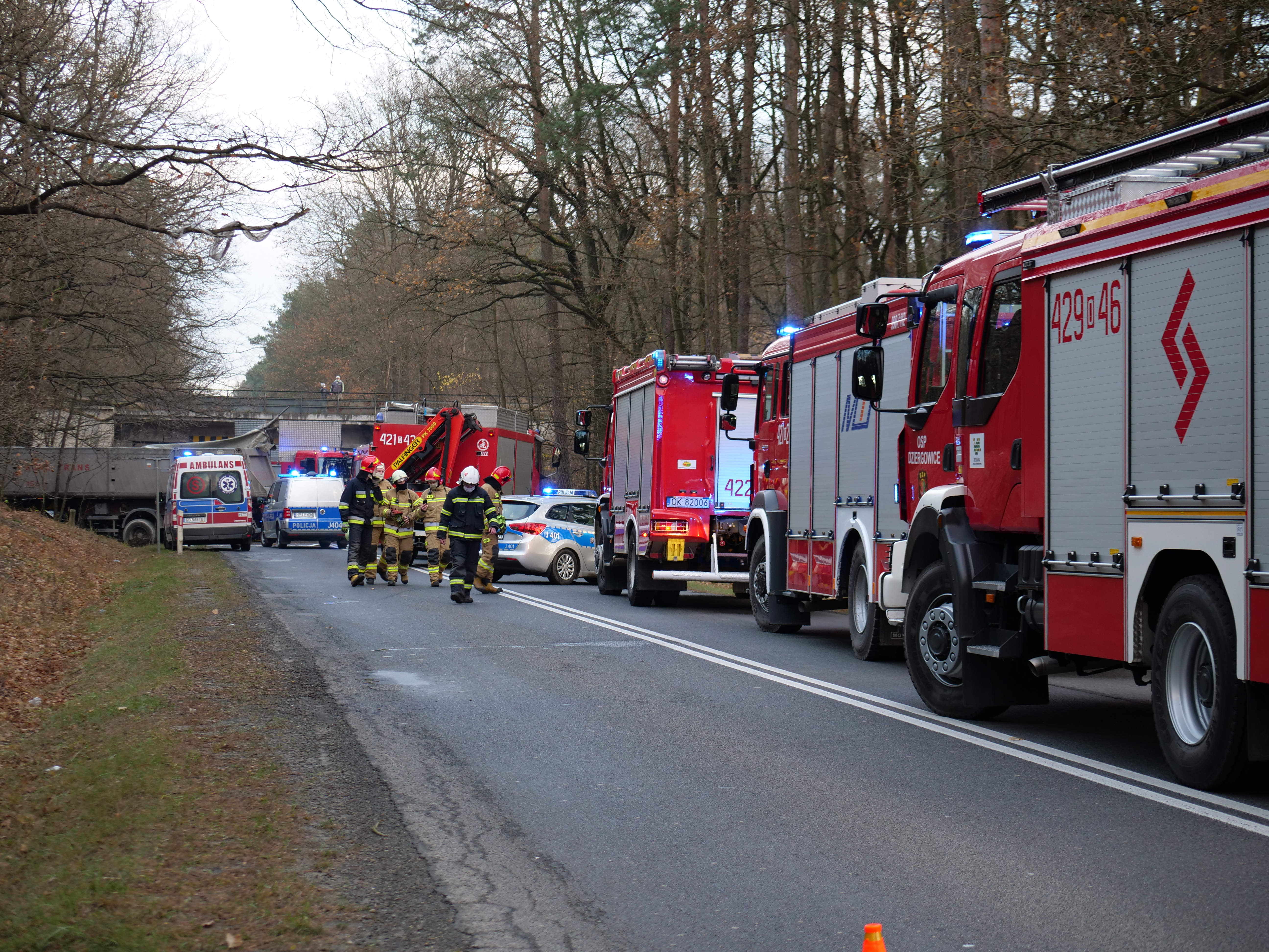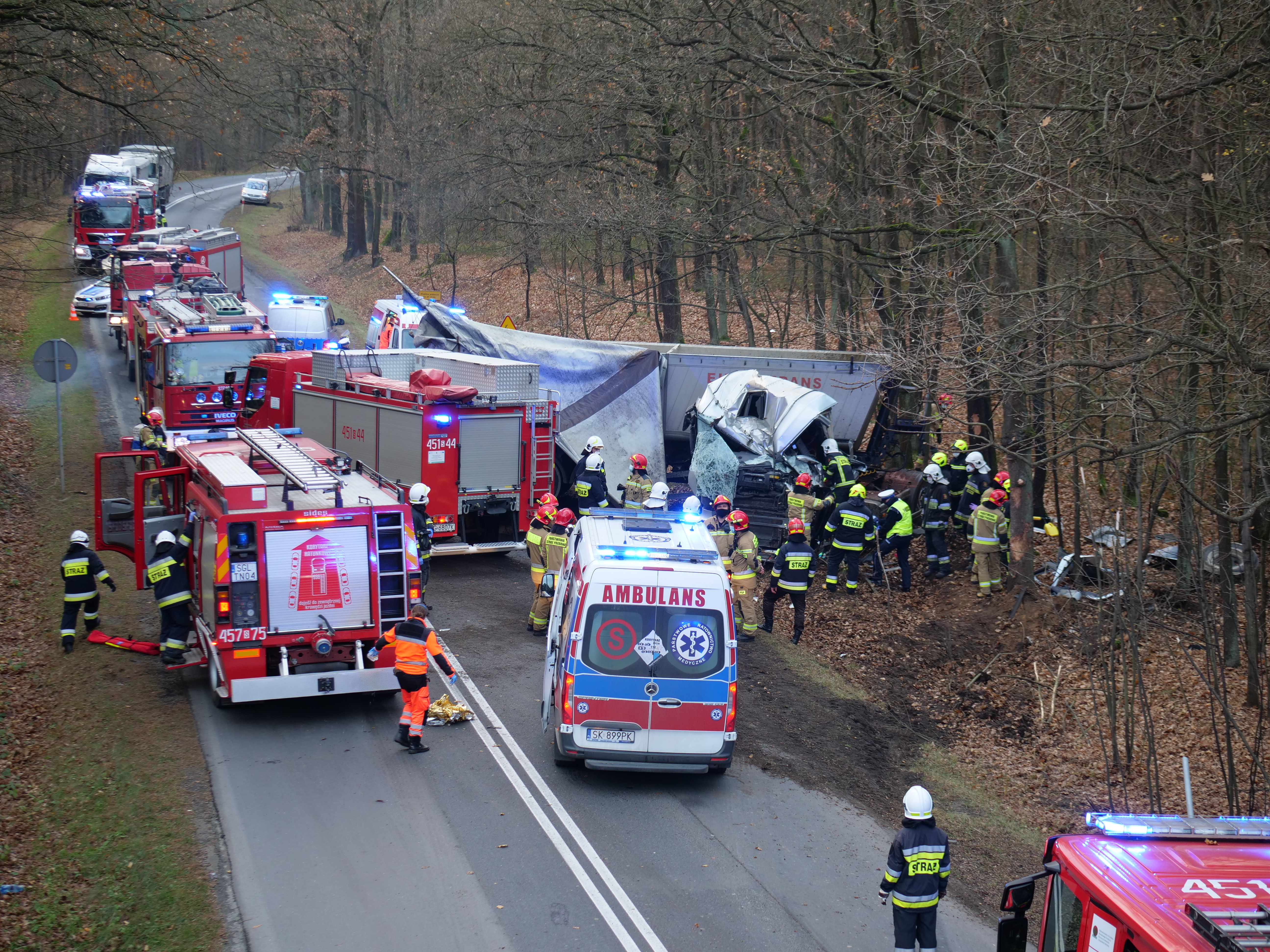 Dzisiaj około godziny 14 dyżurny SK KP odebrał zgłoszenie o wypadku samochodu ciężarowego, który zjechał z drogi i uderzył w drzewa. Na miejsce zadysponował siły i środki z JRG 1, JRG 2 oraz okolicznych OSP. Na miejscu interweniowali również strażacy z KM PSP Gliwice ze względu na granicę województw.