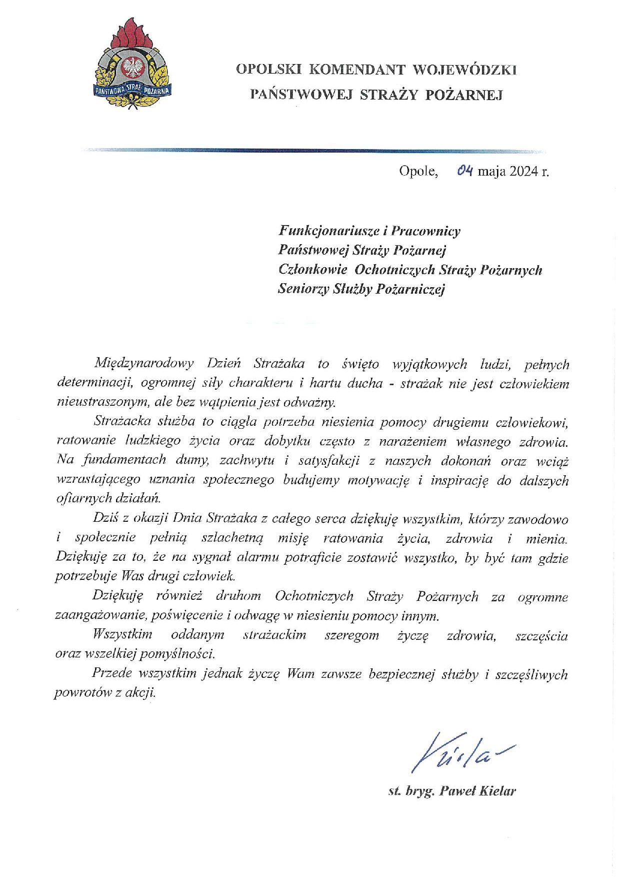 Życzenia Opolskiego Komendanta Wojewódzkiego PSP w Opolu z okazji Dnia Strażaka