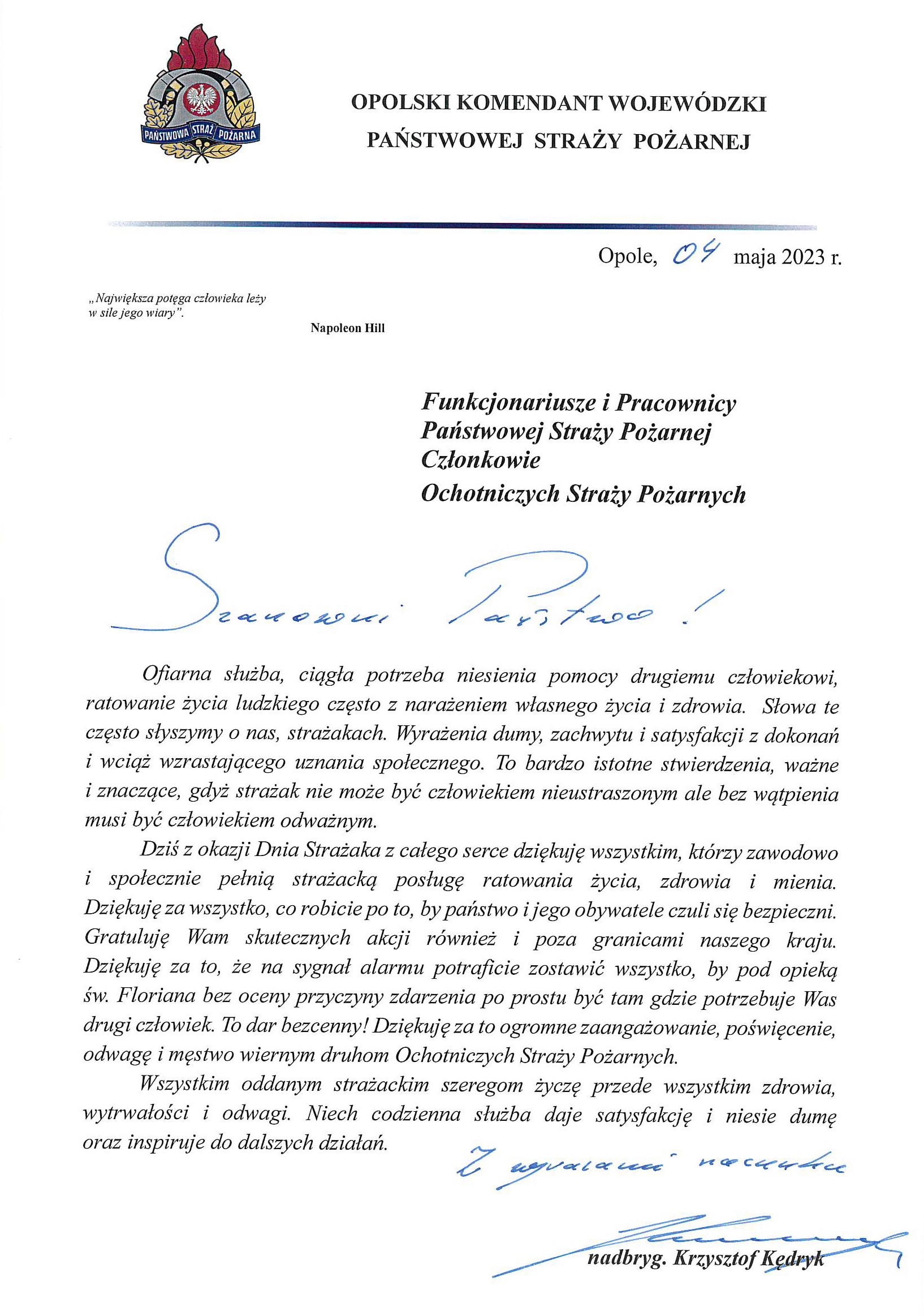 Życzenia Ministra Spraw Wewnętrznych i Administracji oraz kierownictwa Komendy Głównej Państwowej Straży Pożarnej z okazji "Dnia Strażaka 2023"