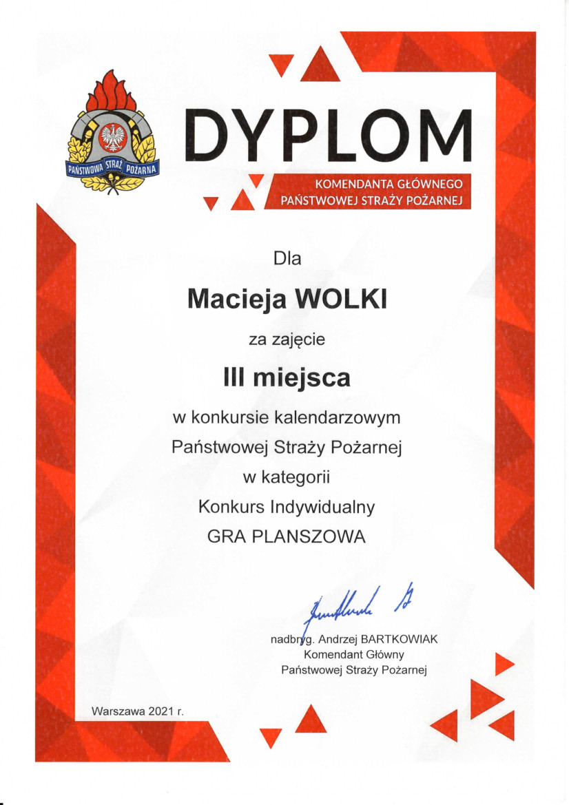 W dniu 01.09.2021 r. podczas inauguracji roku szkolnego uczniowi klasy piątej, Szkoły Podstawowej nr 2 w Kępnie im. Krzysztofa Kamila Baczyńskiego w Kępnie Maciejowi Wolko, wręczono Dyplom Komendanta Głównego Państwowej Straży Pożarnej za zajęcie III miejsca w konkursie kalendarzowym Państwowej Straży Pożarnej w kategorii "Konkurs indywidualny GRA PLANSZOWA".
